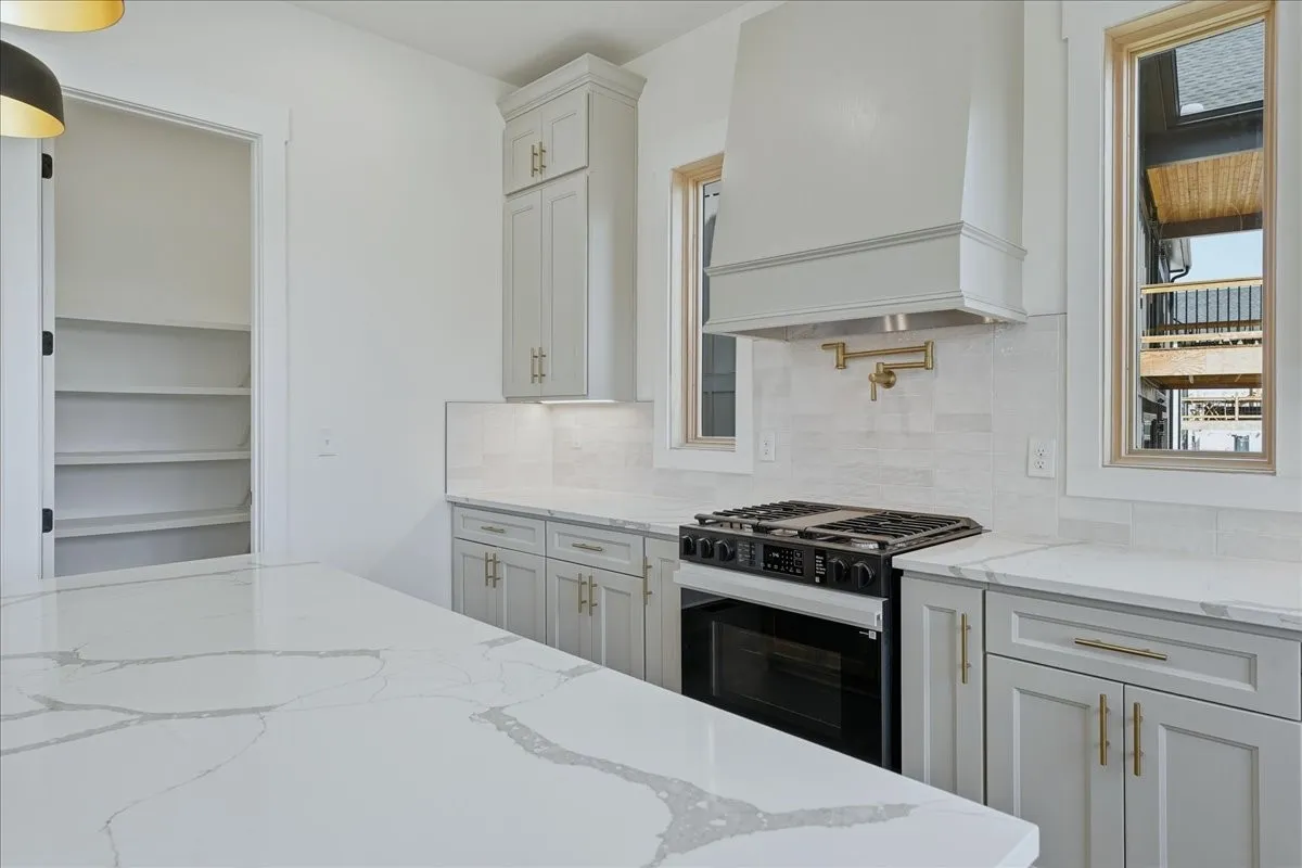 The chef’s kitchen is both beautiful and functional, featuring sleek quartz countertops, premium appliances, a pot filler, and a butler’s pantry—perfect for entertaining and everyday living alike. Designer lighting, custom trim work, and carefully curated details add timeless character to every space.