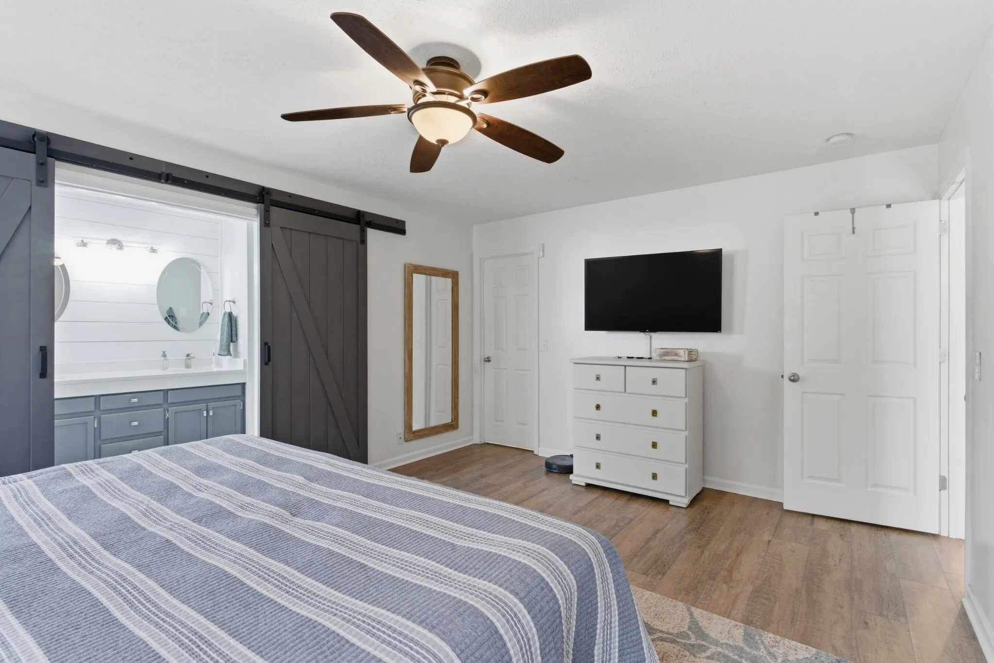 The fully renovated kitchen offers a clean, modern feel with soft-close cabinetry, quartz countertops, tile backsplash, a slide-in range, and a low-profile microwave. The layout provides excellent storage and workspace while opening naturally to the main living areas. Just off the kitchen, the eat-in area offers a convenient space for casual meals, morning coffee, or gathering with family and friends. The primary suite is located on the main level and has been refreshed with a full bathroom remodel featuring a large walk-in shower with frameless glass, quartz countertops, and an expanded closet that provides excellent storage. Upstairs, a flexible loft overlooks the living room below and can easily function as a home office, playroom, workout area, or additional living space. Two comfortable guest bedrooms with walk-in closets complete the floor plan. Extra closets/storage spaces are found throughout the home!