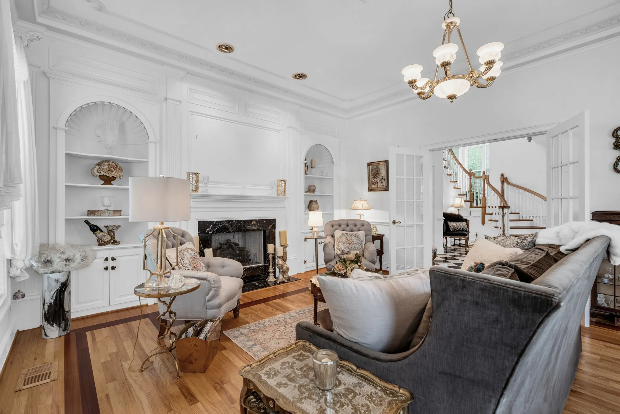 A quarter-mile concrete driveway winds through open pasture and leads to the stately residence. Inside you’ll find hardwood floors, black marble tile, rich custom trim, and a grand staircase entry. The library features a hand-engraved tin ceiling, and stained and leaded glass windows add unique character throughout the home.