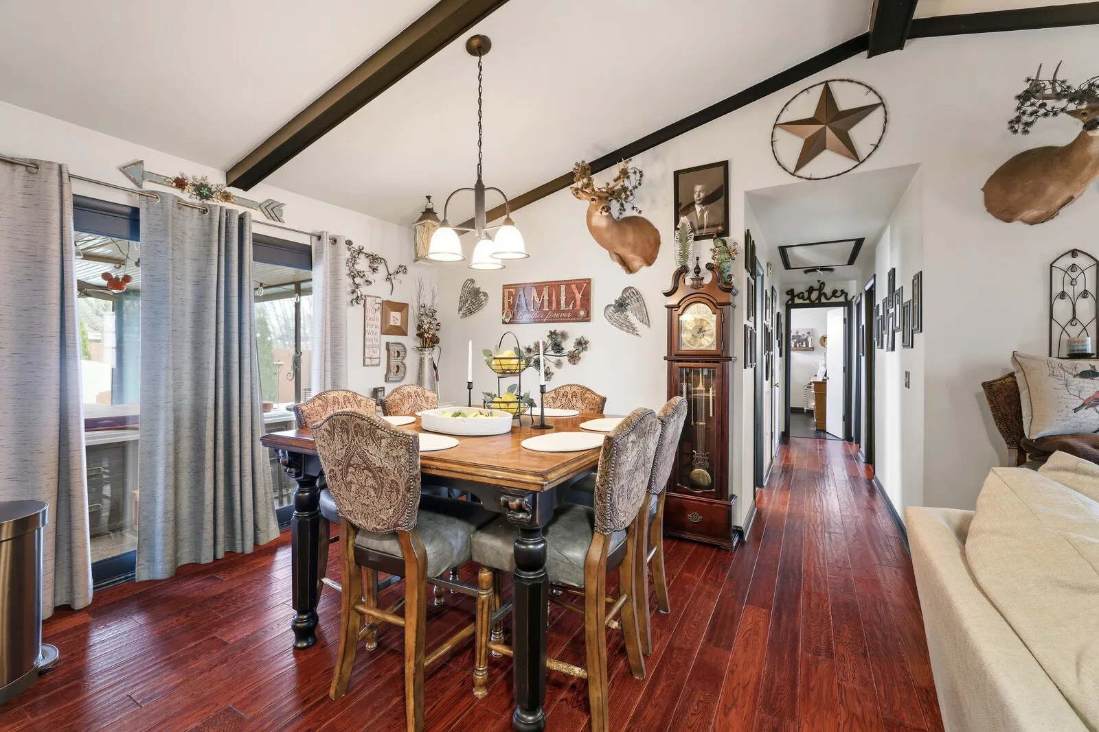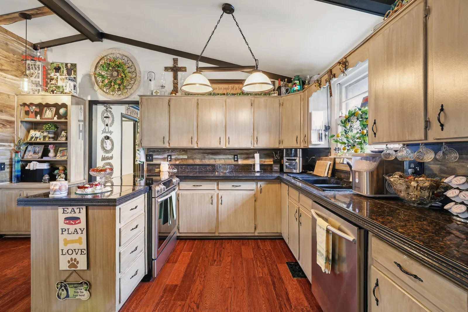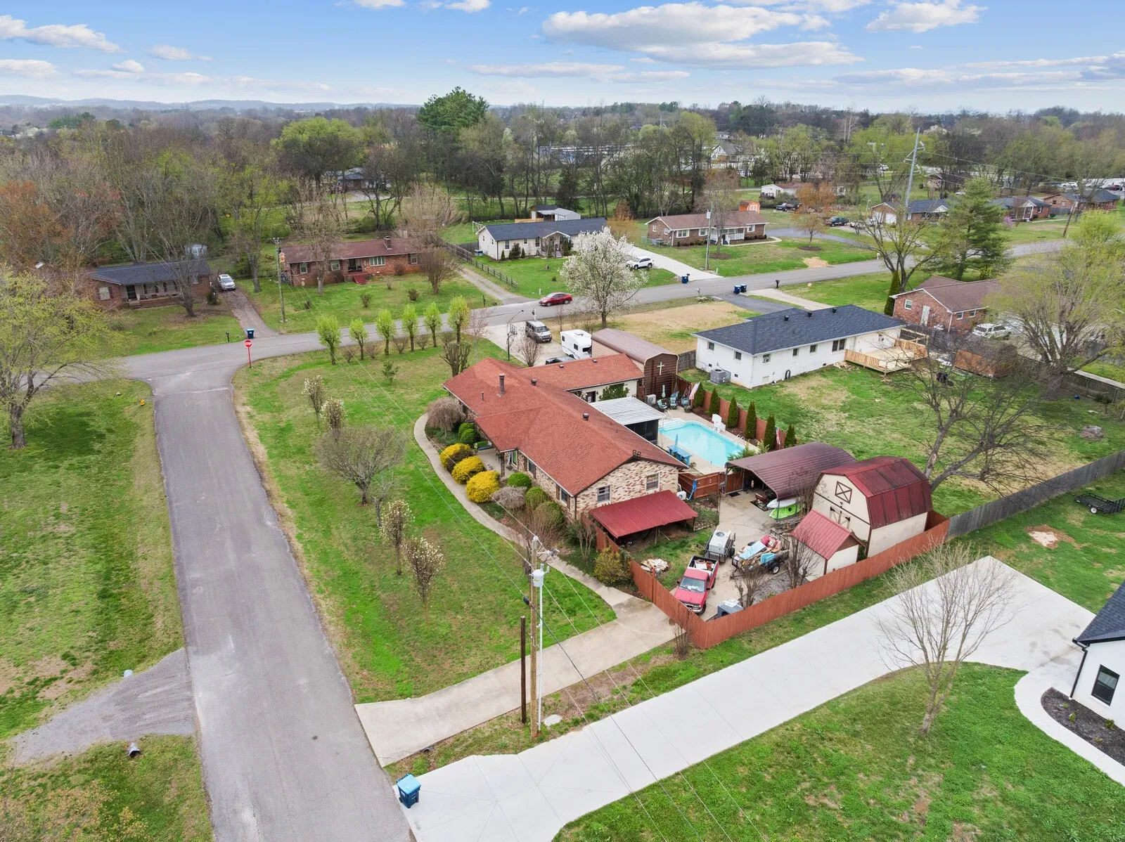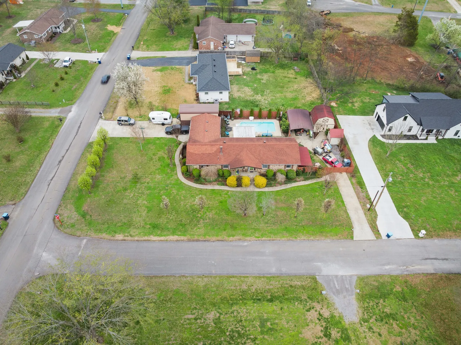 This 3-bedroom, 2.5-bath home offers 1,905 square feet of versatile living space on a spacious 0.44-acre corner lot with exceptional indoor and outdoor amenities. Designed for both comfort and functionality, the home features an open-concept living, dining, and kitchen area highlighted by exposed ceiling beams and a warm brick fireplace that anchors the living room. The kitchen includes granite countertops, excellent storage, and all appliances convey with the home, making it move-in ready. The primary bedroom features a private en-suite bathroom, while the additional bedrooms provide flexibility for family, guests, or home office space. A rec room just off the heated and cooled two-car attached garage adds even more living space for hobbies, entertainment, or a home gym. Step outside to enjoy a true backyard retreat complete with an in-ground swimming pool, hot tub, and screened-in porch, perfect for relaxing or entertaining. Privacy trees and fencing create a peaceful setting, while two driveways and additional covered parking offer plenty of convenience. The property also includes three external buildings, providing outstanding flexibility. One outbuilding features a half bath and currently serves as a dance studio or exercise space with a lofted second level for additional storage. A 16×16 shed with upstairs storage and an additional 8×8 storage shed offer even more room for tools, equipment, or hobbies. With a new HVAC system, abundant storage, multiple functional spaces, and incredible outdoor features, this property offers a unique blend of comfort, recreation, and versatility. Up to 1% lender credit on the loan amount when buyer uses Seller’s Preferred Lender.