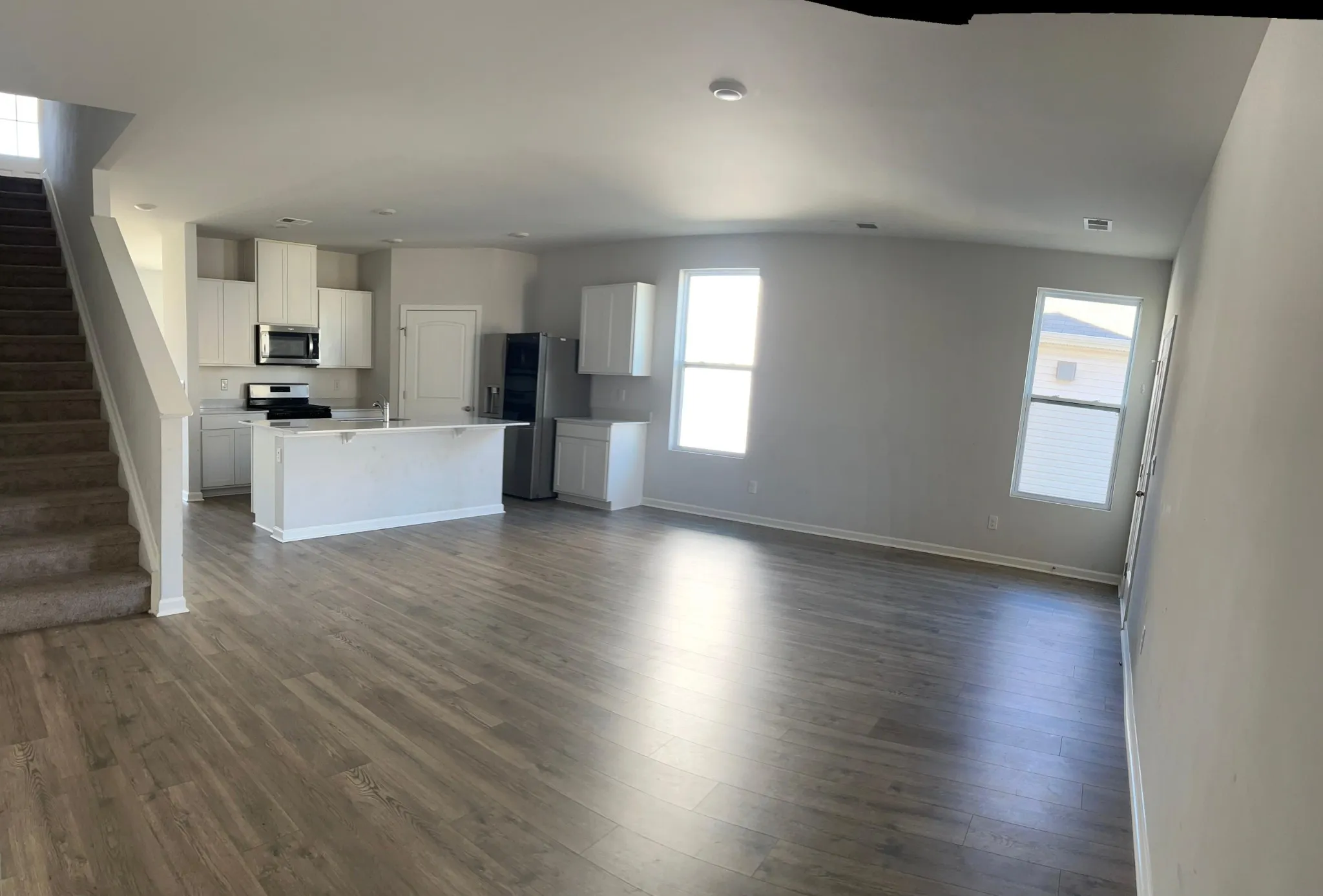 The home features two primary suites, one conveniently located on the main level and another upstairs. Enjoy a huge living room perfect for gatherings, a large loft area upstairs ideal for a second living space or family room, and a modern kitchen with stainless steel appliances and granite countertops.