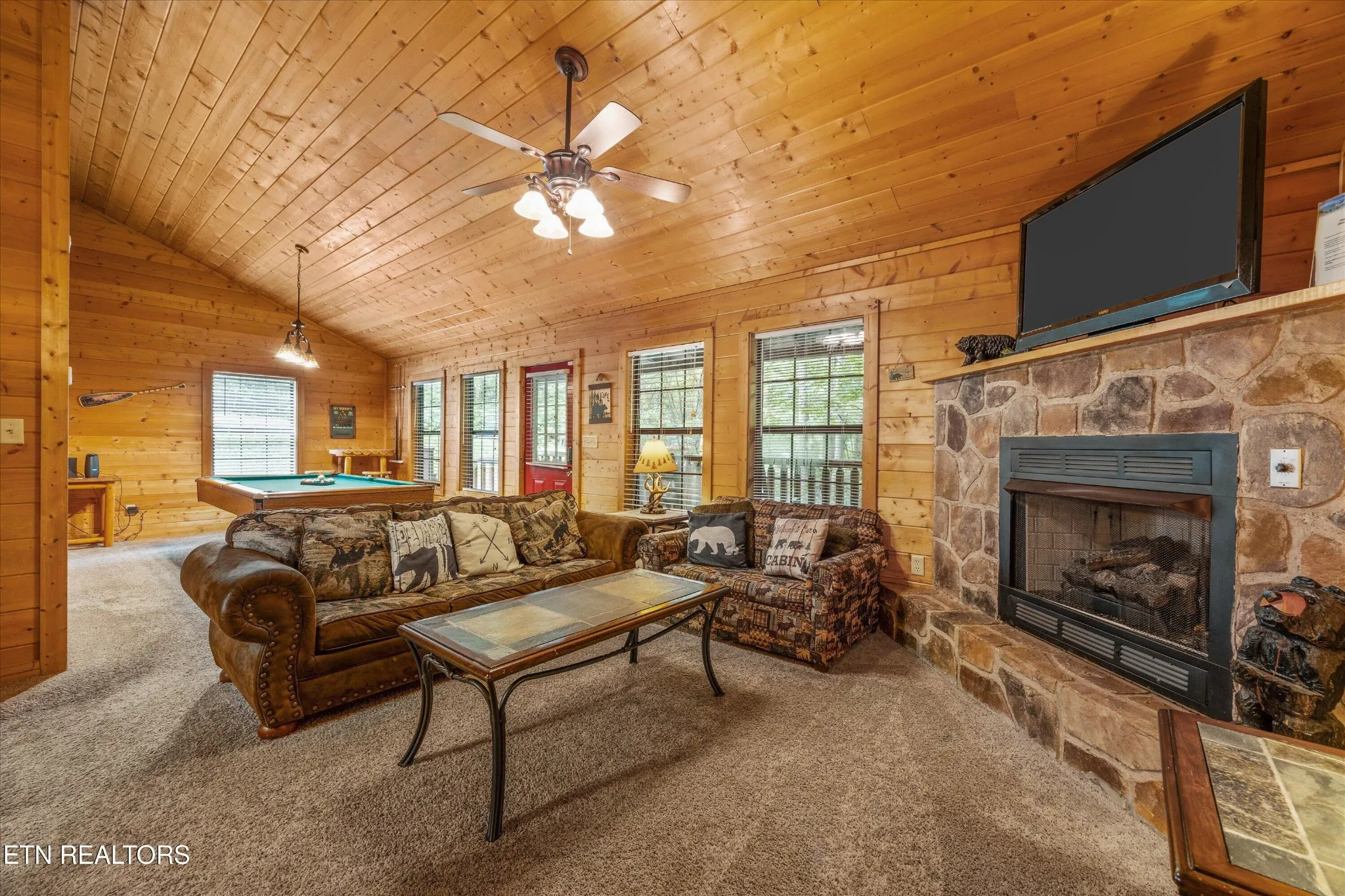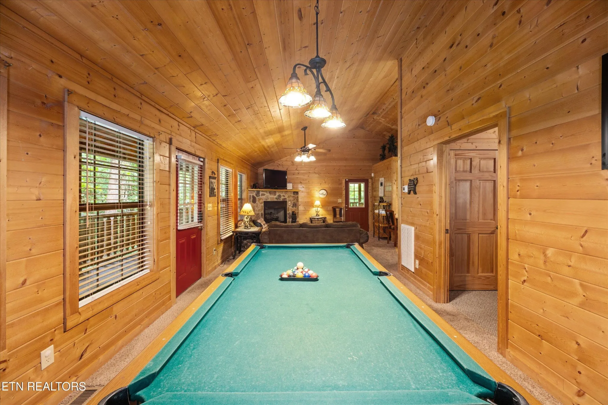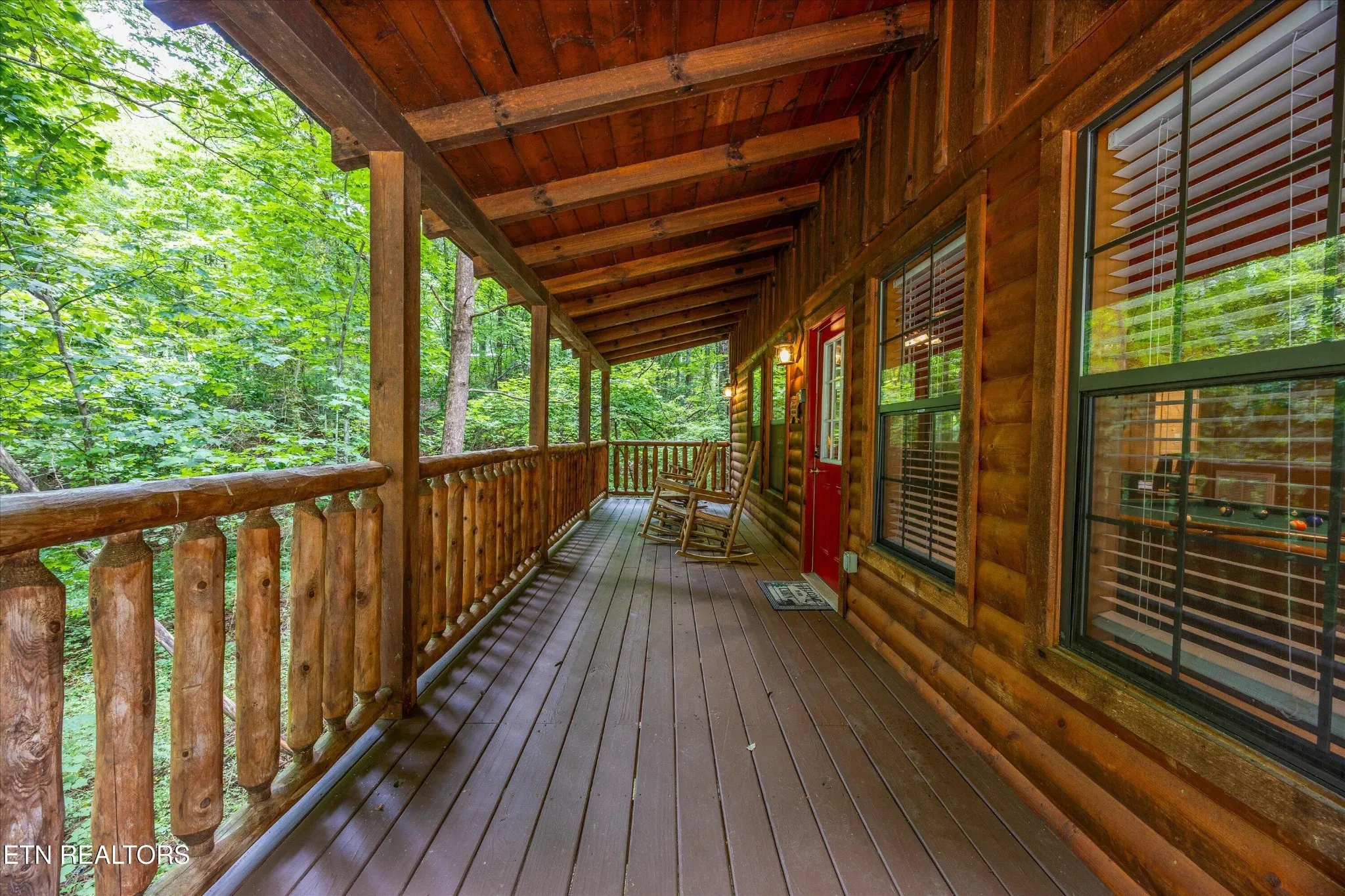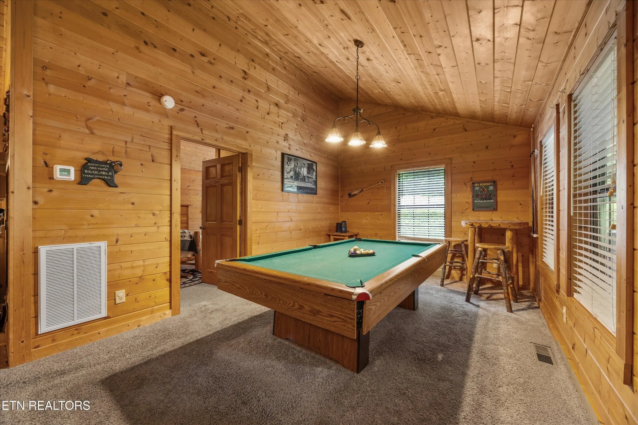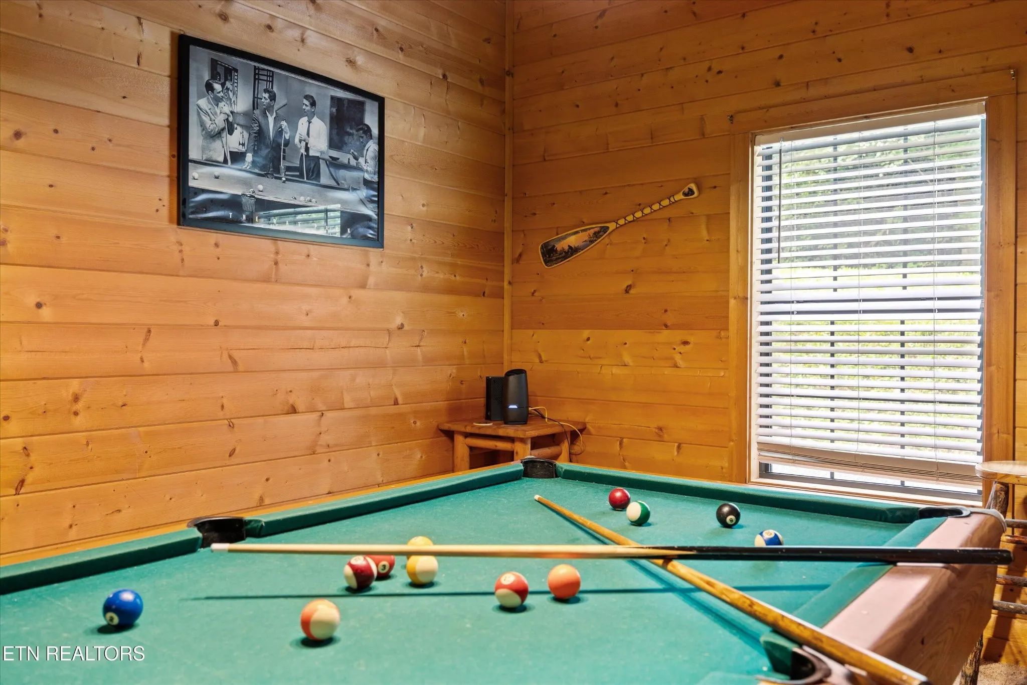 Perfect for couples and honeymooners, this cozy getaway is filled with personality. Challenge your sweetheart to a game of pool with the ‘Rat Pack’ looking on from their spot above the table — it’s a playful touch that guests adore. Out back, the private deck is all about relaxation, featuring a bubbling hot tub surrounded by nothing but peaceful wooded views.