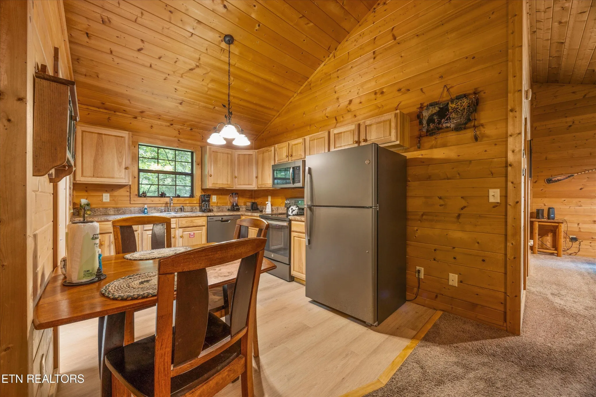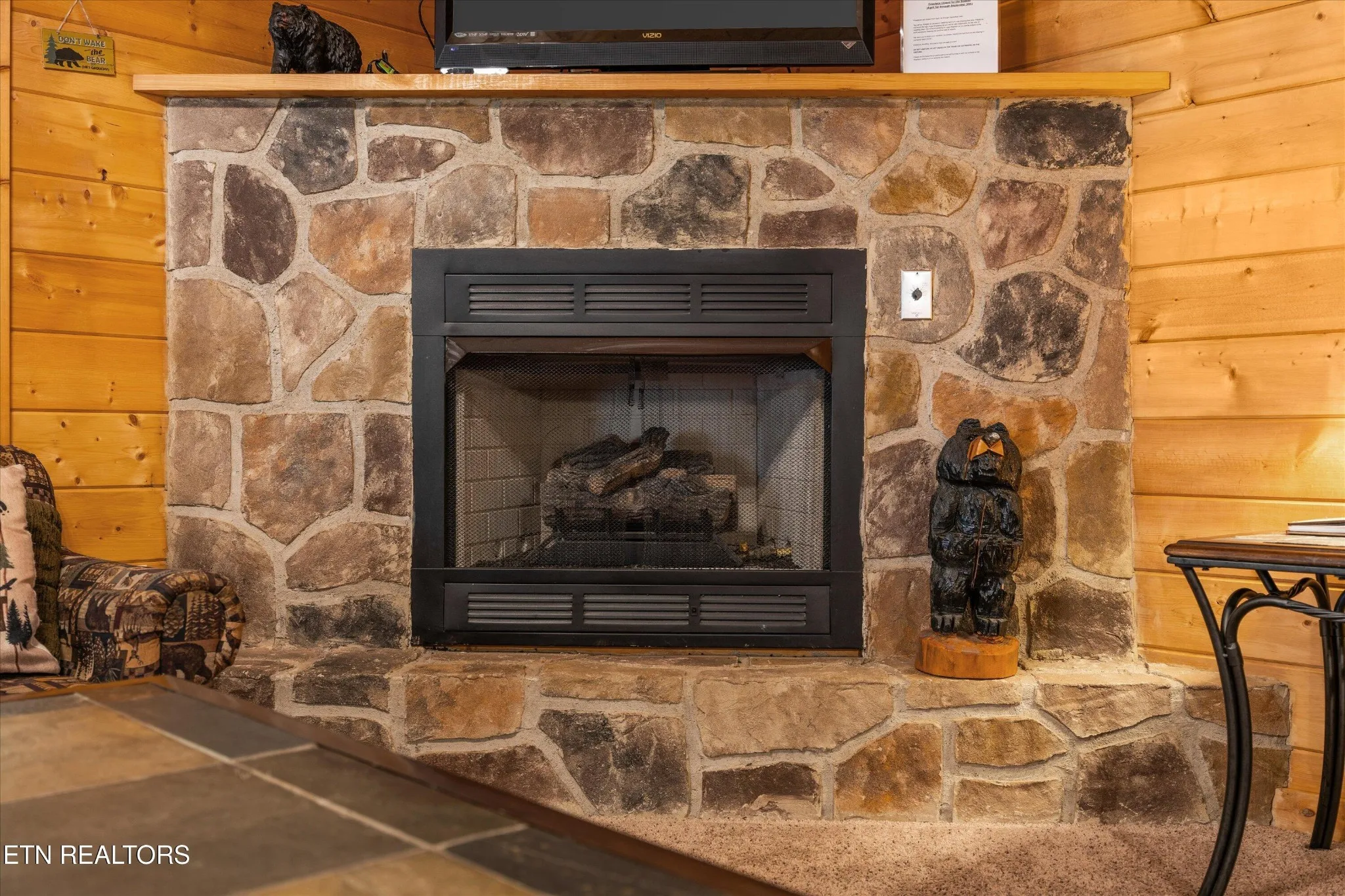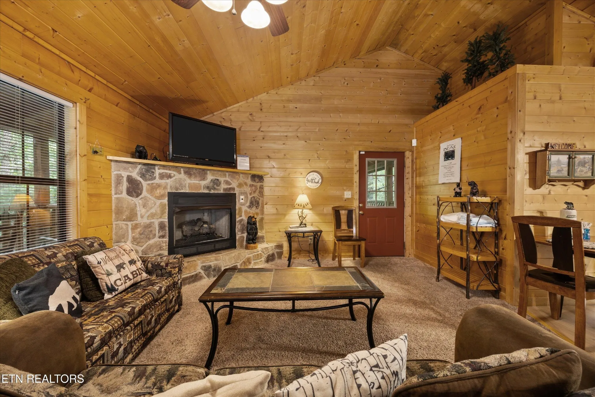 Welcome to Absolutely Bearable — the charming bear-themed cabin in the Sky Harbor subdivision that’s as cute as its name! From the moment you arrive, you’ll be greeted by the wooden bears peeking over the roof at the entrance and the two more keeping watch along the side of the cabin. Freshly graveled parking makes for an easy arrival a long with seeing the recently stained cabin and deck, and once inside, you’ll notice the kitchen and bathroom/laundry room have brand new flooring for a fresh, updated feel.