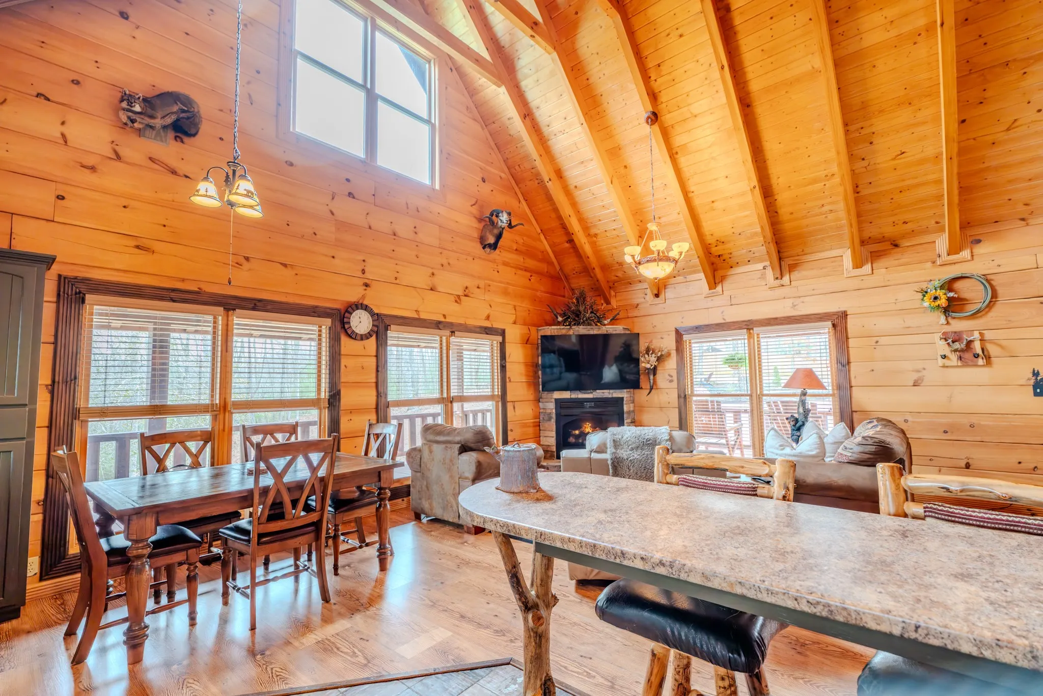 Escape to your private Tennessee paradise–a rare retreat with two cabins for a combined 3500+ sq ft! This property boasts over six acres, featuring a main cabin with over 2500 sq ft, 3 beds and 3 baths. The additional cabin is just over 1,000 sq ft, sleeps 3, and has 1 full bath! The proximity is great, being a short drive or hike away from Big South Fork and only minutes away from town! Nestled on a serene, wooded lot in the heart of Oneida! This one-of-a-kind property delivers the ultimate blend of peaceful seclusion, natural beauty, and income-producing versatility–all while being just minutes from the Tennessee’s trails, rivers, and scenic wonders of Big South Fork National River and Recreation Area. Surrounded by nature at every turn, this fully furnished gem features two charming cabins and a well-kept four-stall barn. It’s perfect for animal lovers, outdoor enthusiasts, savvy investors, multi-generational families, or anyone dreaming of their own slice of Tennessee living. Step inside the spacious main cabin and be instantly captivated by the dramatic open-concept great room. Its soaring cathedral ceilings flood the space with light, creating an inviting and welcoming feel. Complete with three generous bedrooms and three full baths, this home is move-in ready and ideal for comfortable everyday living or hosting friends and family. This home has been meticulously maintained, with a newly installed 2-stage, high efficiency, variable speed HVAC system! Just steps away sits the cozy guest house / in-law quarters–a warm, inviting retreat with two bedrooms, one bath, and a beautiful natural wood-burning fireplace that sets the mood for relaxing evenings.