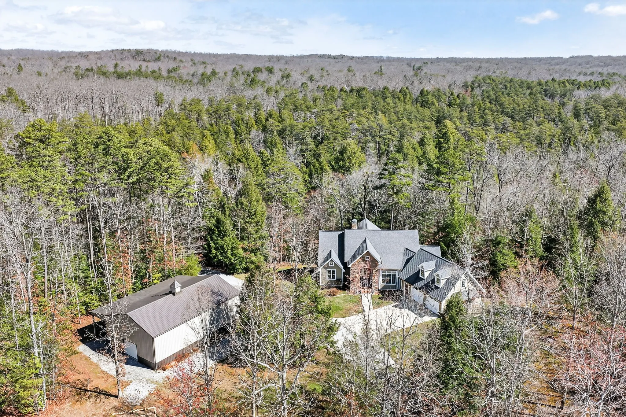 Newly upgraded and impossible to replicate—this one-of-a-kind luxury estate on 5 private, wooded acres features a brand-new elevator and private next-gen suite added within the past year. Overlooking a scenic creek and natural caves, the home blends high-end finishes with thoughtful design throughout. Anderson windows & doors flood the space with natural light. The gourmet eat-in kitchen includes premium appliances, double ovens, gas cooktop, prep island with sink & breakfast bar, and a wine bar. Enjoy seamless indoor-outdoor living with a covered deck and stunning views. The great room features a floor-to-ceiling stone gas fireplace, coffered ceilings, and a dramatic wall of windows. The finished lower level offers a theater and utility room. 5 bedrooms (3-bedroom septic permit). 30×50 workshop included.