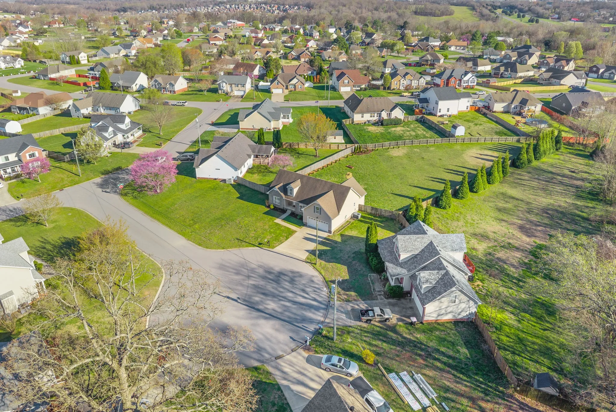 Garden lovers’ paradise! This contemporary home at the end of a cul-de-sac with a brick front exterior features 3 bedrooms and 2 full baths on the main floor, with a bonus room over the 2-car garage. Situated on an expansive, fully fenced .68-acre lot, soak in sunset from your freshly stained deck overlooking your orchard garden oasis, which features 41 trees including fruit trees (nectarine, apricot, and apple), blueberry and blackberry bushes, a pumpkin patch, landscaped flower beds, and so much more. Conveniently located off Meriwether Rd between Exits 1 and 4 with an easy commute to Fort Campbell, Austin Peay State University, and downtown Clarksville, plus nearby schools, shopping, and entertainment, this location is a 10 out of 10. Fresh paint and new flooring complement the spacious open floor plan drenched in natural light throughout. The main-level primary suite offers a walk-in closet and bath with dual vanity, separate shower, and soaking tub. The eat-in kitchen provides ample counter and freshly varnished cabinets, complemented by a formal dining room that could double as an office space. All kitchen appliances including upgraded stainless steel refrigerator as well as washer and dryer stay, making your move in a breeze. Located in the desirable Spring Creek Estates subdivision with no HOA! This one will not last long, schedule your showing today!