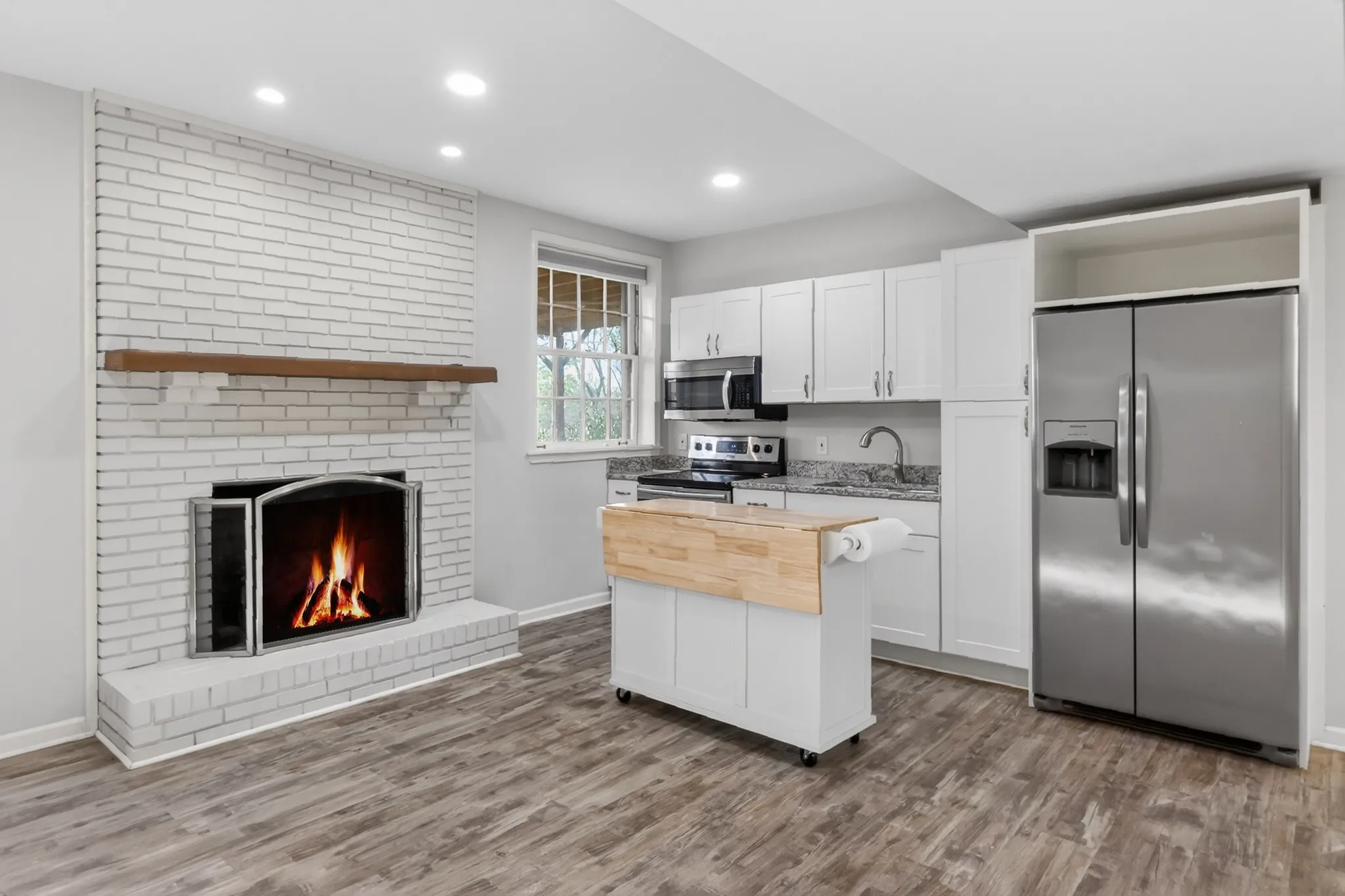 The fully renovated lower level creates an incredibly inviting second living space. It includes a cozy living area with fireplace, a kitchenette, a large bedroom with walk-in closet, and a beautiful bathroom featuring a tiled shower. With its own functional living setup and two full-size garage bays, this level provides excellent flexibility for guests, extended family, or rental use.