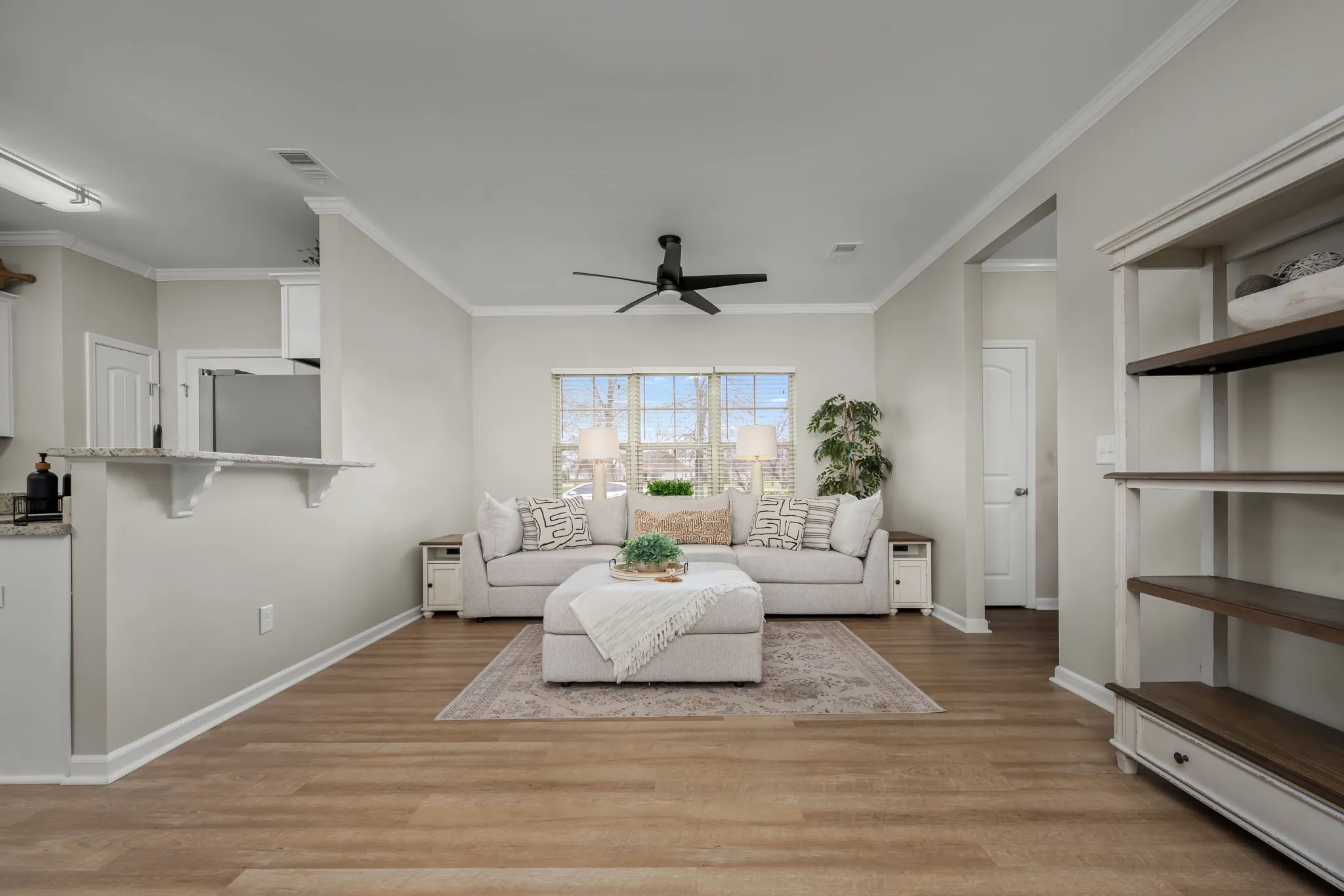 This charming 3-bedroom, 2.5-bath zero-lot home sits on a desirable corner lot. The primary suite is conveniently located on the main level, with an open living room featuring a cozy gas log fireplace. Crown molding adds elegance to the kitchen, living room, and foyer, complemented by updated light fixtures. The covered patio connects to the two-car garage, with a vinyl privacy fence and a sidewalk leading to the patio. Upstairs offers two additional bedrooms and walk-in attic storage, with extra insulation added for energy efficiency. Prime location with easy access to the interstate, restaurants, and shopping, plus a community pool for added enjoyment!