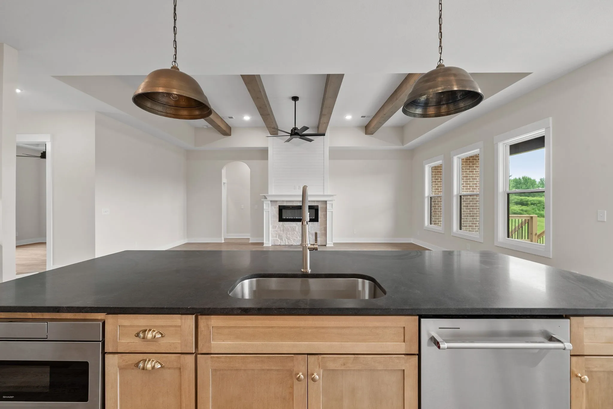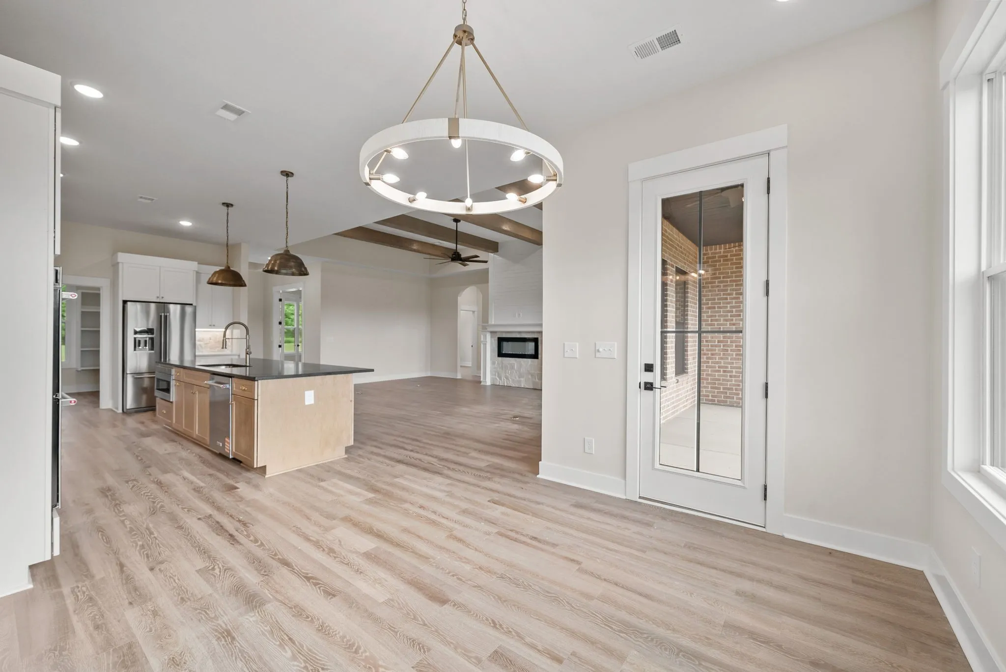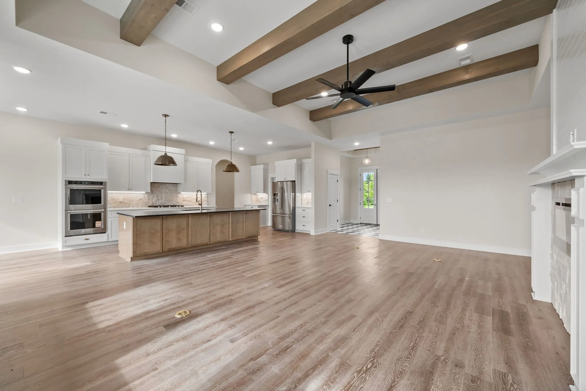 This thoughtfully designed ranch-style floorplan features an open-concept layout with a spacious living area, fireplace, vaulted ceilings with decorative beams, and large windows that bring in abundant natural light. The kitchen is designed for both function and gathering, featuring a large island, quality cabinetry, premium finishes, and an oversized walk-in pantry with solid shelving.