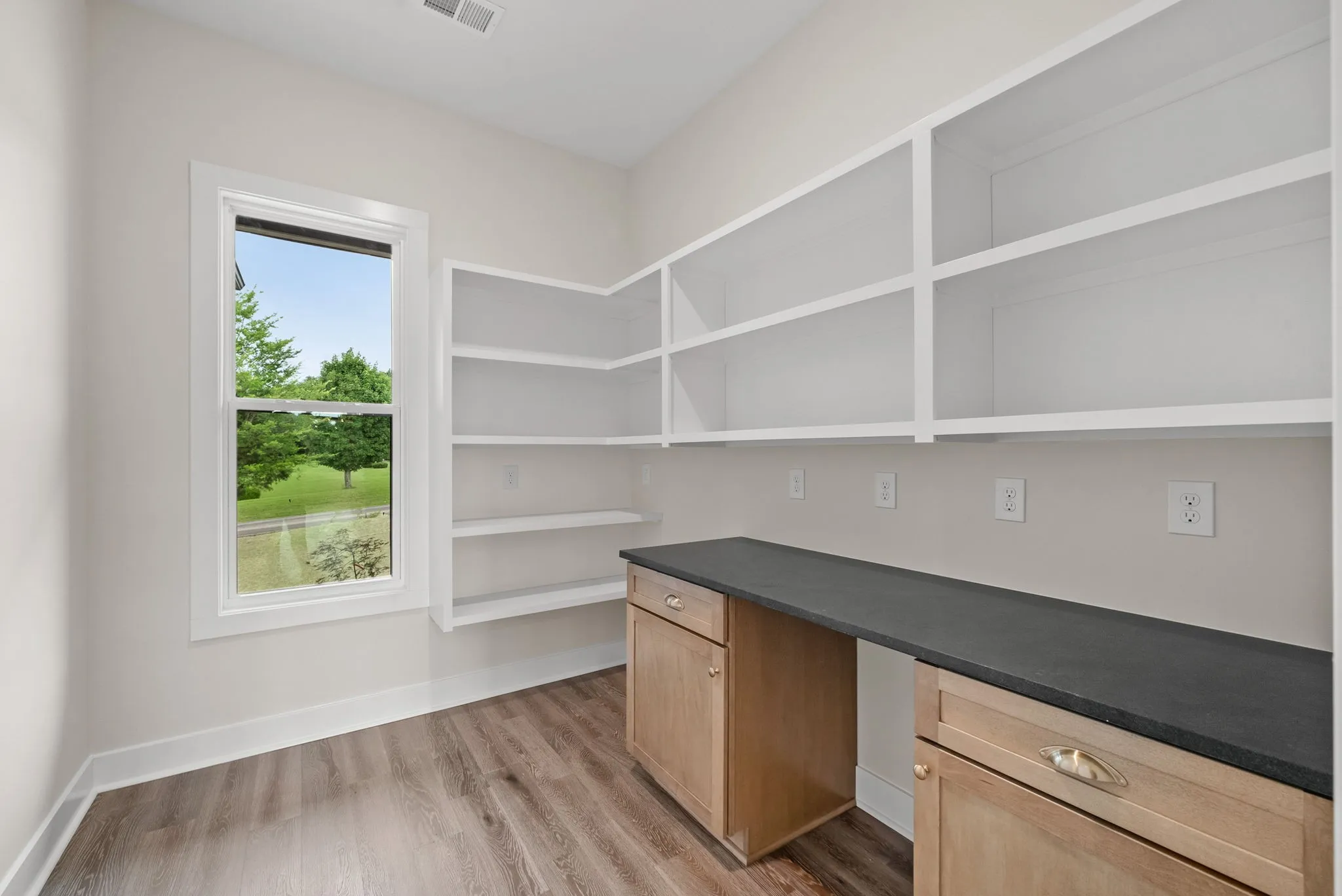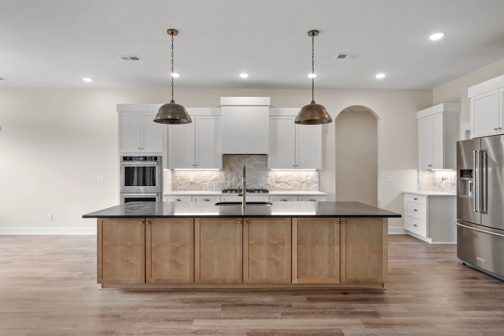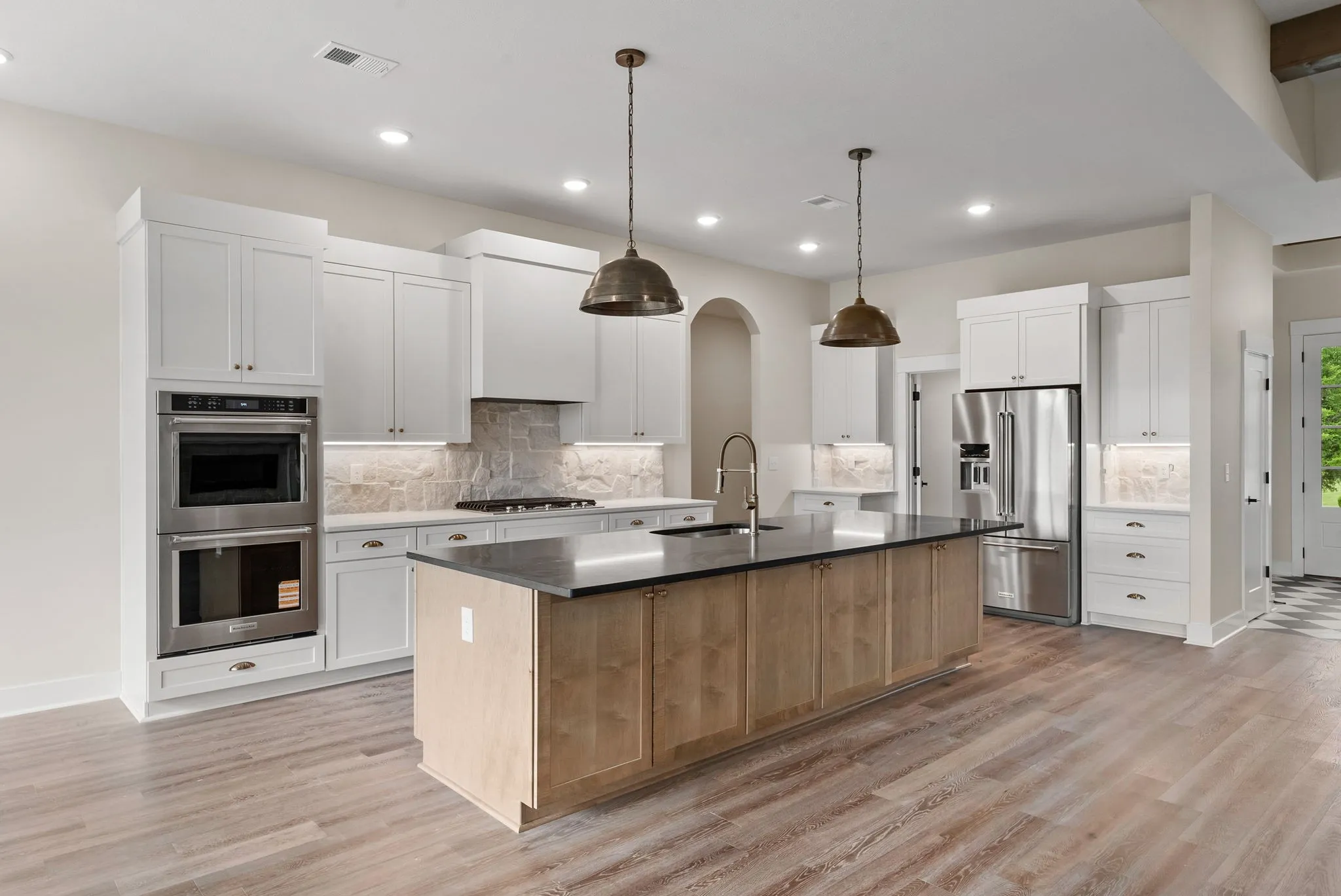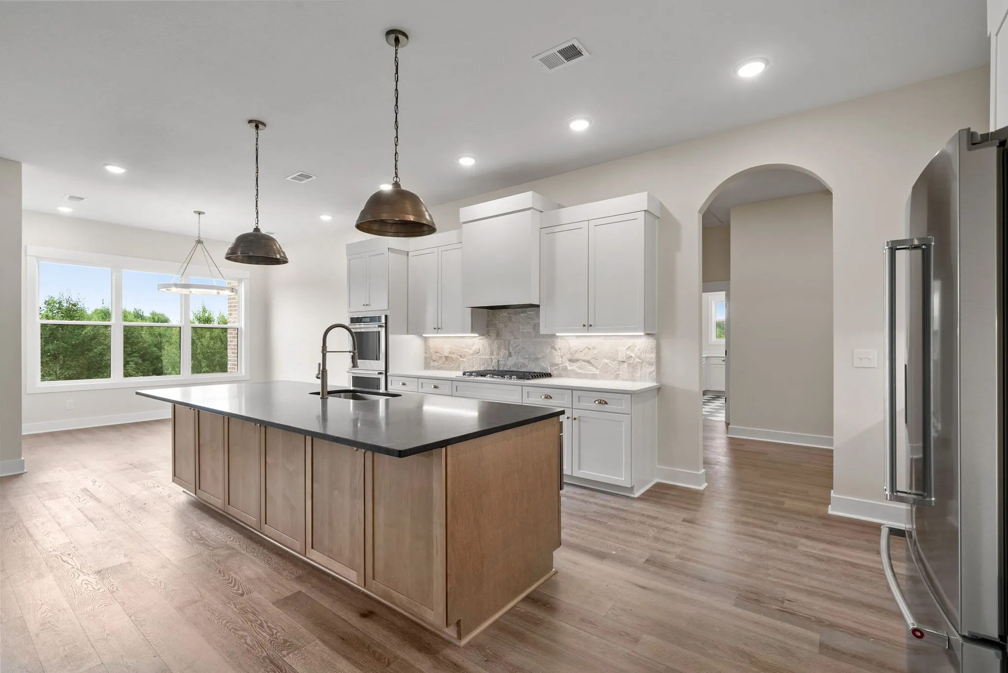 This thoughtfully designed ranch-style floorplan features an open-concept layout with a spacious living area, fireplace, vaulted ceilings with decorative beams, and large windows that bring in abundant natural light. The kitchen is designed for both function and gathering, featuring a large island, quality cabinetry, premium finishes, and an oversized walk-in pantry with solid shelving.