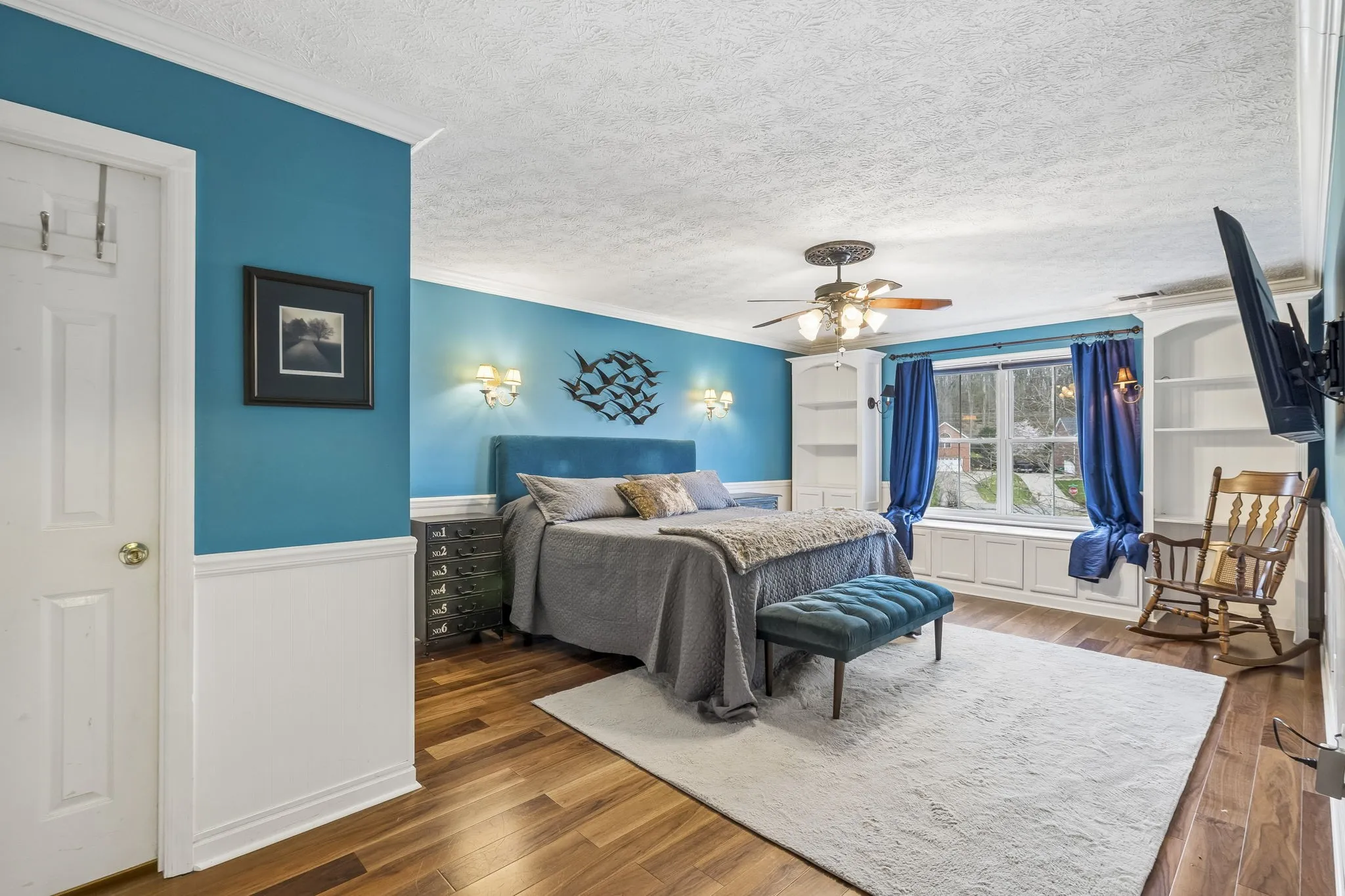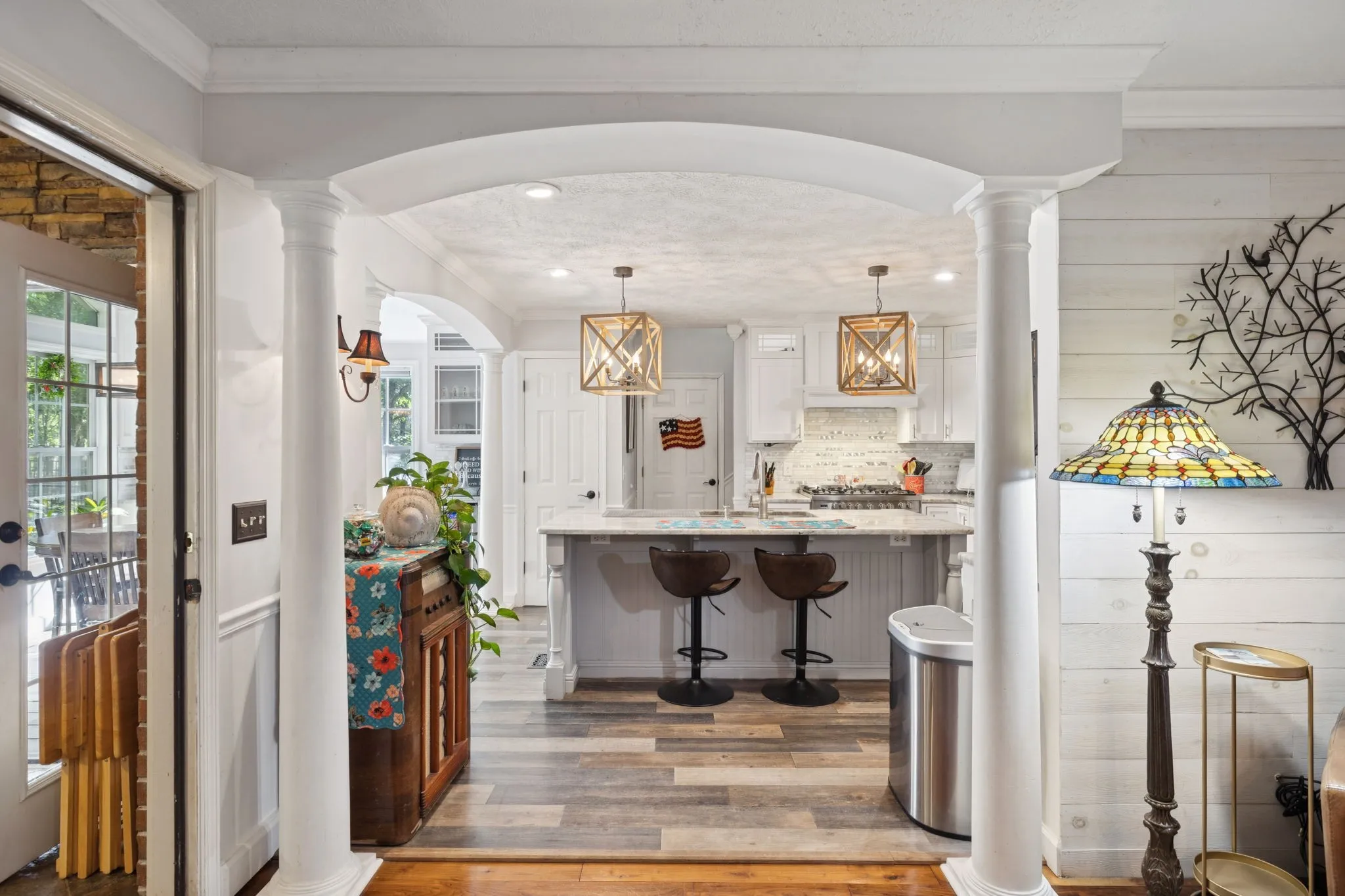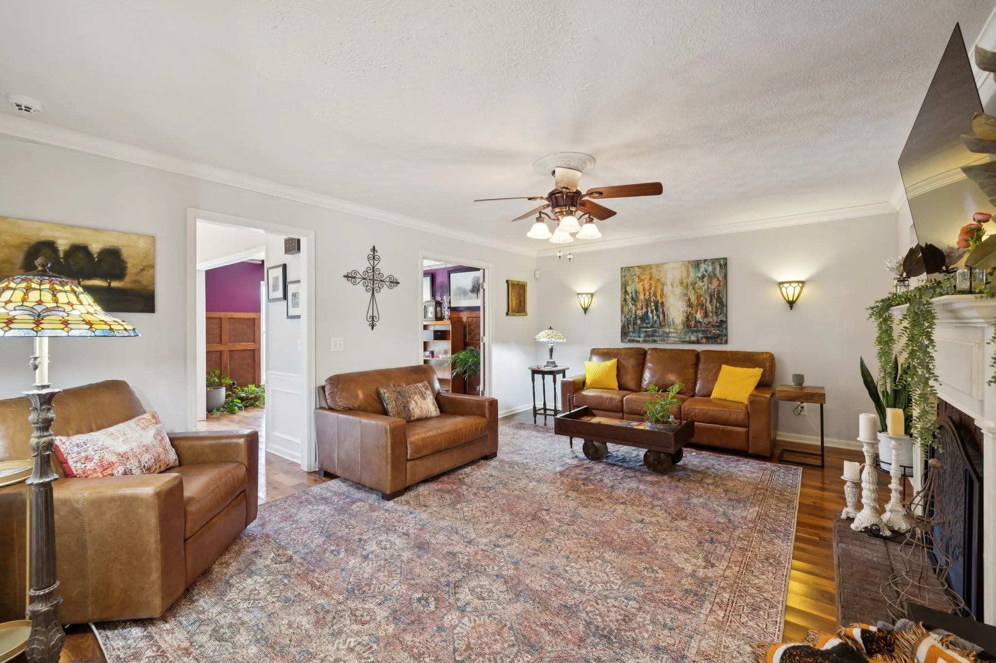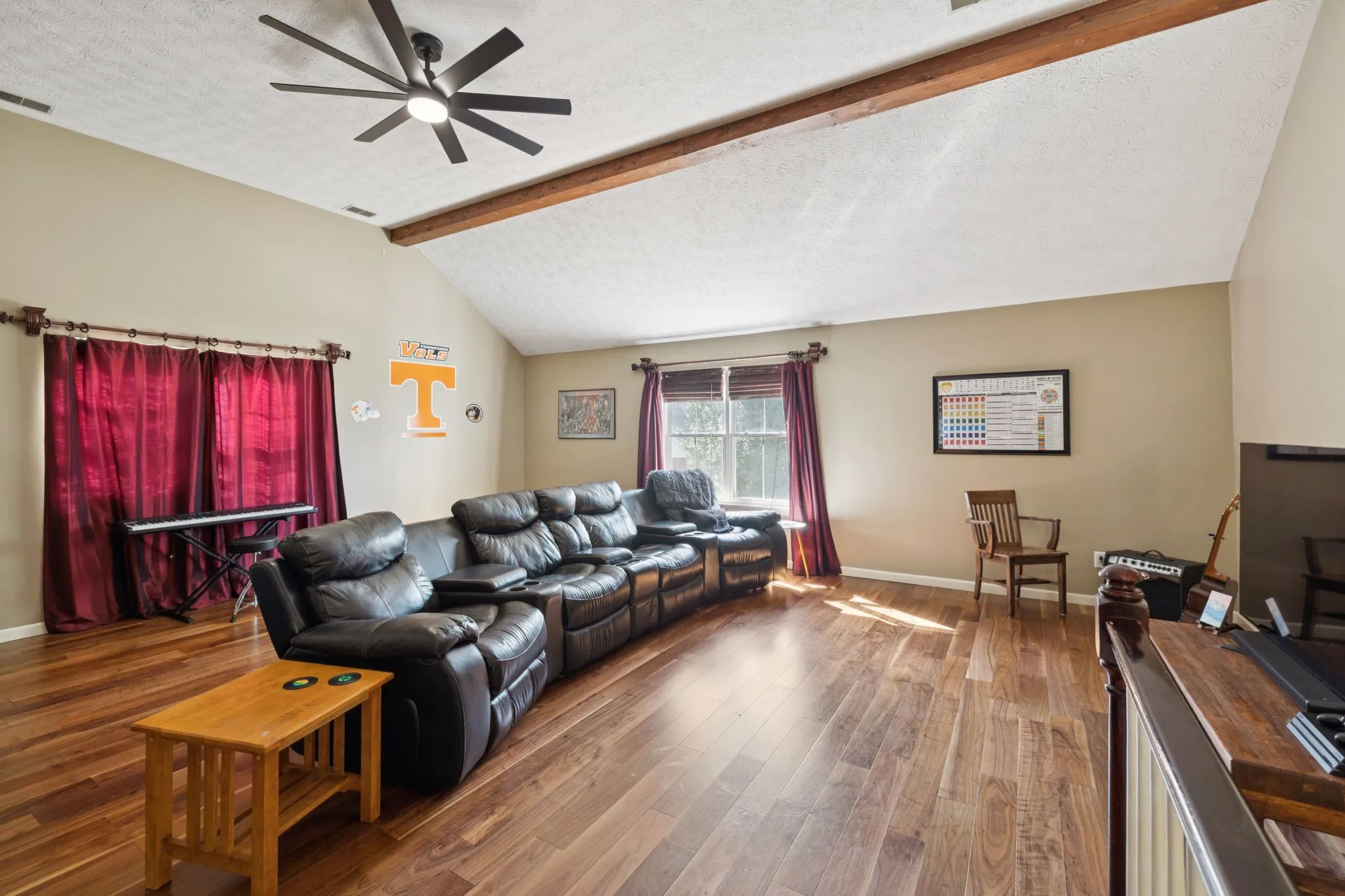 Inside, you’ll find walnut hardwood floors, custom crown molding, and detailed trimwork that add character and warmth throughout the home. The flexible floor plan includes multiple living areas—a cozy den, bright sunroom, spacious bonus room with vaulted ceilings, and a private office with French doors perfect for working from home.