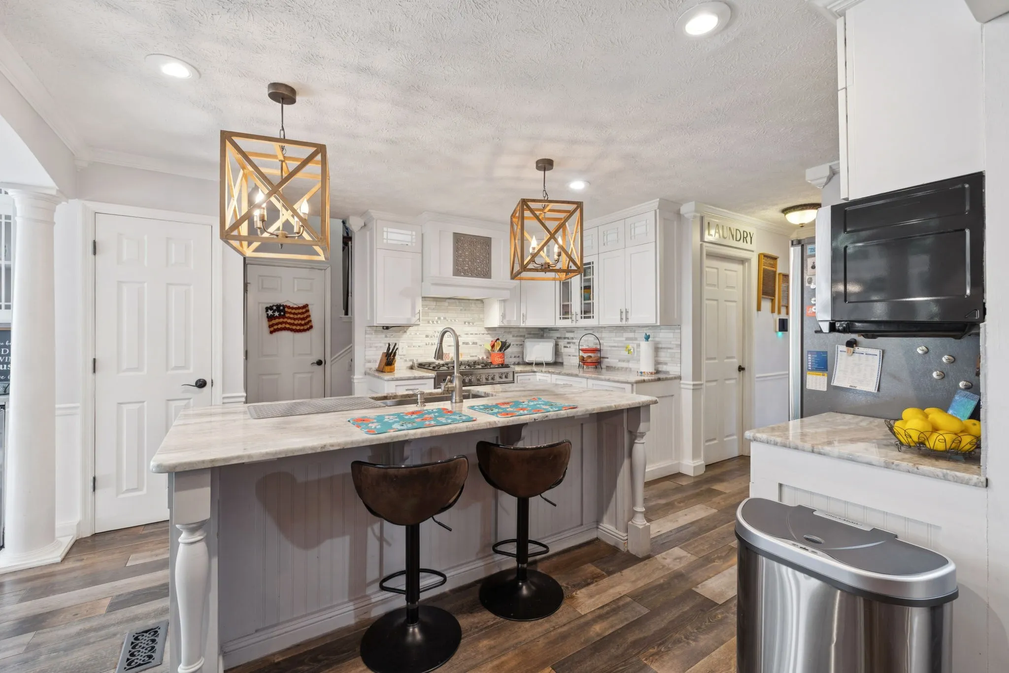 The kitchen is designed for both function and style, featuring a large island, quartzite countertops, custom oak cabinetry, stainless steel appliances, and a six-burner gas range.