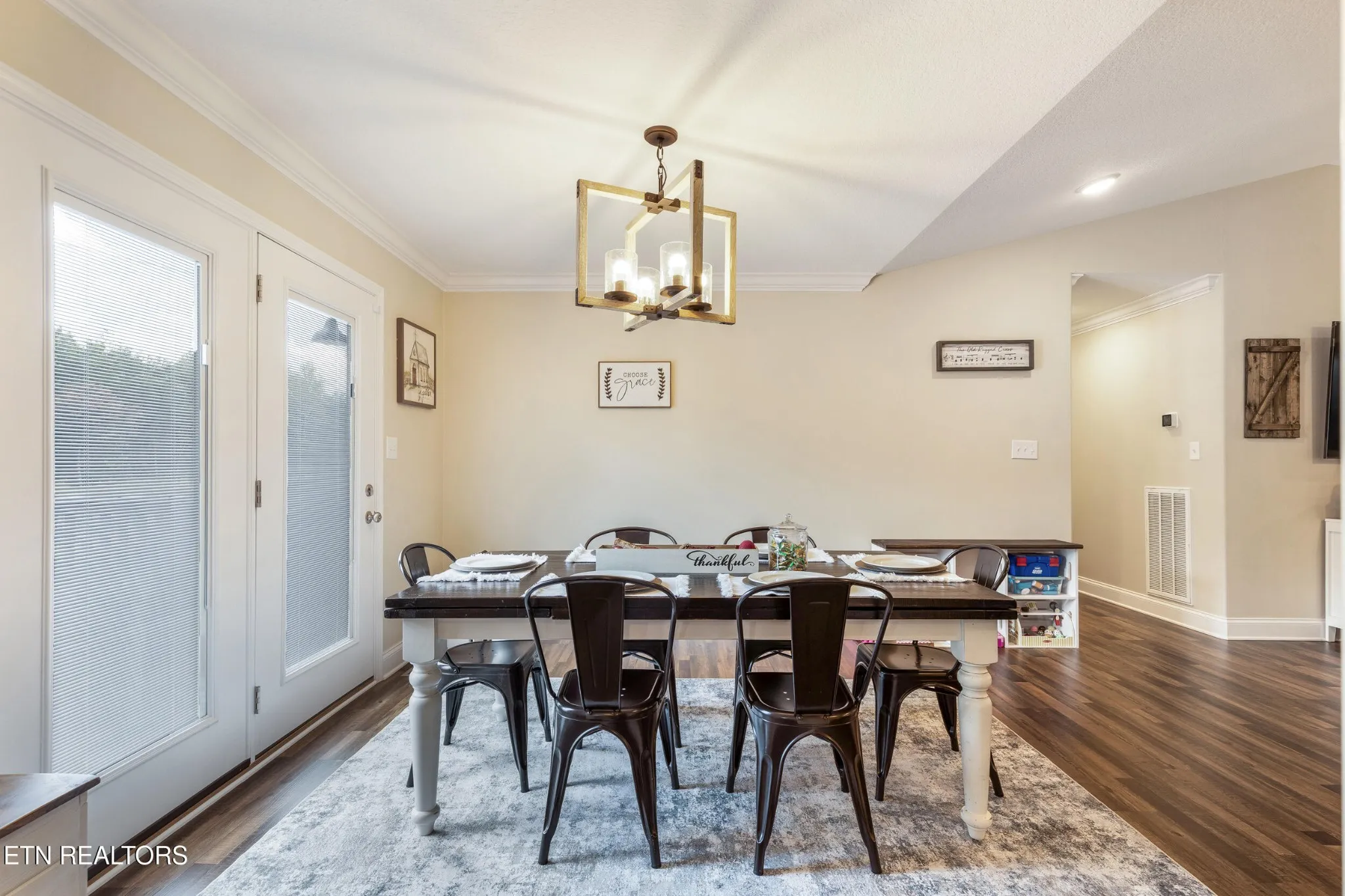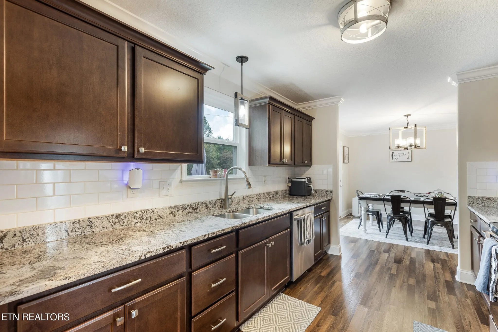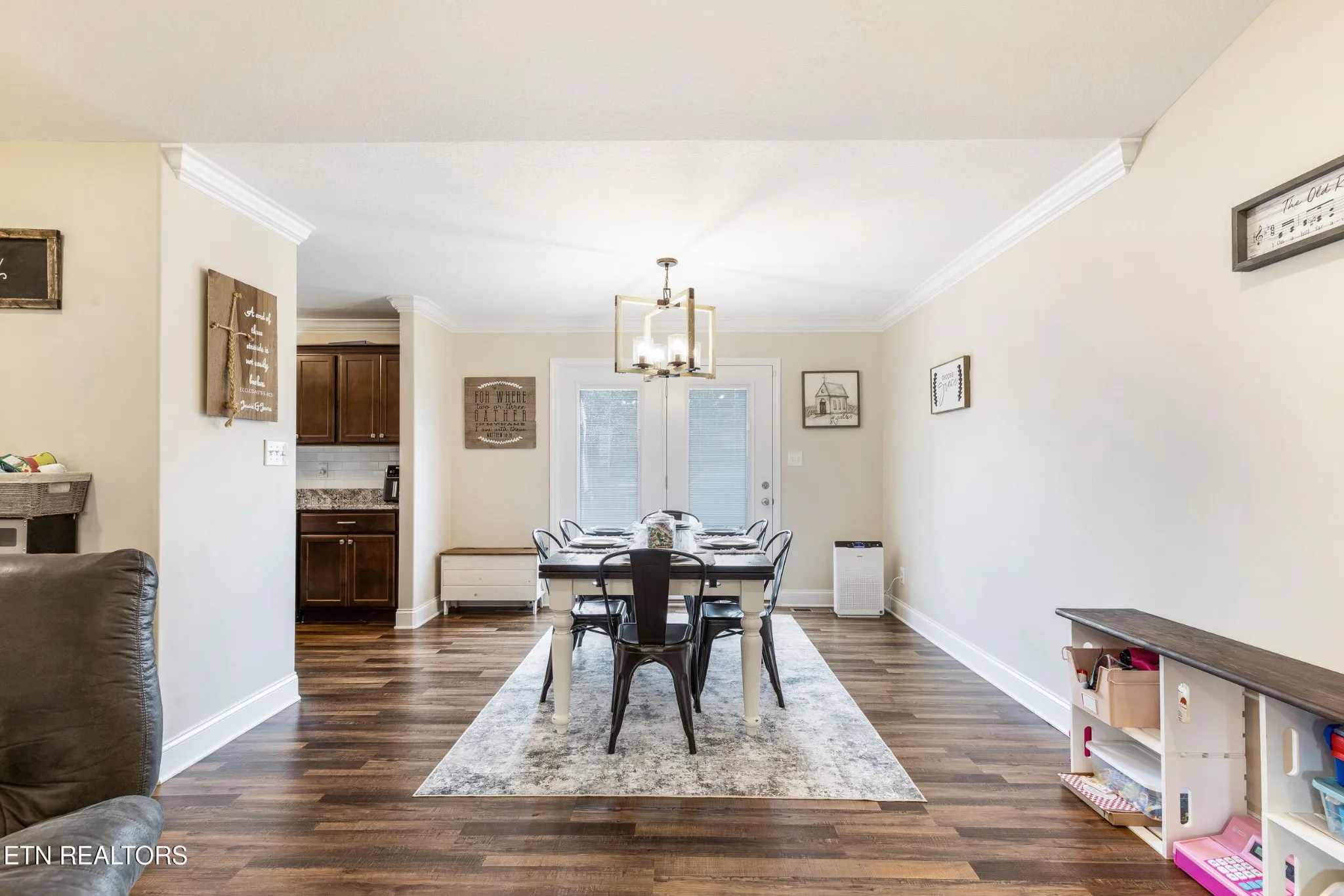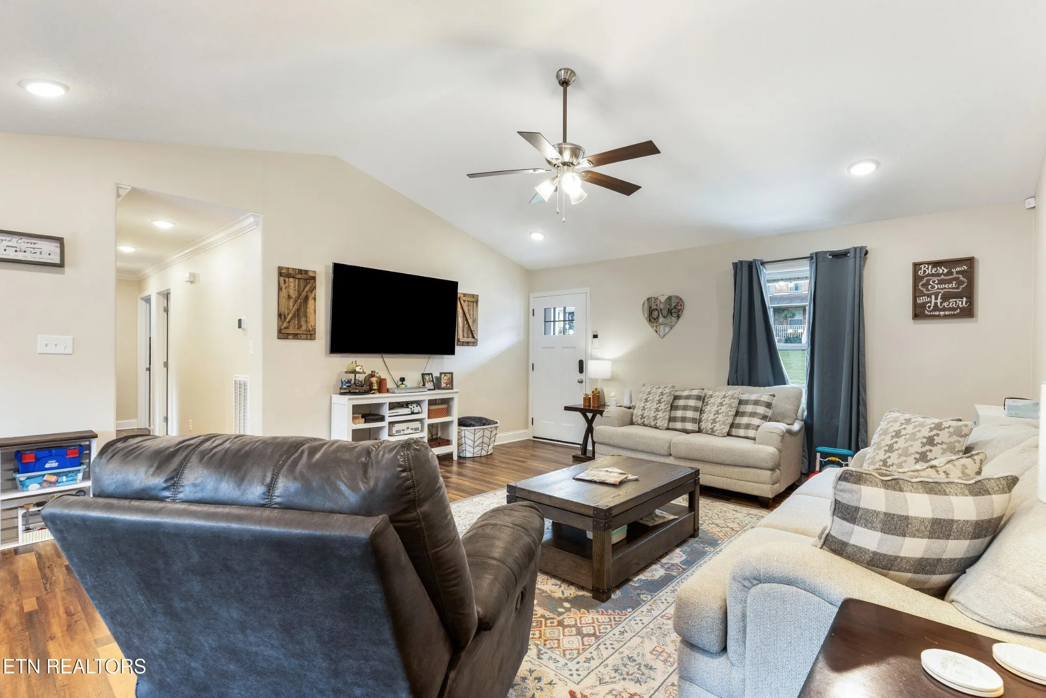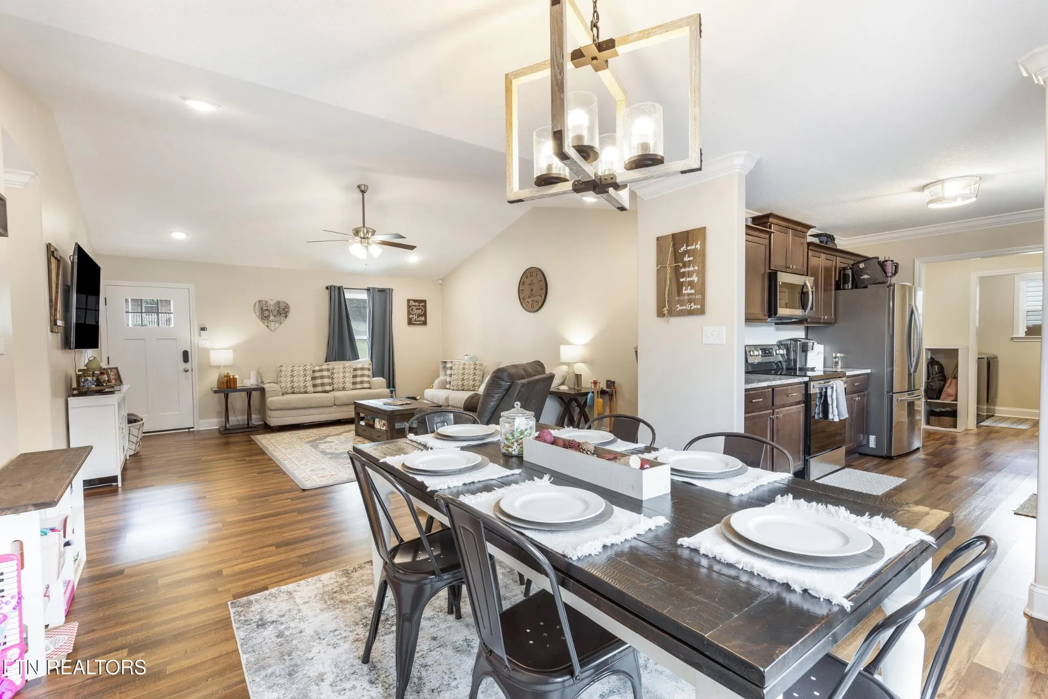 Step inside to a light and airy layout framed by vaulted cathedral ceilings in the living area, crisp crown molding, and luxury vinyl plank floors that flow seamlessly throughout the main spaces.