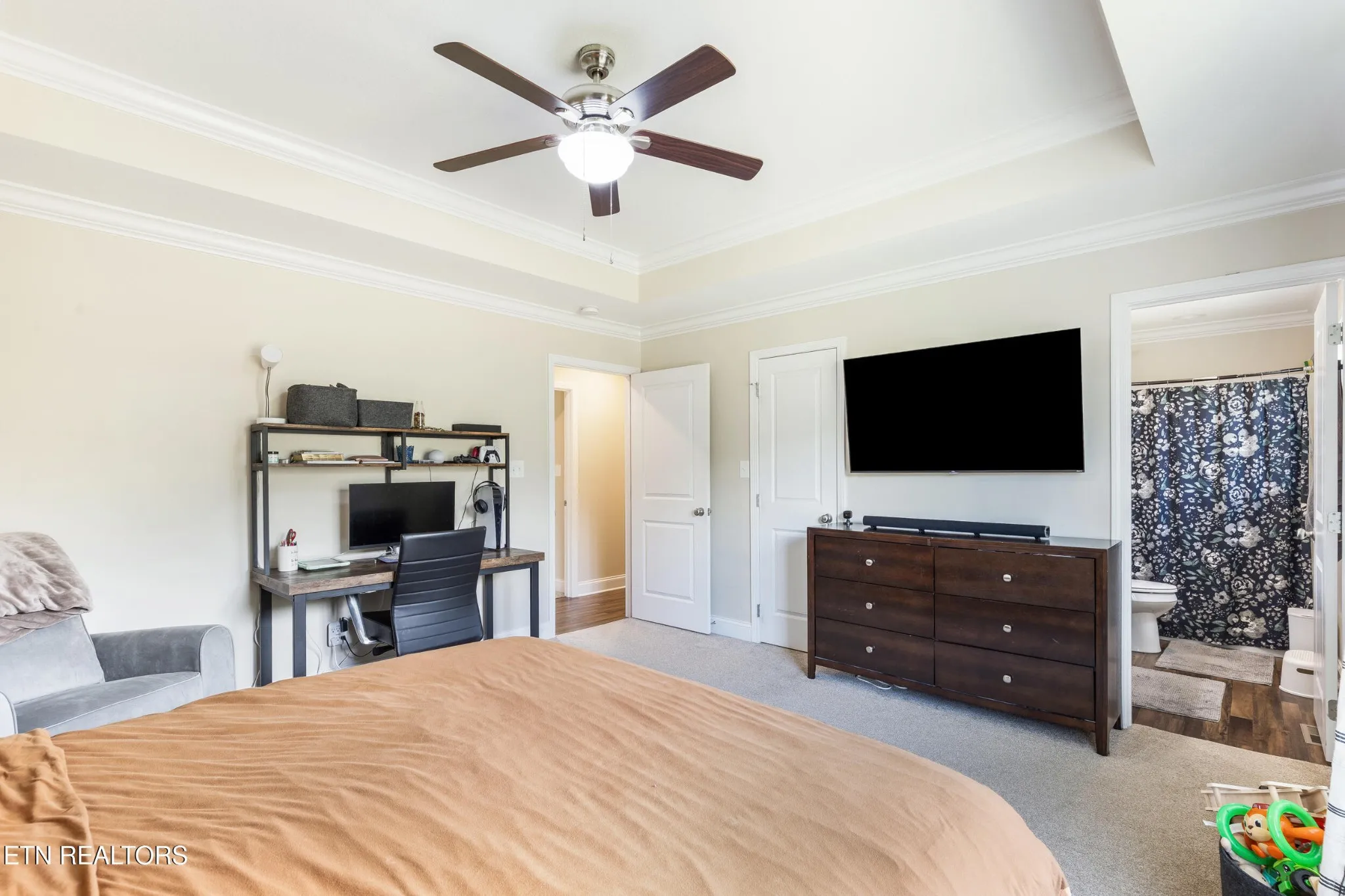 Retreat to the primary suite, which features a generous walk-in closet and an ensuite bath with a walk-in shower. Two additional bedrooms share a full bathroom — ideal for guests, children, or a home office.