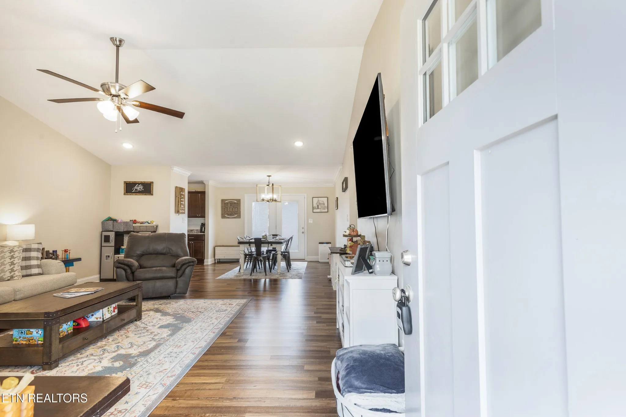 The open concept design invites effortless entertaining, with the living room opening directly into the dining area.