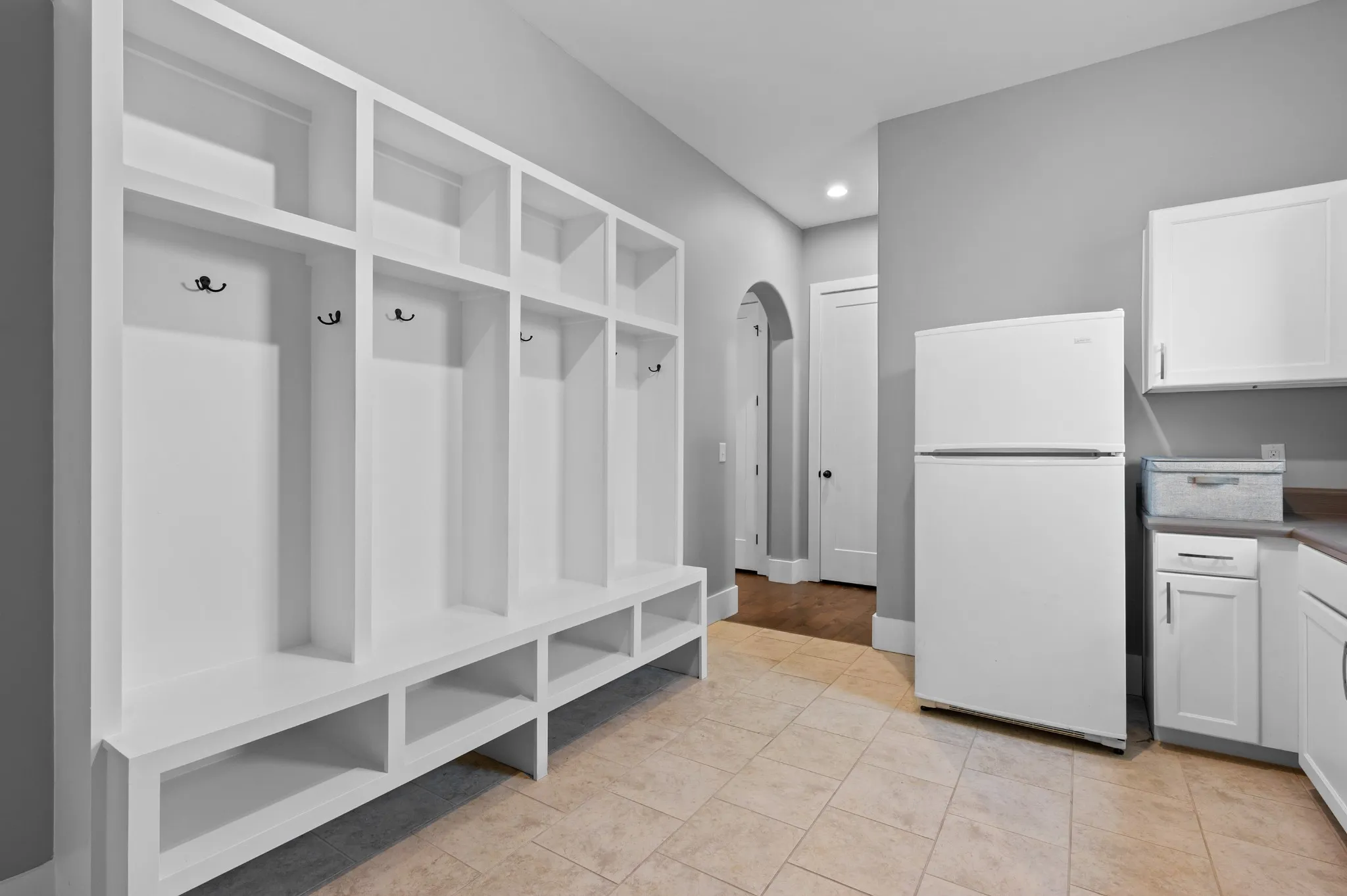 The custom kitchen, adjacent to the casual dining space, opens to the light-filled living room, complete with a stunning quartzite fireplace. The extra-large walk-in pantry and oversized utility room with laundry and built in drop-zone add exceptional storage and functionality.