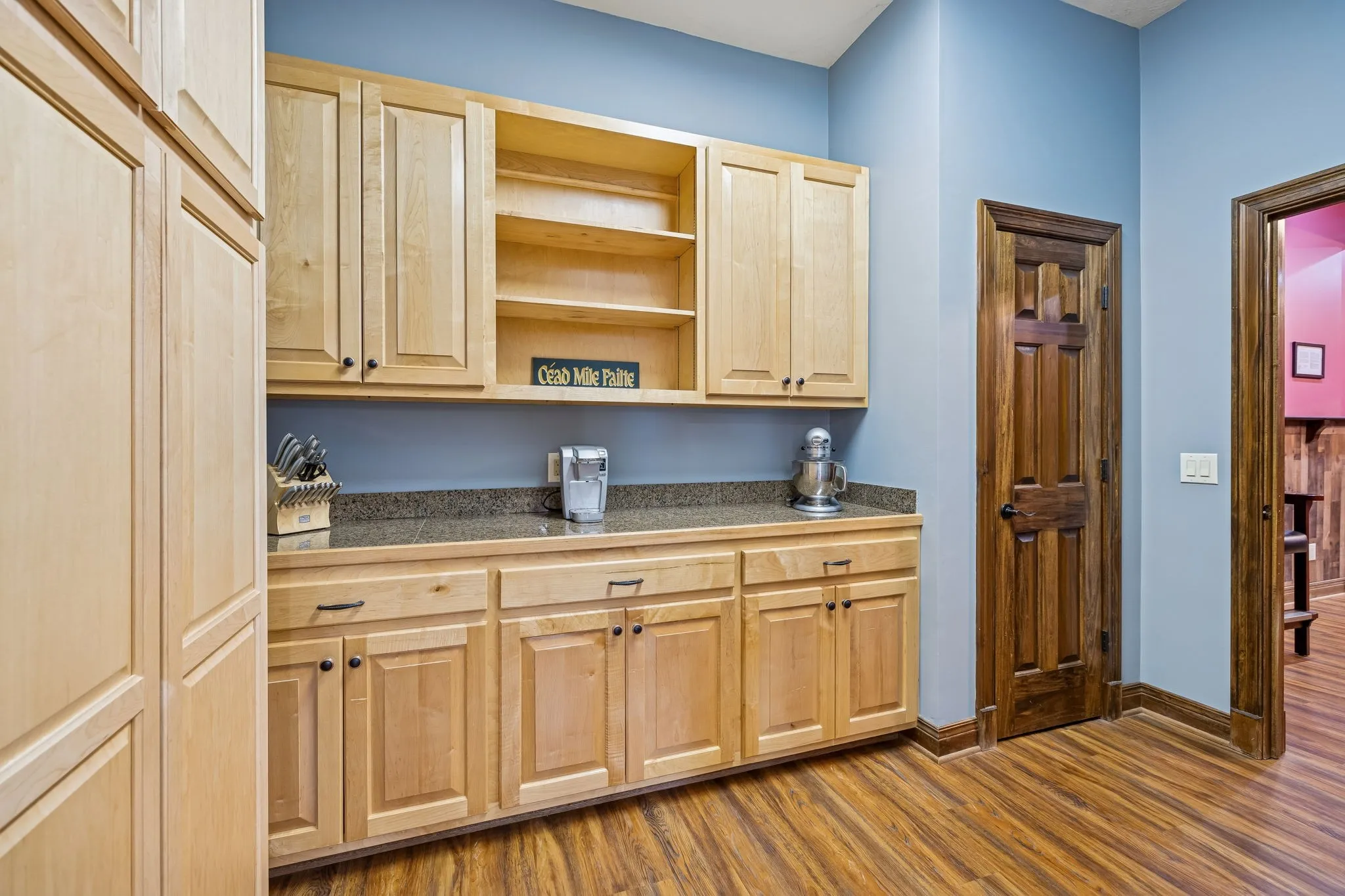 The kitchen features custom maple and cherry cabinetry, granite countertops, and a Butler’s Pantry, blending craftsmanship with practical design for entertaining and daily living.