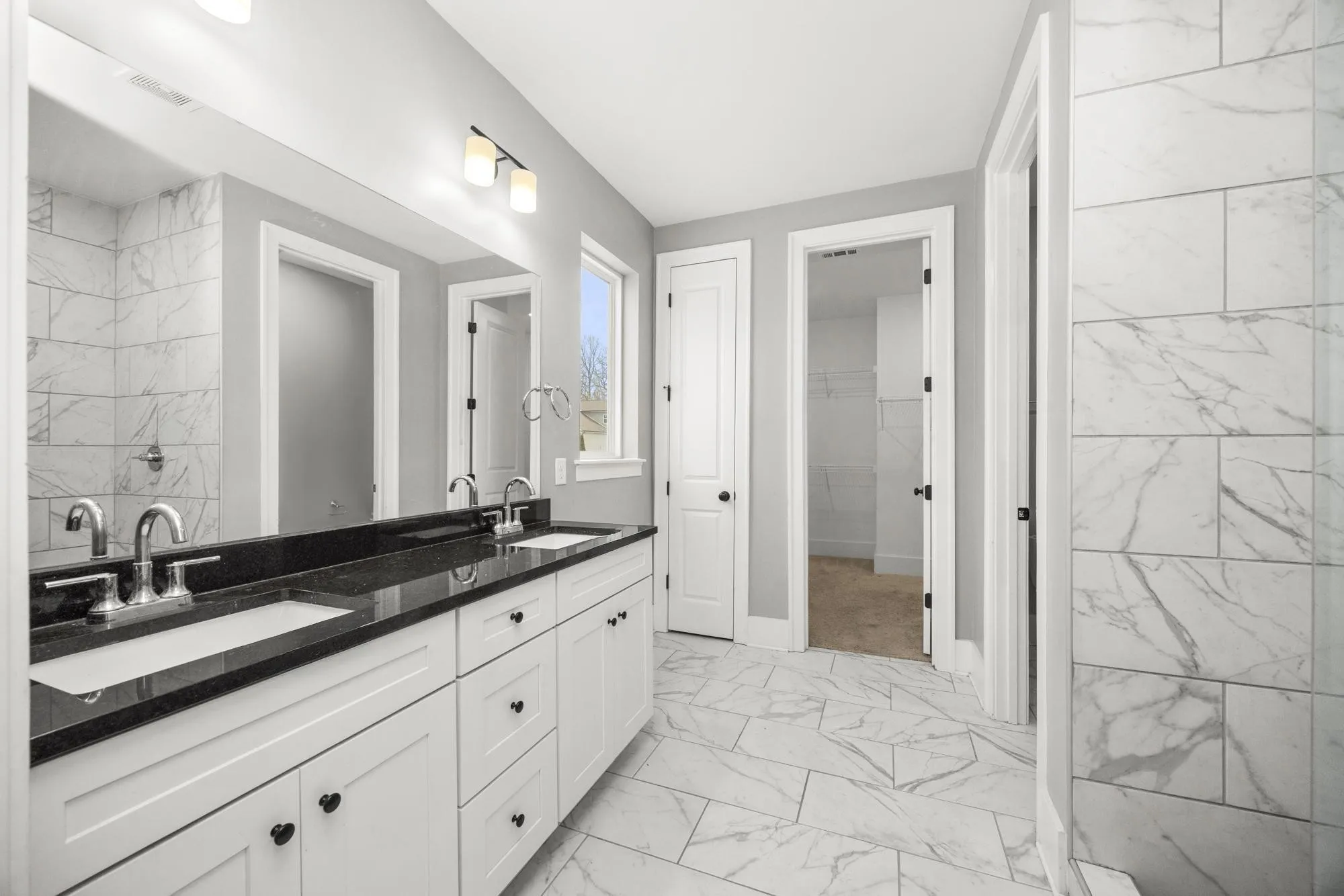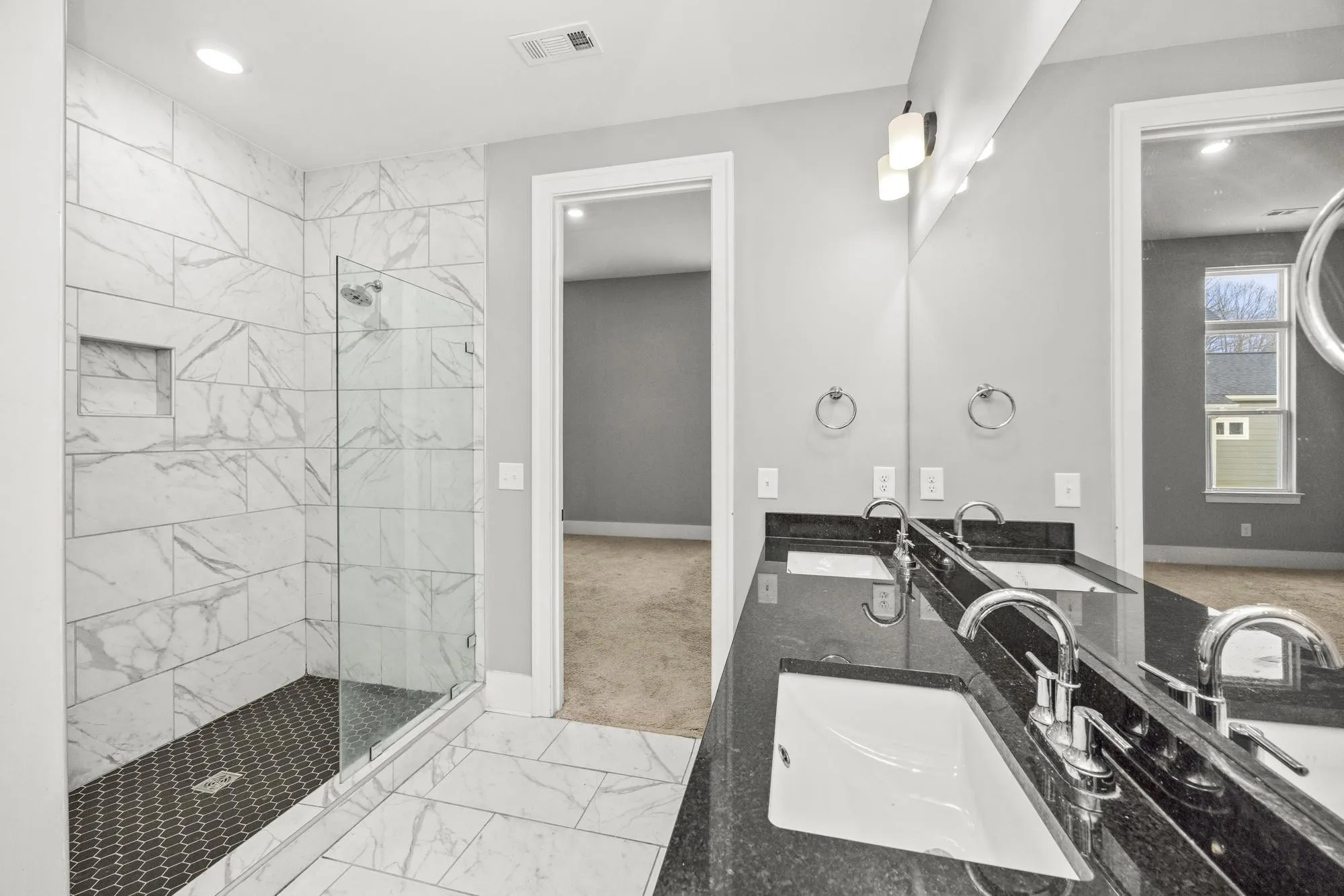 The primary suite offers a relaxing retreat at the end of the day, featuring a spacious bedroom and a spa-inspired bathroom with dual vanities, elegant tile flooring, and a beautiful glass walk-in shower. Additional bedrooms provide flexible space for family, guests, or a home office, giving the home versatility for a variety of lifestyles.