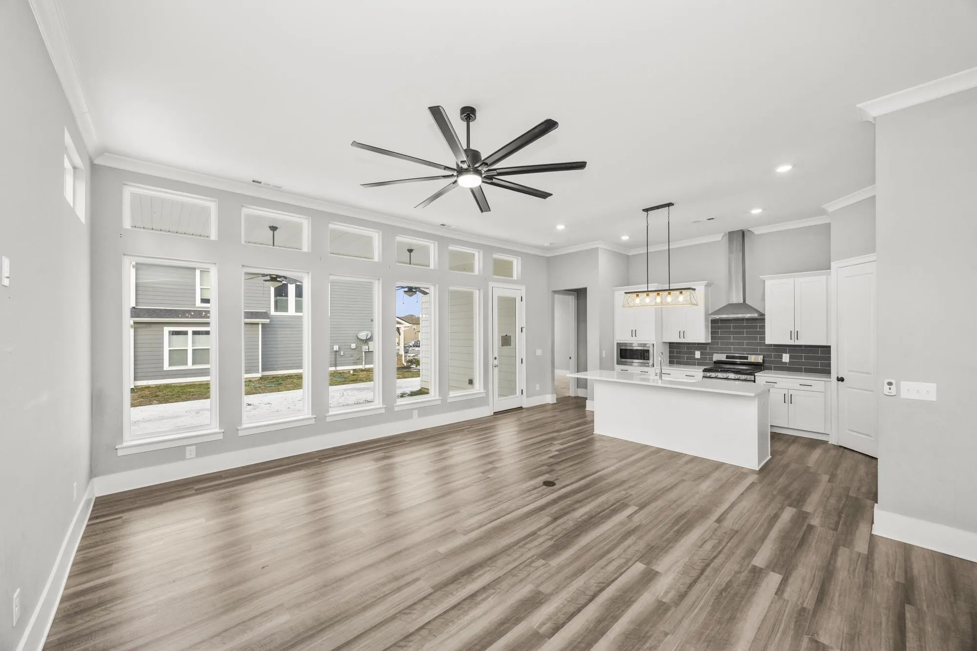 Inside, the home features a bright open floor plan designed for both everyday living and entertaining. The spacious living and dining areas are filled with natural light from the large windows and high ceilings, creating an airy and welcoming atmosphere. The main living space flows seamlessly into the kitchen, allowing family and guests to gather comfortably while still enjoying plenty of room to relax.