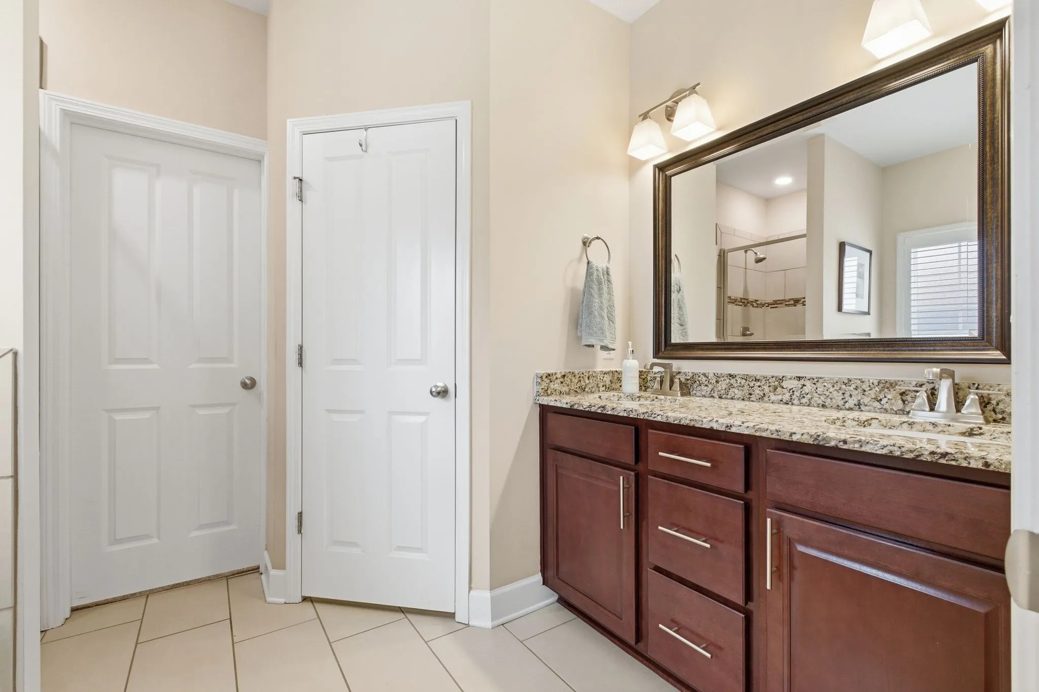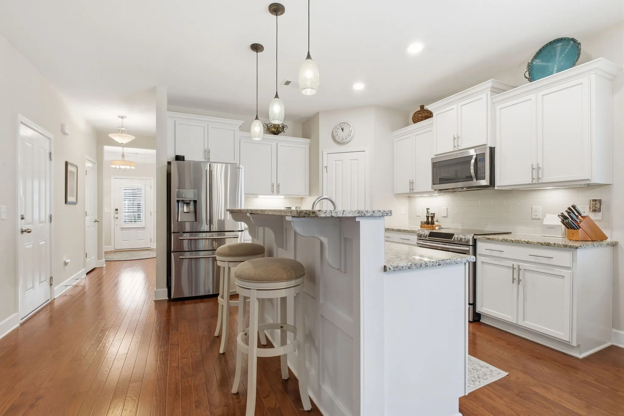 The main level includes a spacious primary suite overlooking the backyard for added privacy. The en suite bath features double sinks, a soaking tub, separate shower and a large walk-in closet that conveniently connects to the laundry room. The kitchen, dining, and family room flow together in an open layout centered around a gas fireplace – creating a comfortable space for everyday living and entertaining.