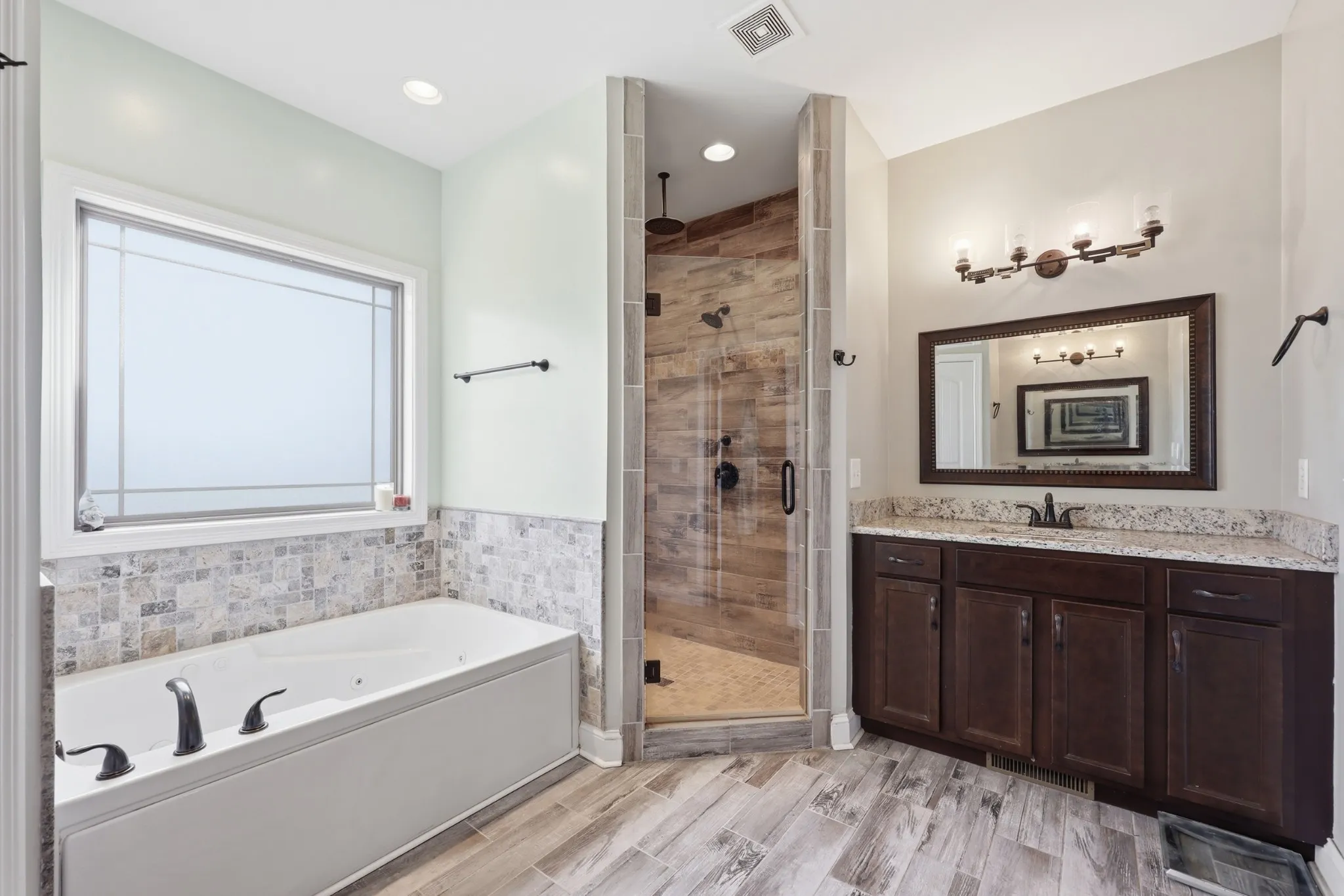 The main-level primary suite offers convenience and comfort, complete with tray ceilings, dual walk-in closets, and a spacious tile bath featuring dual vanities and a relaxing soaking tub.