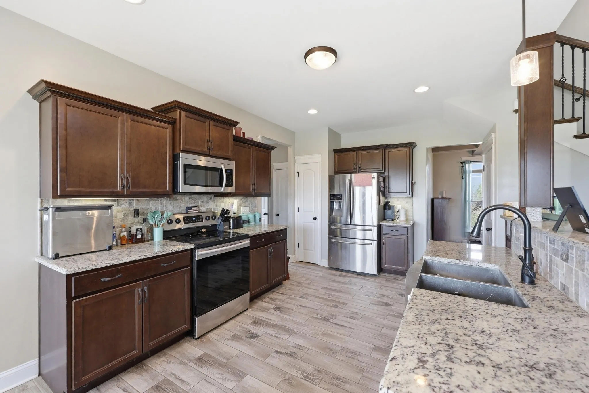 Upstairs, you’ll find additional bedrooms, a hall bath with dual vanities, and a large bonus room with a walk-in closet. Bedroom two also provides attic access to a decked storage area, offering excellent additional storage space.