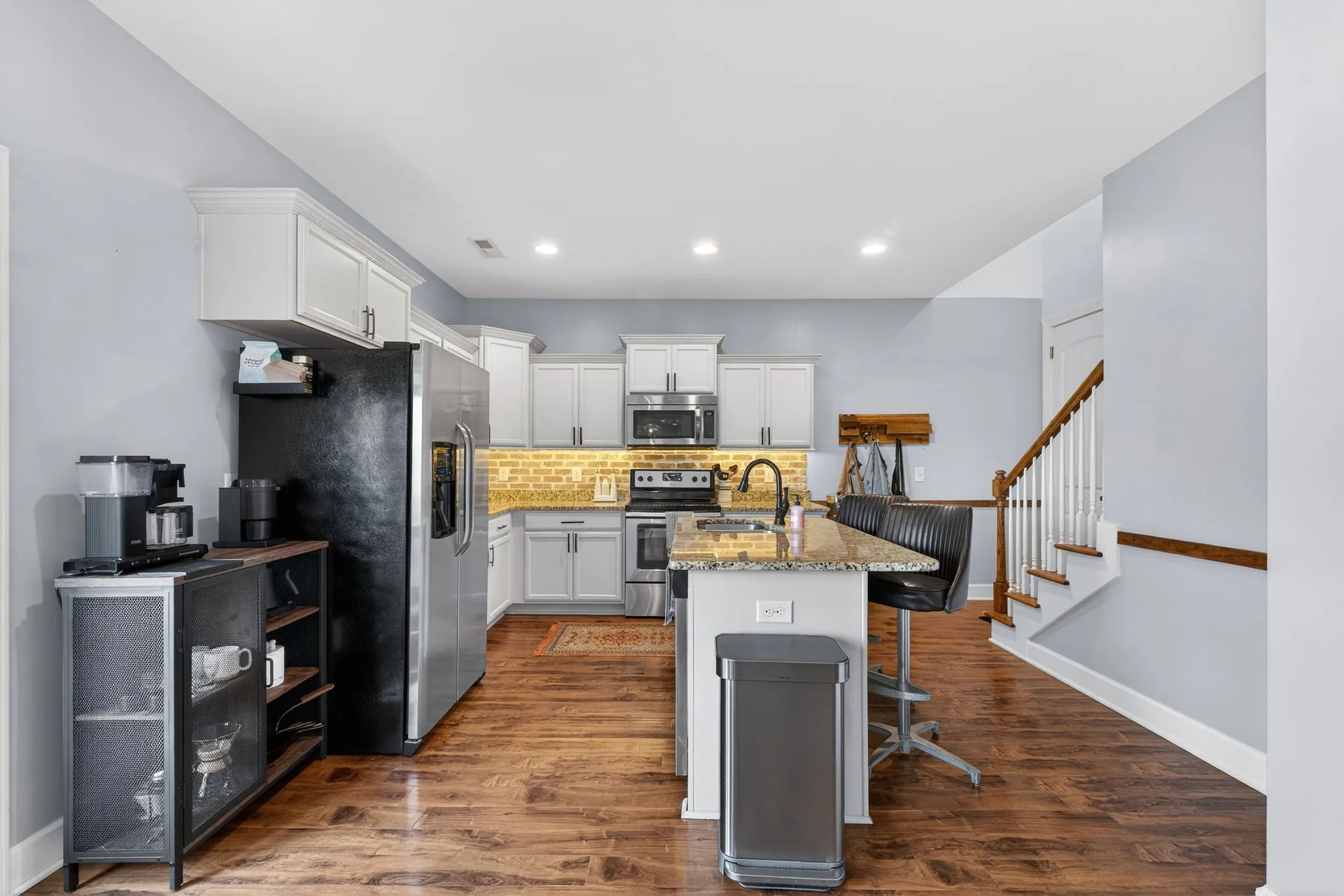 Primary bedroom is located upstairs along with the other two bedrooms, giving you a full primary bath with space to get ready in the mornings. The primary suite includes room to spread out and unwind at the end of the day. Two additional bedrooms upstairs share a full bathroom, and a half bath on the main level handles everyday needs without disrupting the upstairs spaces. Laundry room keeps the washer and dryer tucked away but accessible.