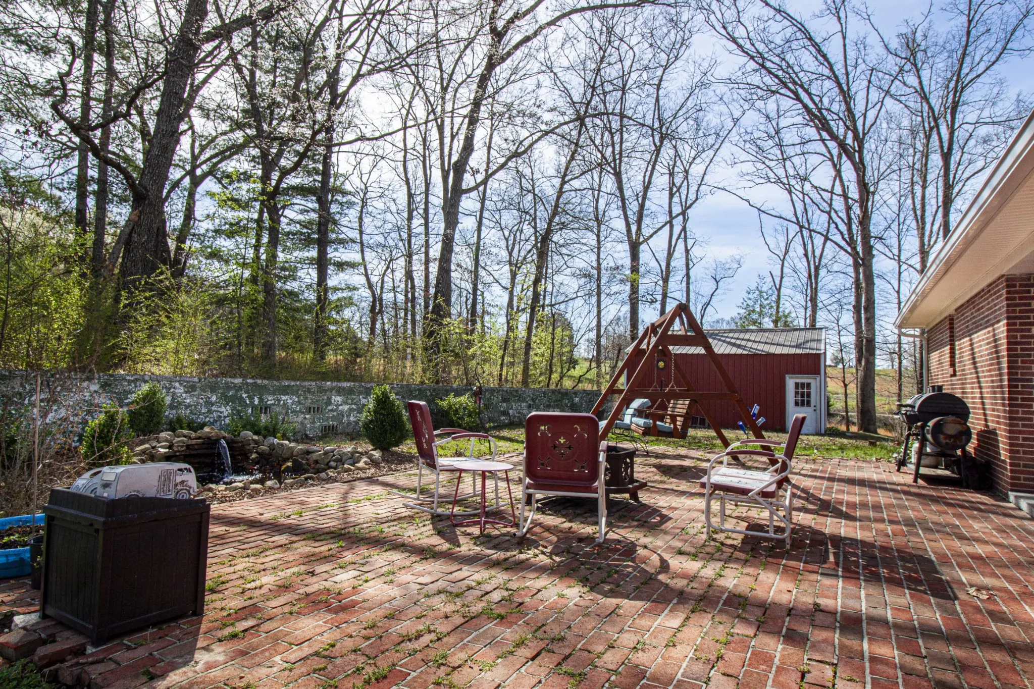 Outside is where this property truly shines. A private backyard retreat features a brick patio that leads you to a peaceful koi pond, an ideal setting to unwind after a long day. The nearly six-acre lot provides plenty of room to roam, garden, or simply enjoy the surrounding nature.