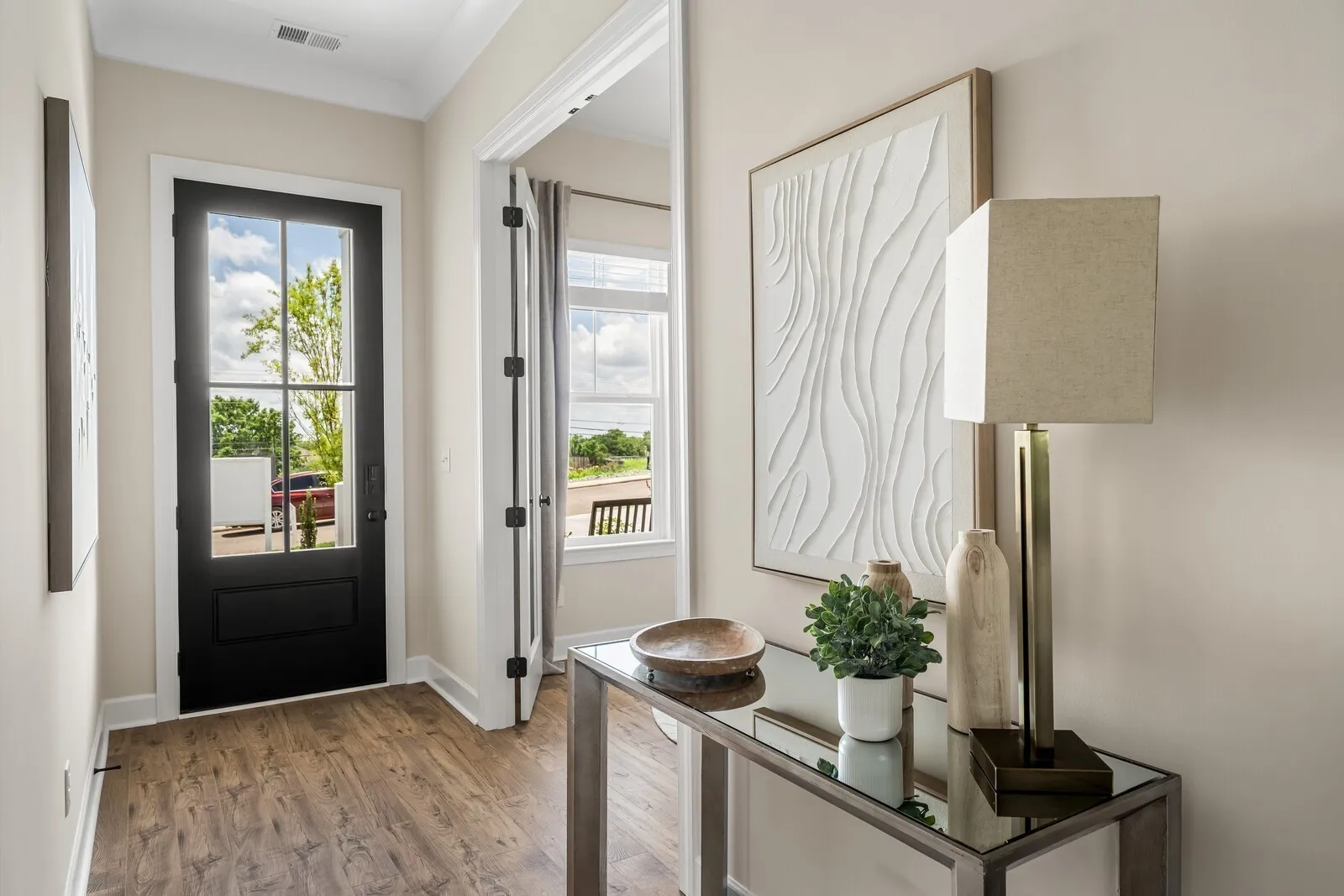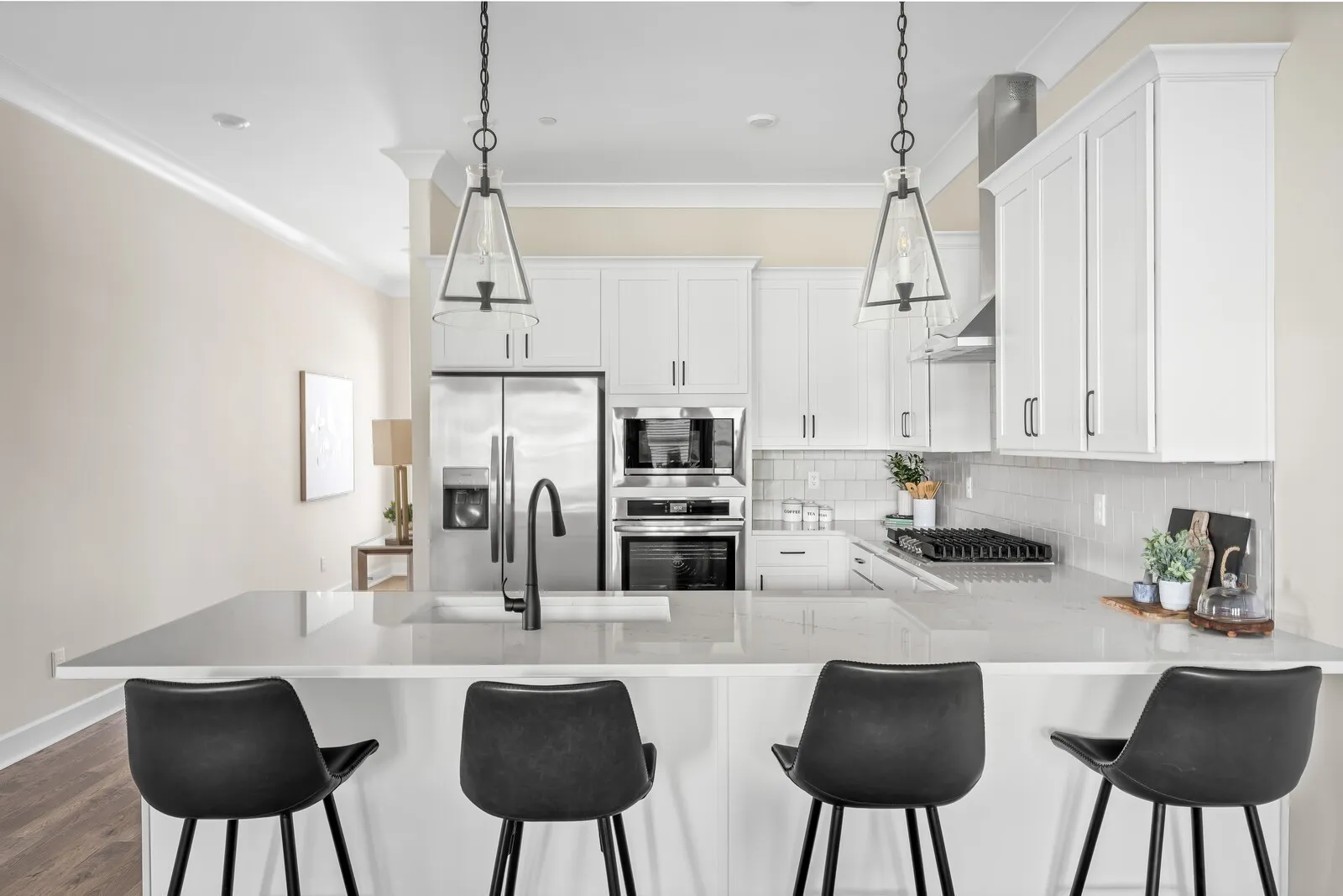 Lot 5 is our Harpeth plan that is an END UNIT with a walk out BASEMENT REC ROOM with TONS of natural light. Beautiful GAS fireplace, 10′ Ceilings, 8′ doors on 1st Floor and 9′ Ceilings in Basement. The basement has 1 bedroom and a huge Rec Room plus full bath and tons of storage space. Hardwood surface throughout first floor. Gourmet kitchen w/ GAS cooktop with decorative Stainless Steel vent hood, quartz countertops, backsplash to the ceiling, laundry room with sink, COVERED back deck off great room, white James Hardi cement board siding exterior with white windows and black gutters, 4 lite 8 -foot front entry door, BLINDS installed on All operable windows, and so much more!