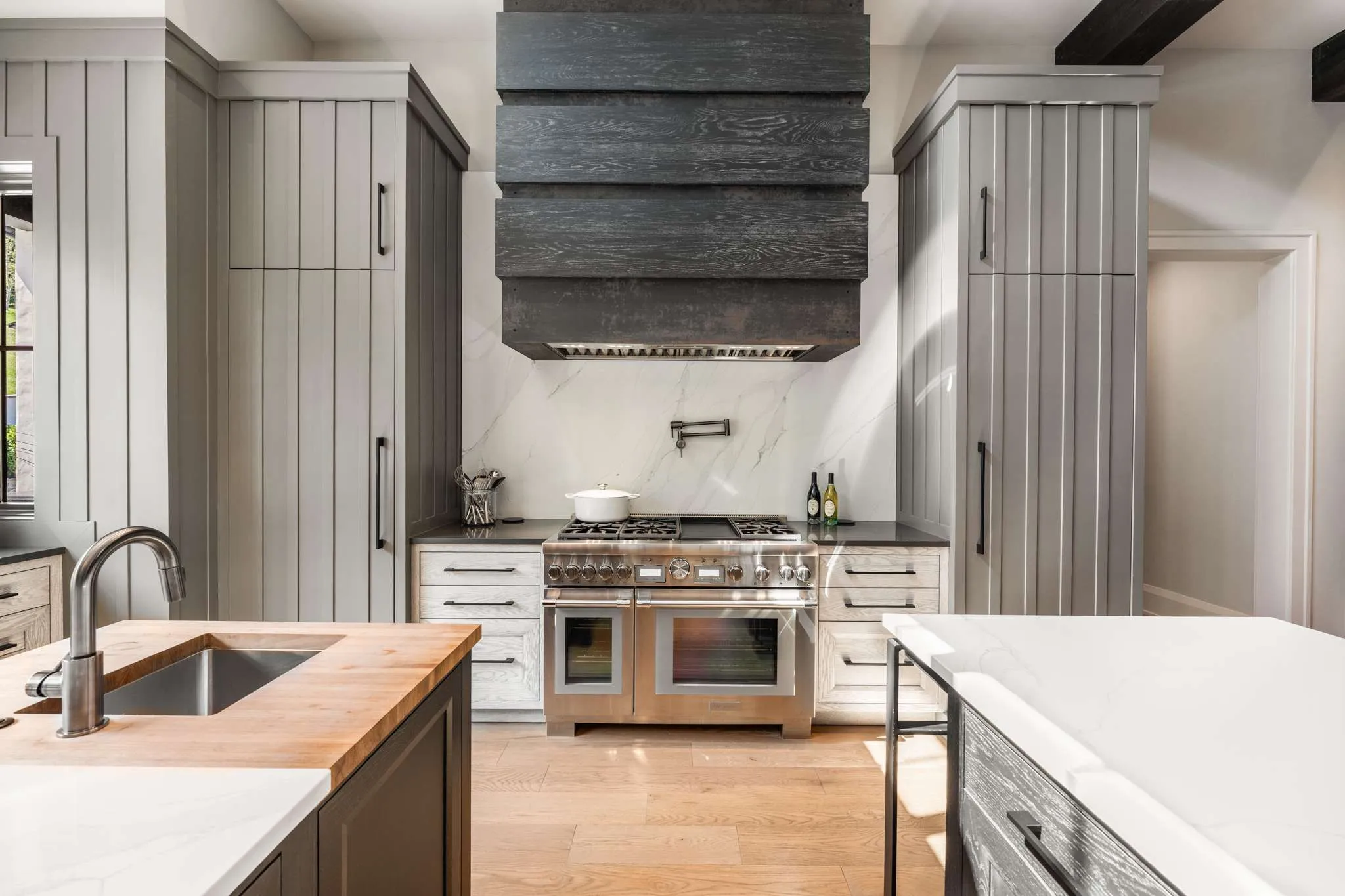 Step inside to the warm and inviting Entry Hall, uniquely flanked by dual Executive Offices. The open-concept main living area features soaring beamed ceilings, a show-stopping fireplace, and floor-to-ceiling windows and doors that create seamless indoor-outdoor flow. The stunning, light filled kitchen overlooks the pool and features double waterfall-edge islands, Thermador appliances, double refrigerators and dishwashers, and thoughtful custom cabinetry. The adjoining Butler’s Pantry beautifully expands the kitchen space with double ovens and full-size freezer. The formal dining area showcases an impressive glass-enclosed wine display room. The main level Primary Suite is a true private retreat, featuring a soaking tub and integrated TV, a dedicated coffee/wine bar niche, and separate his/her walk-in closets. Two additional main-level guest suites each offer private baths and refined finishes, ensuring comfort and privacy for family and visitors.