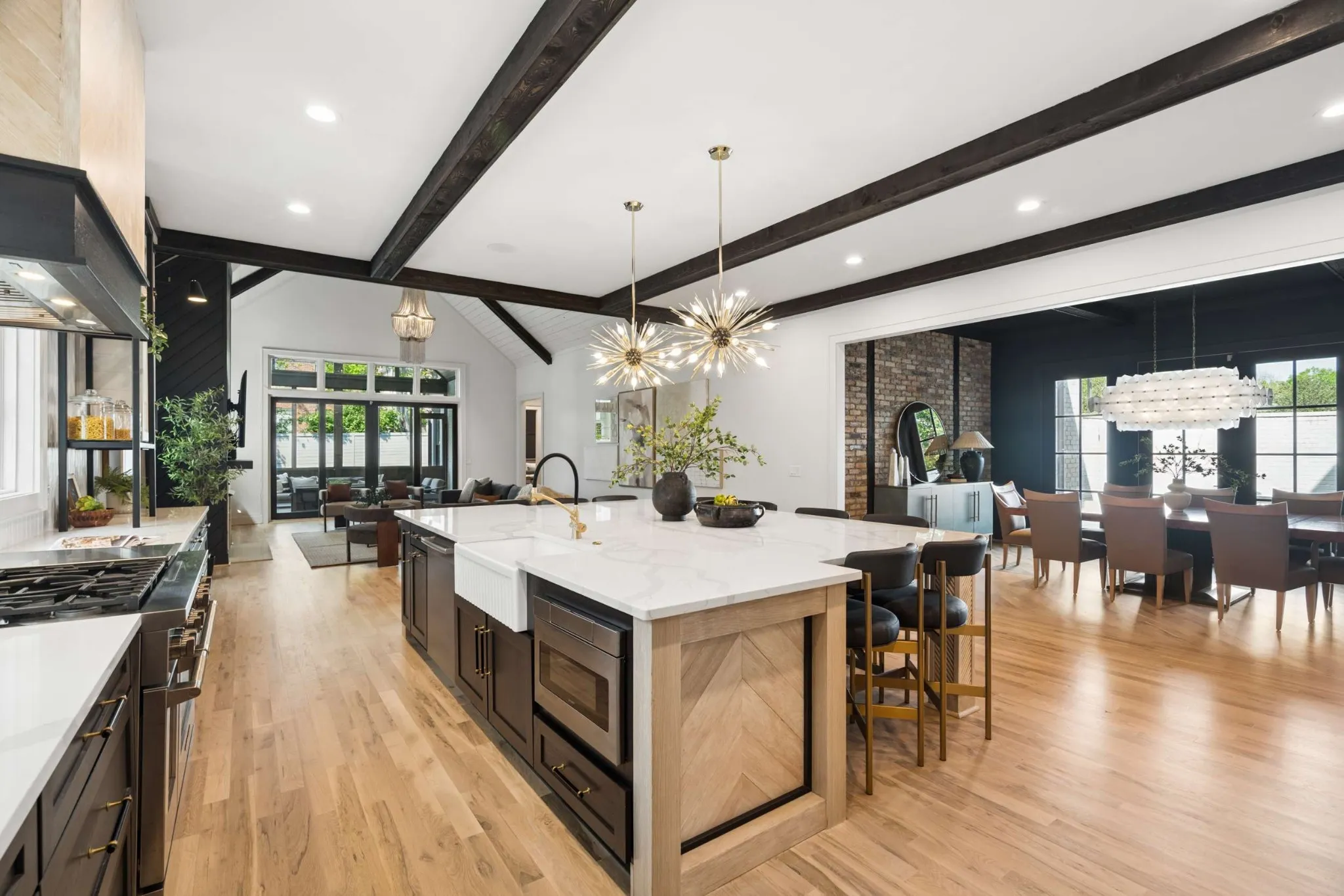Ideally located in the heart of Nashville, this exceptional in-town home offers the rare combination of convenience and generous living space. Just around the corner from Green Hills Park, several local schools, shopping, restaurants and a seasonal farmers market, this residence provides the ease of an urban lifestyle with the space of a private retreat. Offering 6,275 sq ft of well designed space, the heart of the house features a nearly 12 ft kitchen island that seats eight, a dedicated dining area and a large family room with fireplace — ideal for entertaining and everyday living. Step outside to the screened porch where you’ll find another fireplace and beyond, a patio with built-in grill and a fully gated yard with room for a pool. A second, intimate dining patio is accessed from the dining area. The main level includes two, large en-suite bedrooms (one currently used as an office). Upstairs are three additional en-suite bedrooms, plus two large bonus rooms with flexible options for media, office, fitness or guest space. Dramatic vaulted ceilings in most rooms, including both bonus rooms. Got laundry? THREE laundry stations – main level laundry room, full sized stackable in the Primary closet and a second set of full sized units in an upstairs laundry room. Additional features include 2 car garage with anti-slip epoxy floor and Tesla EV charger, lots of attic storage. DocAir ERV system for improved air quality and efficiency. Don Kennedy roof. Zoned for Percy Priest Elementary and convenient to JT Moore, Lipscomb Academy, Lipscomb University and Belmont University. Easy access to 12S, Hillsboro Village, Green Hills and downtown.