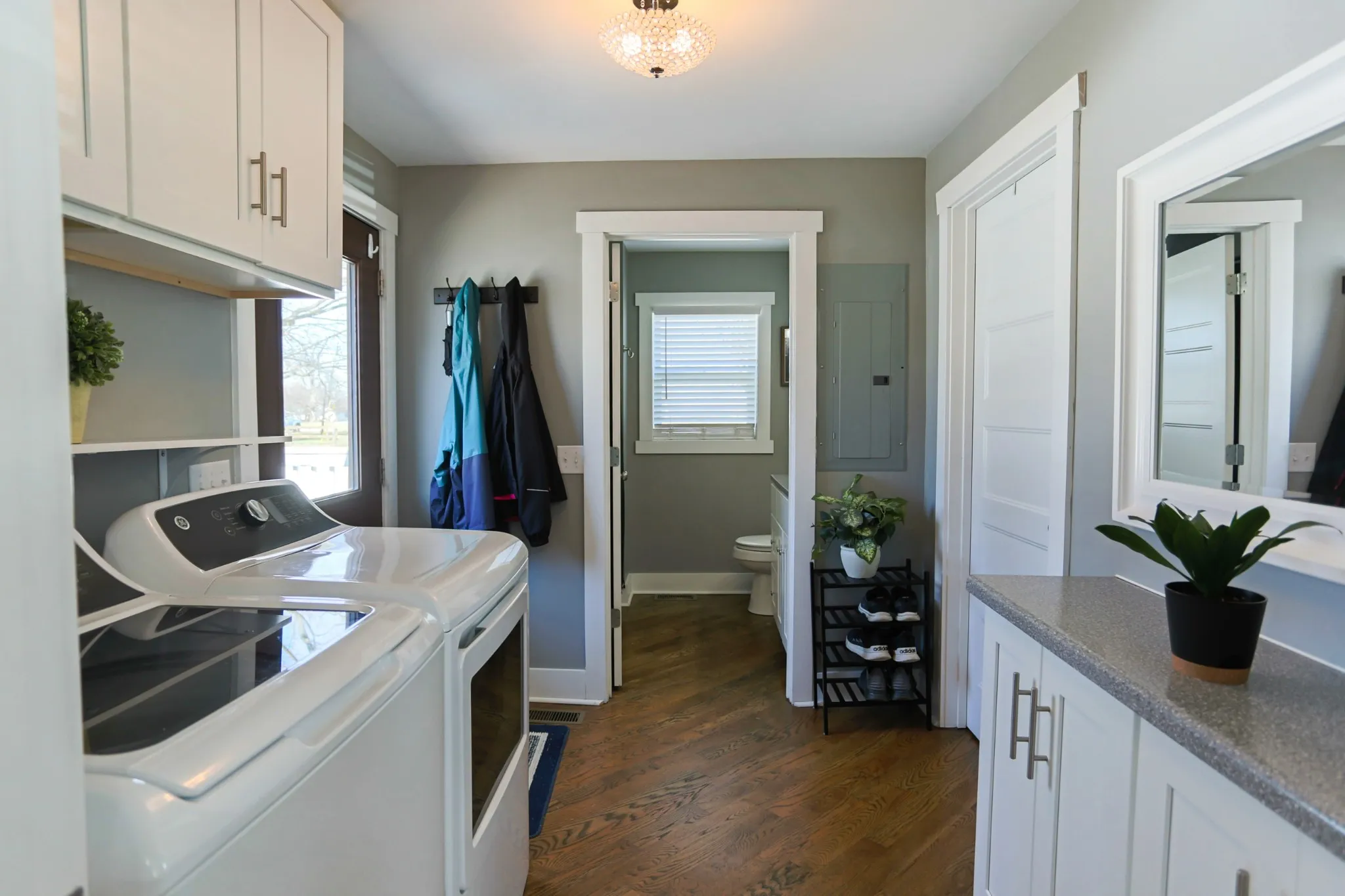 Coordinating kitchen appliances and updated hardware throughout provide a clean, modern finish. The main level includes two bedrooms, including the primary bedroom, along with a full bath. Upstairs offers two additional rooms, currently used as a guest space and a loft-style den. Recently renovated, the home showcases hardwood floors throughout, adding warmth and durability.
