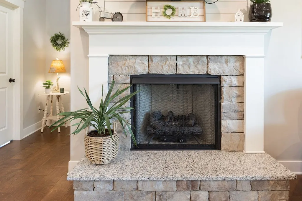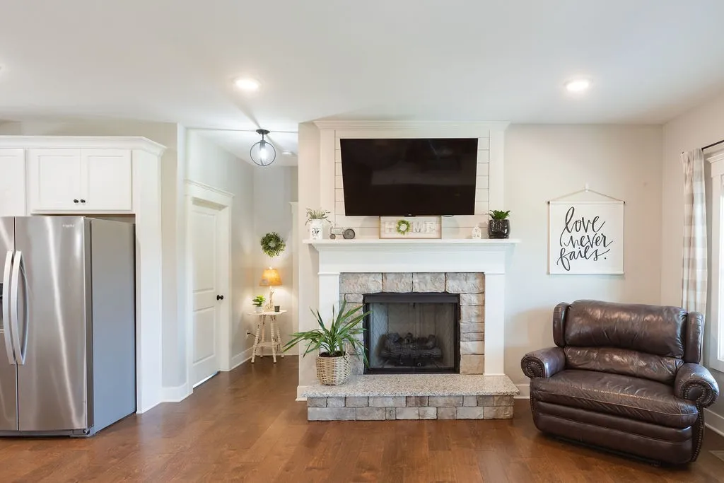 The home, built in 2020, offers 1,878 sq ft with an open concept layout, 3 bedrooms with a possible 4th bedroom, 2 full baths, and a dedicated office. Interior features include hardwood and tile flooring throughout, a spacious oversized dining room, large mud/laundry room, and a cozy fireplace. The primary suite includes a private en-suite bath.