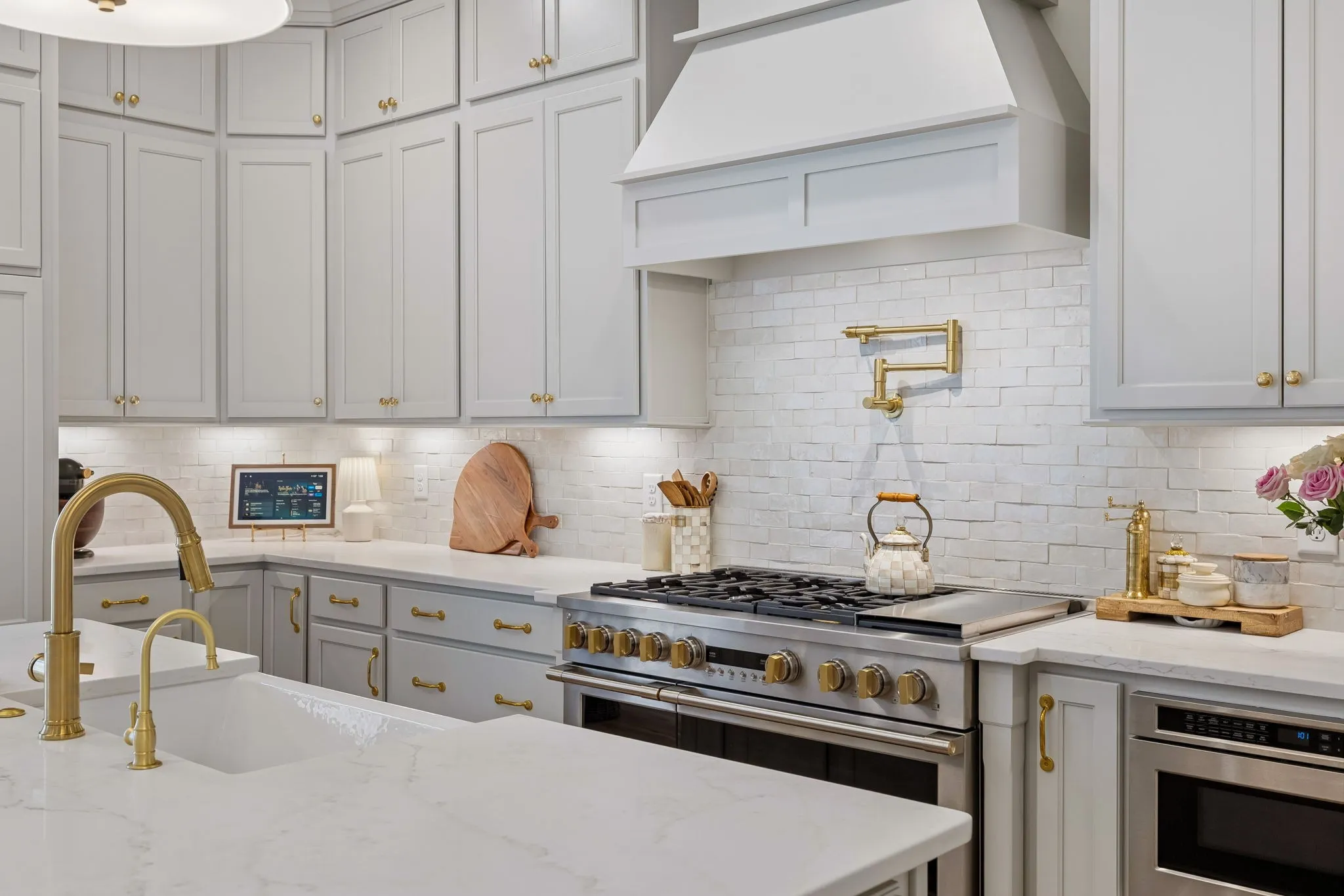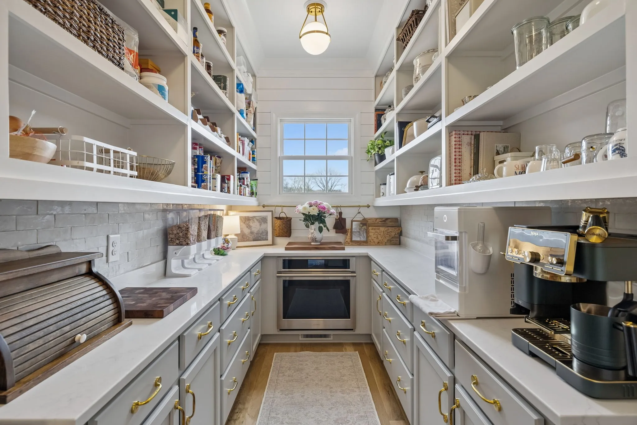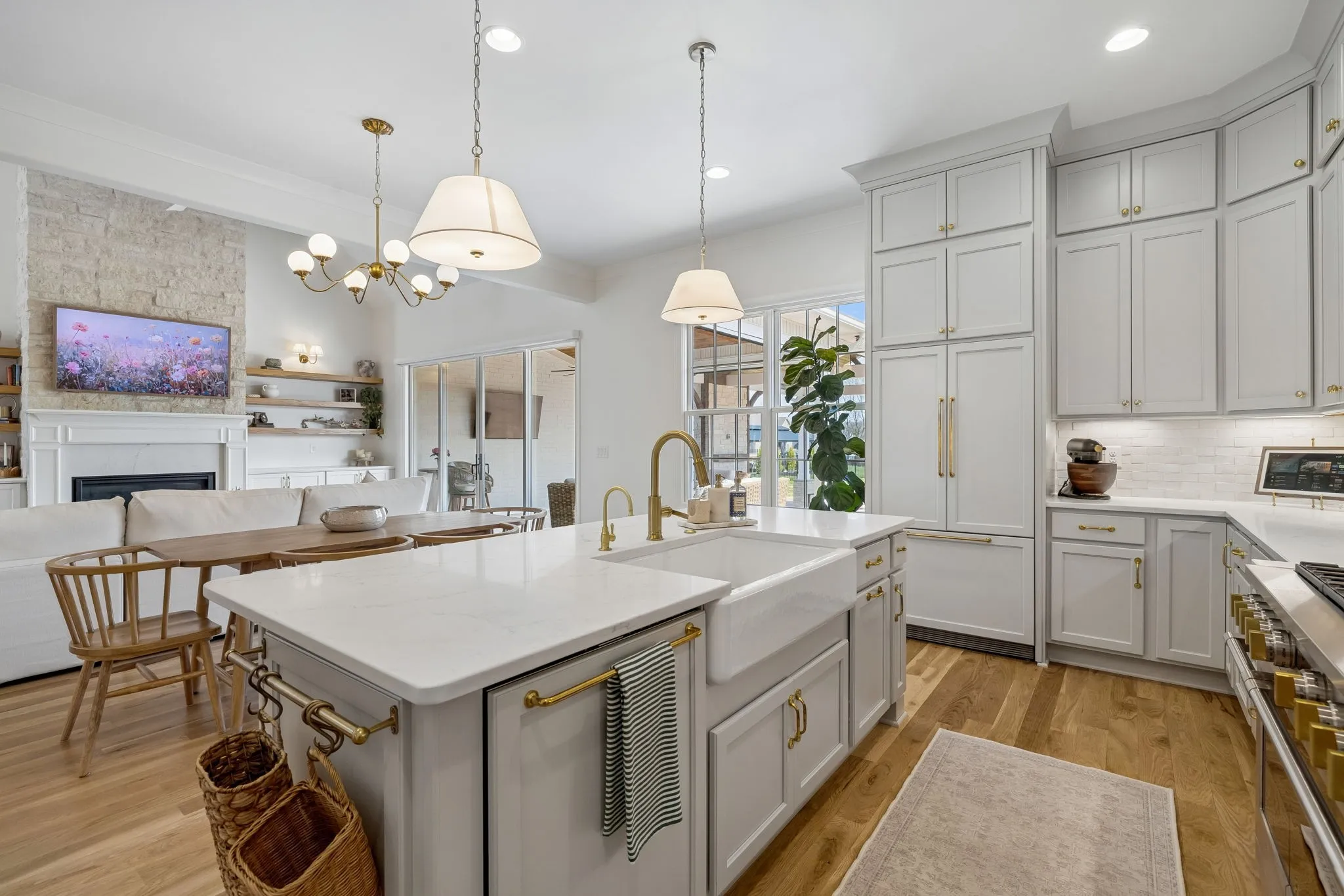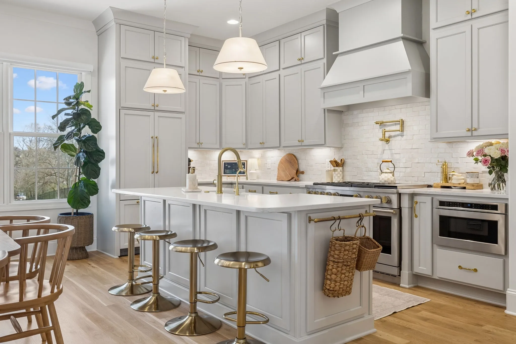 Inside, the chef’s kitchen is truly the heart of the home. Filled with natural light and generous workspace, it features a GE Monogram six-burner gas range with griddle and double ovens, panel-front appliances, and a beautifully designed scullery/working pantry complete with an additional oven/air fryer and room for a second refrigerator, making hosting effortless whether it’s a large gathering or an intimate dinner.