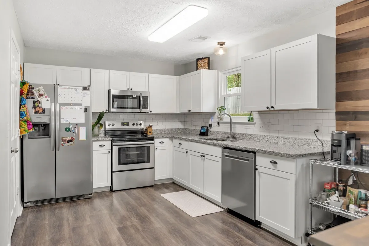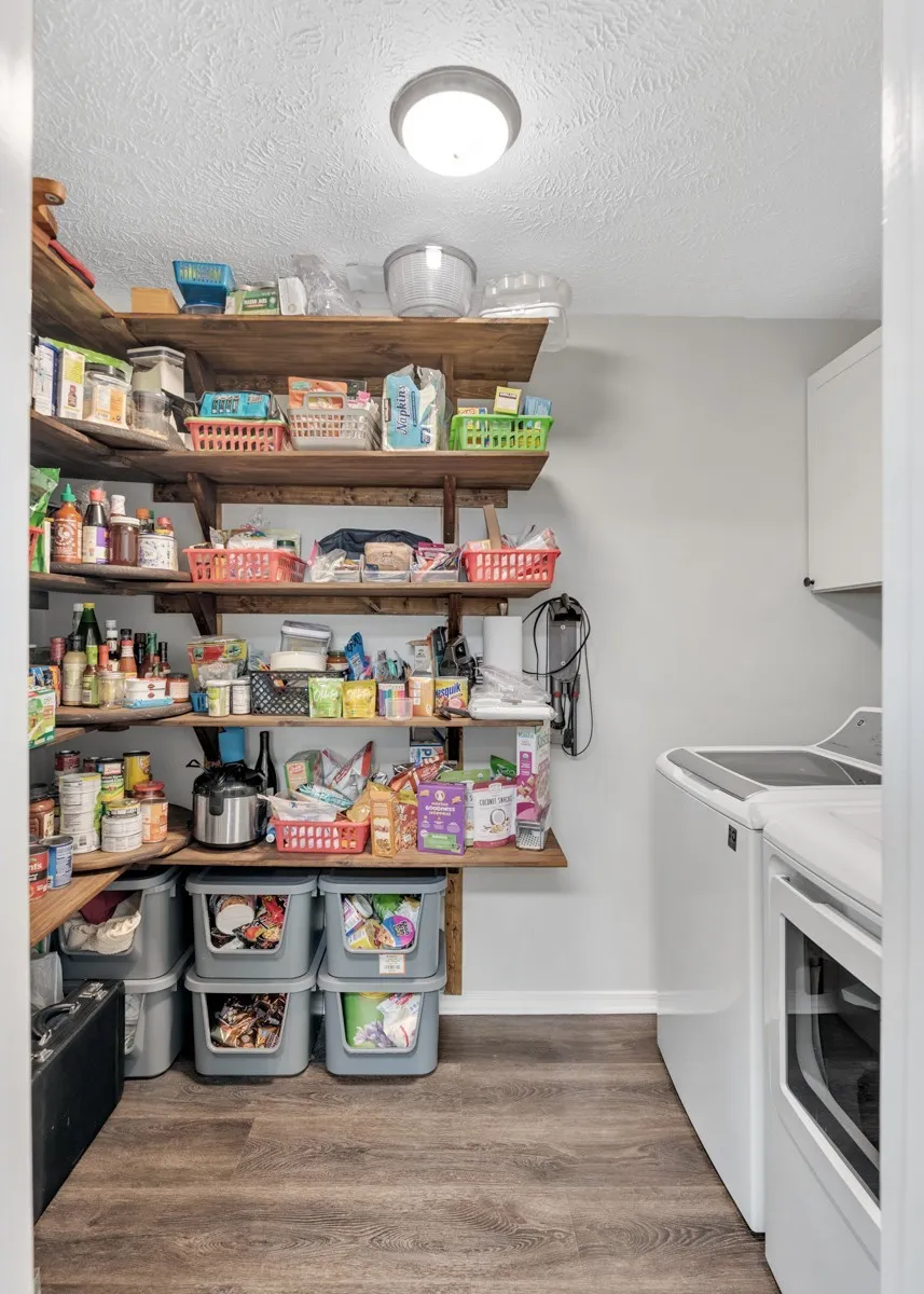 Kitchen offers custom pantry shelving and includes all stainless steel appliances, with an additional refrigerator in the garage.