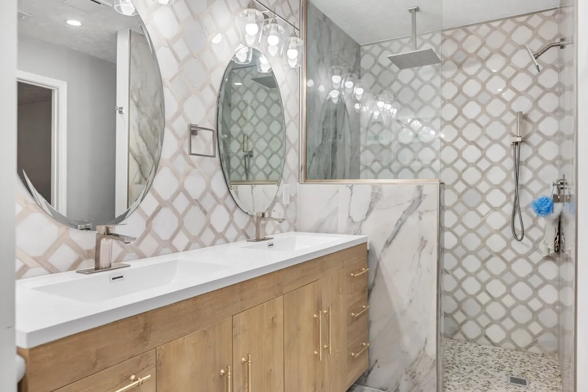 All three bedrooms are located upstairs, each with a walk-in closet. Bathrooms have been completely renovated with updated tile flooring, modern vanities, and custom showers.