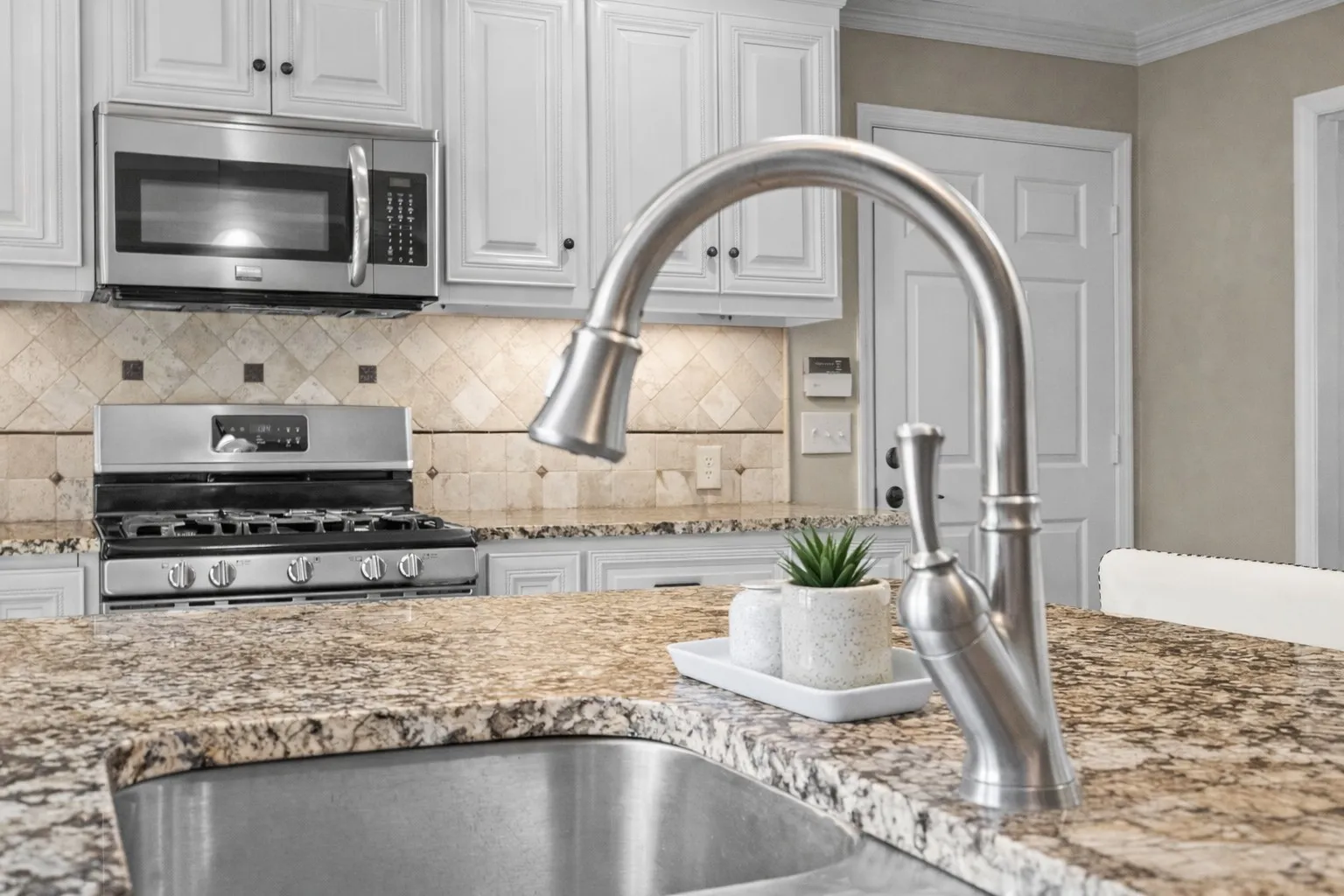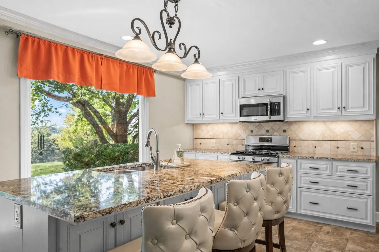 Gourmet Kitchen: The completely REMMOLDED kitchen features custom cabinetry, elegant granite countertops, a stylish tile backsplash, and modern lighting—perfect for both everyday meals and entertaining.