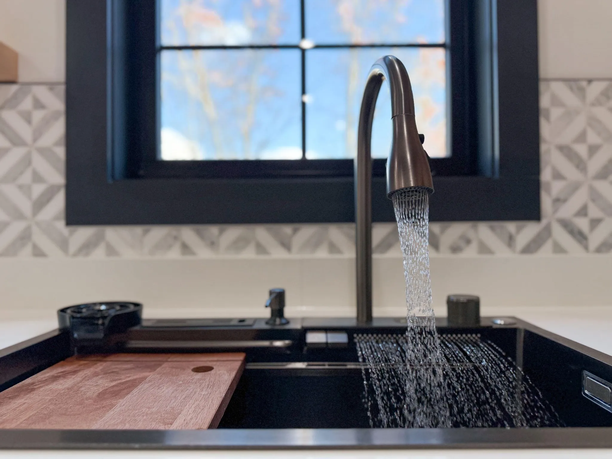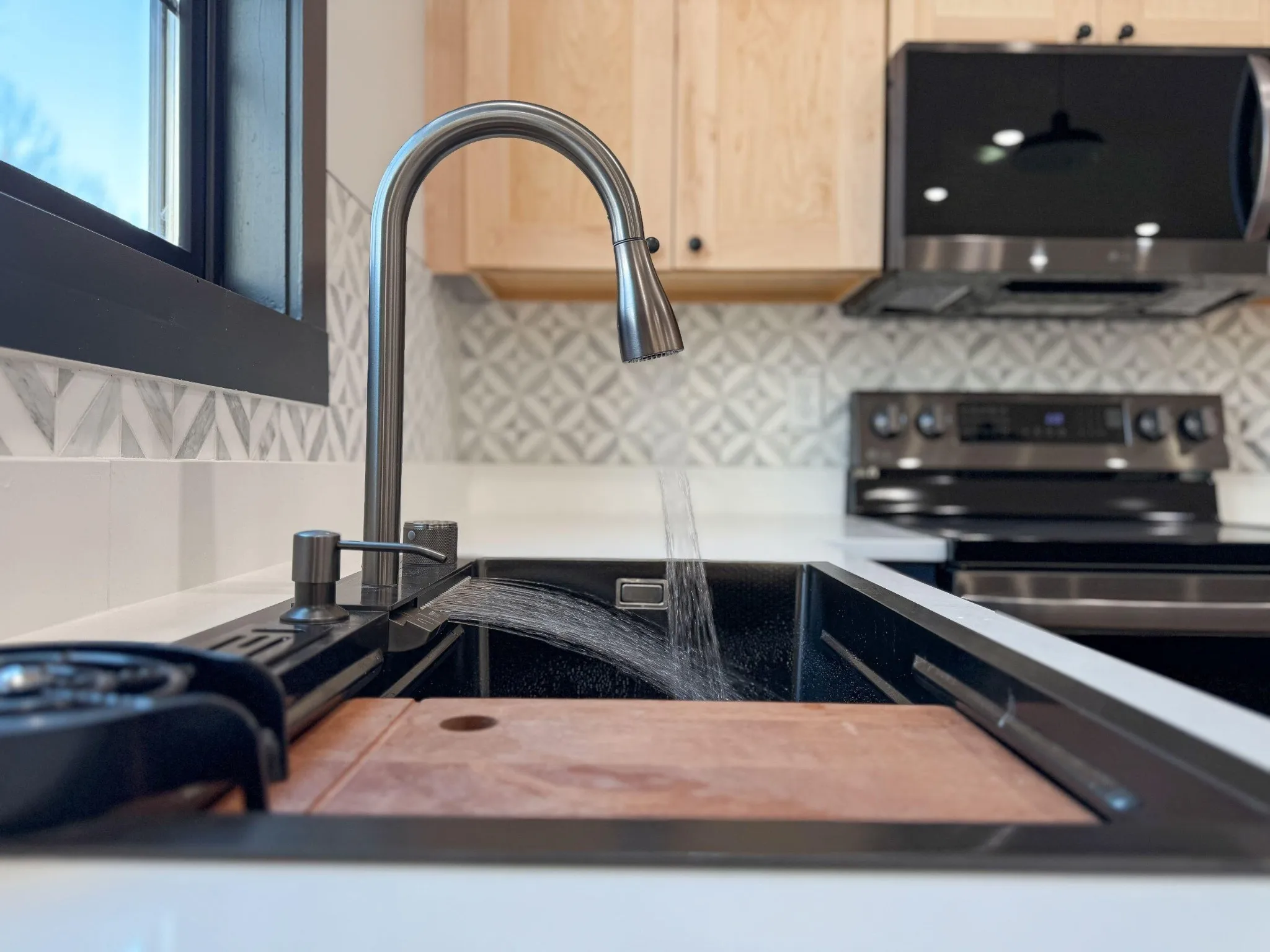 At the heart of the home is a stunning gourmet kitchen designed for both entertaining and daily life. Outfitted with premium appliances and ample counter space, the kitchen features a striking workstation sink with a waterfall faucet and built-in accessories including a cutting board, glass rinser, and soap dispenser–both practical and visually impressive.