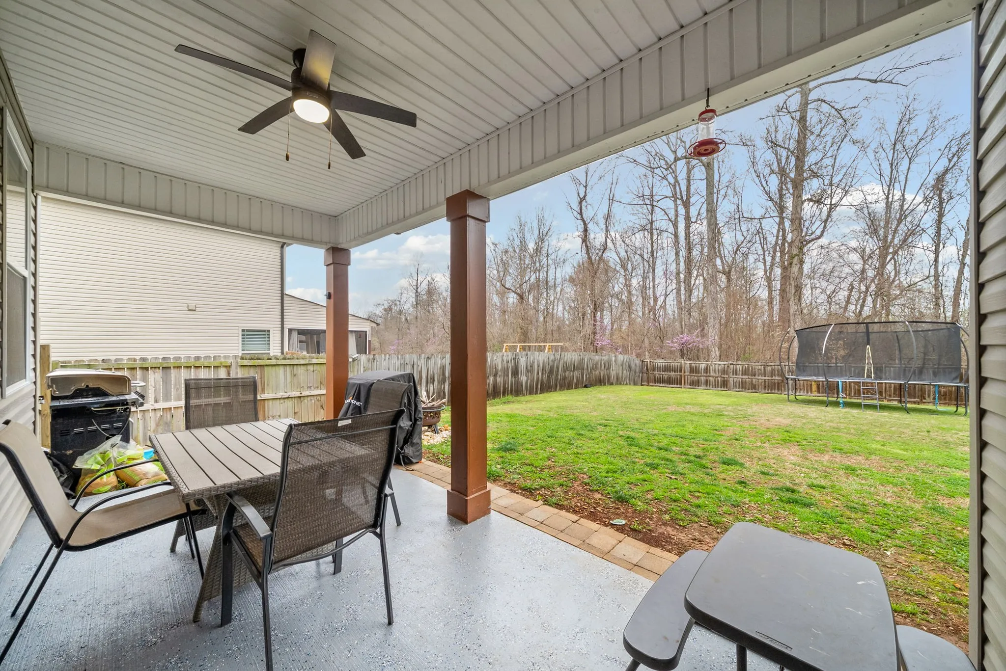 Step outside to enjoy the expansive fenced backyard, with a lot extending approximately 370 feet, well into the tree line—offering added privacy and room to roam on nearly half an acre.