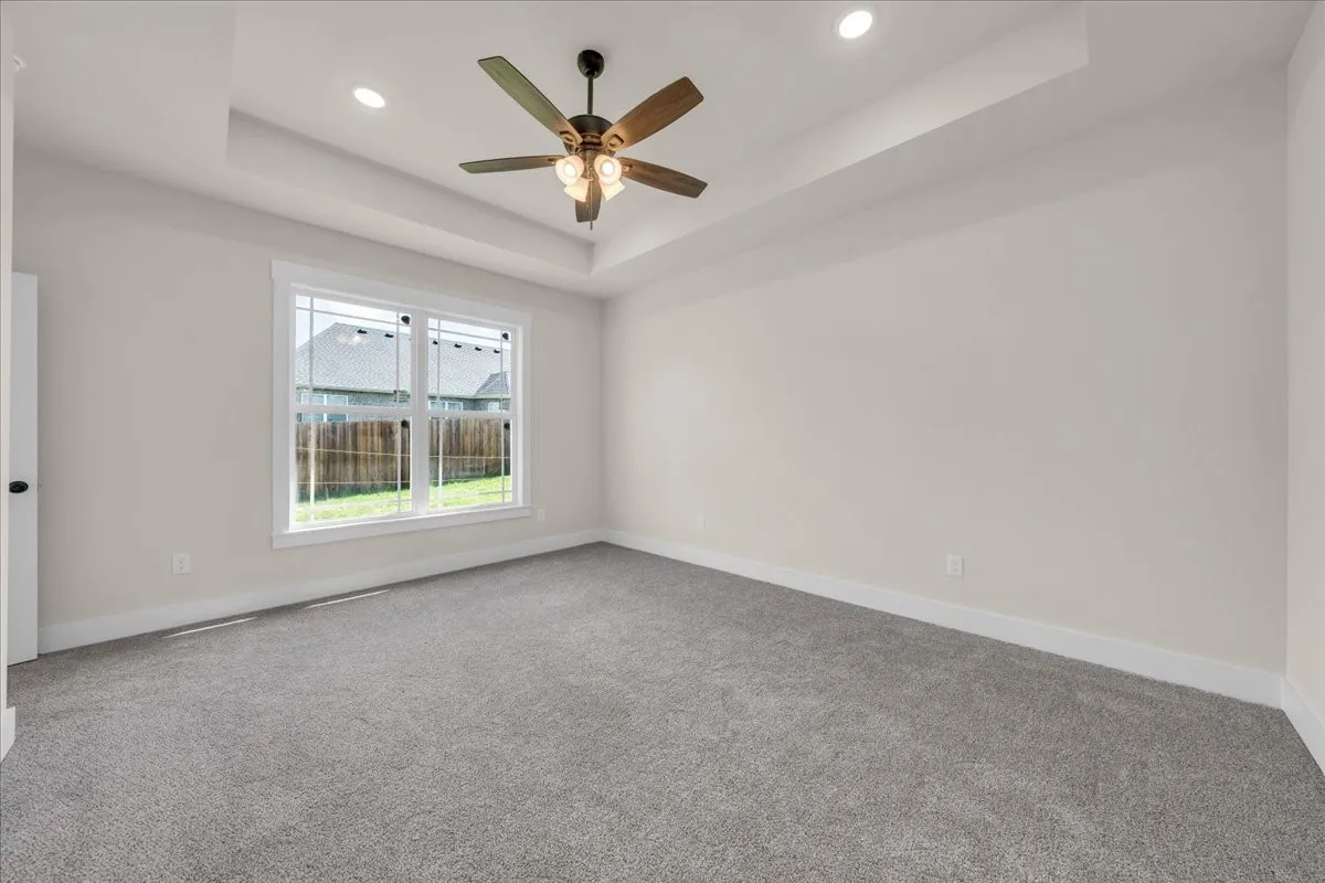 The primary suite offers a true retreat with a large tile shower, soaking tub, and generous walk-in closets. Ceiling fans in all bedrooms provide year-round comfort, while the gas range, tankless gas water heater, and gas furnace deliver efficiency and performance.