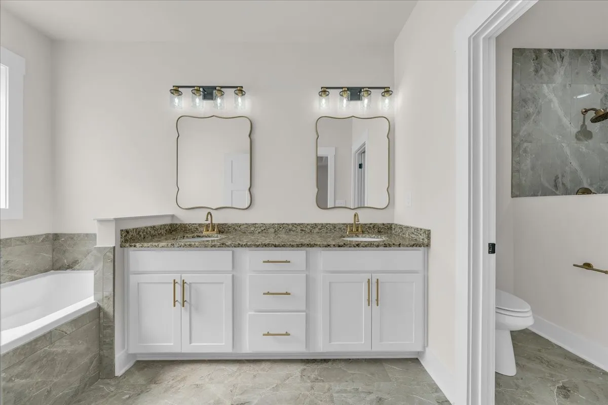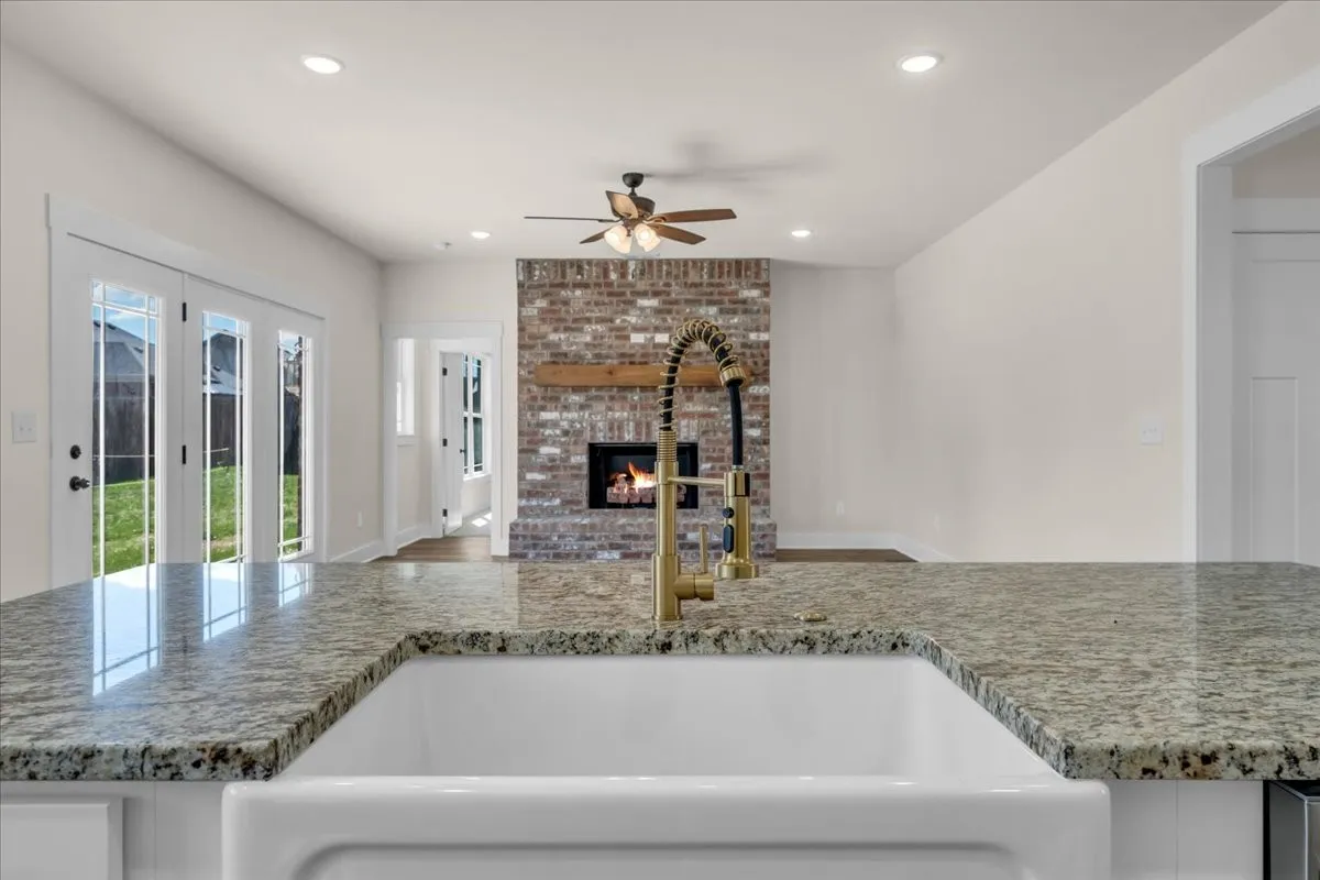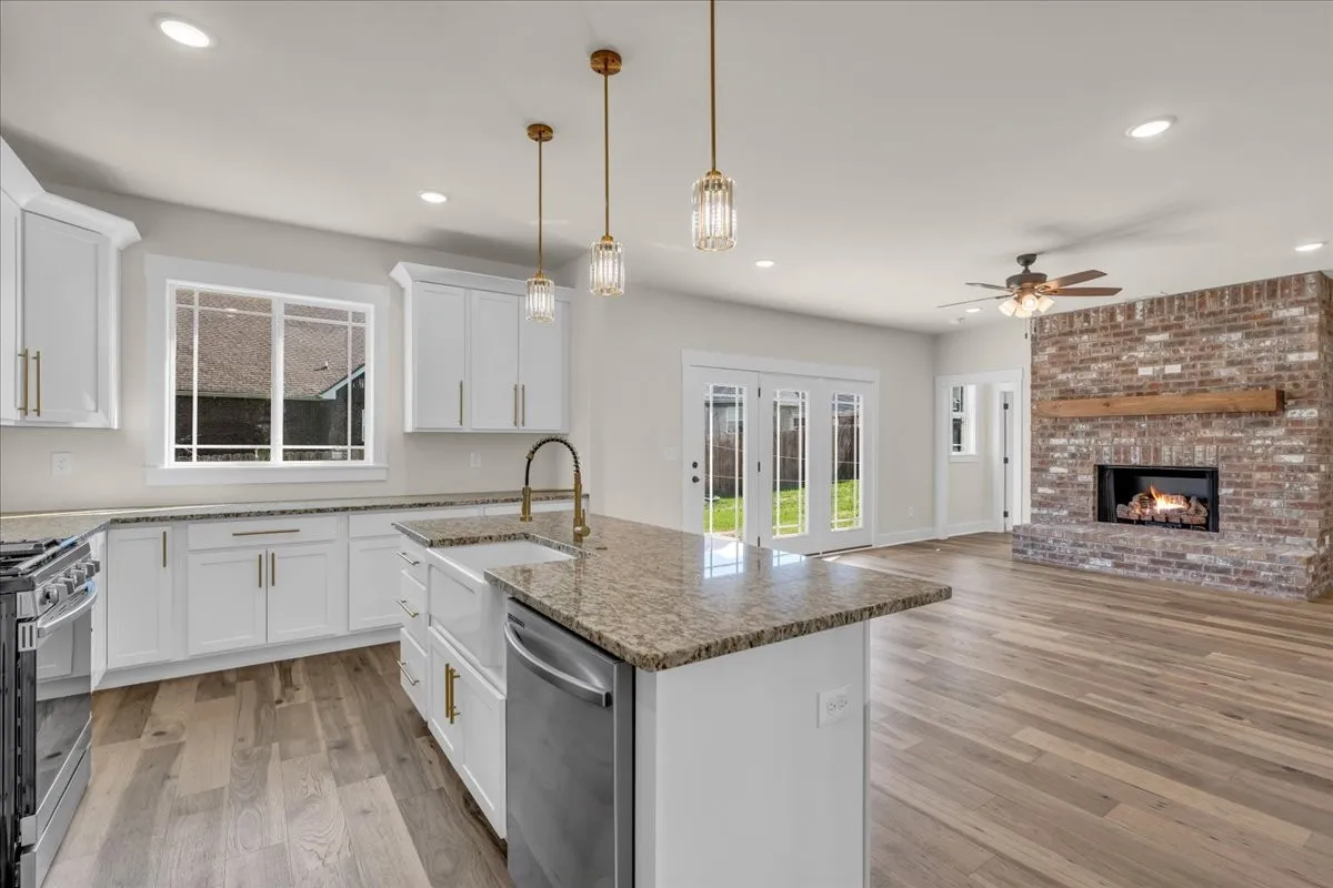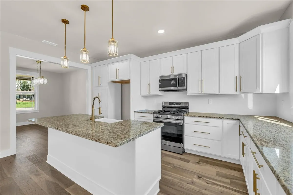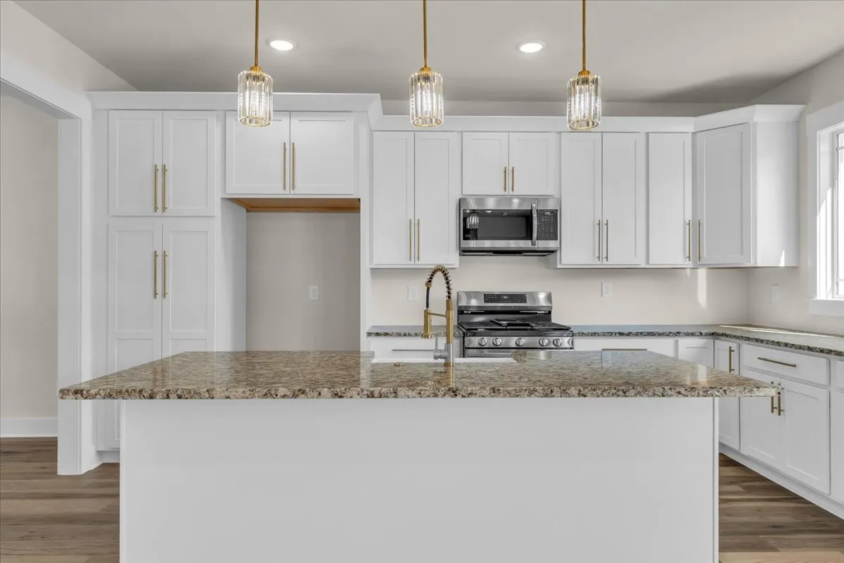 The kitchen showcases hand-selected granite countertops, a classic apron-front farmhouse sink, luxury gold cabinet hardware, and upgraded light fixtures that elevate the home’s overall feel. An oversized laundry room adds everyday convenience, while ample storage throughout the home ensures everything has its place.