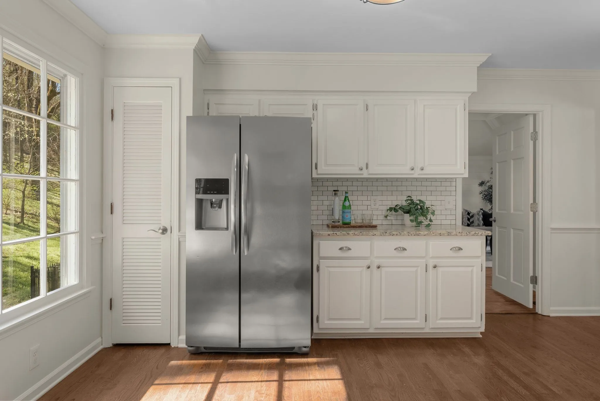 Inside, you’ll find fresh interior and exterior paint, sand-and-finish hardwood floors, updated lighting, and a warm fireplace anchoring the living space. The updated kitchen features granite countertops, a gas cooktop, stainless double ovens, and abundant natural light.