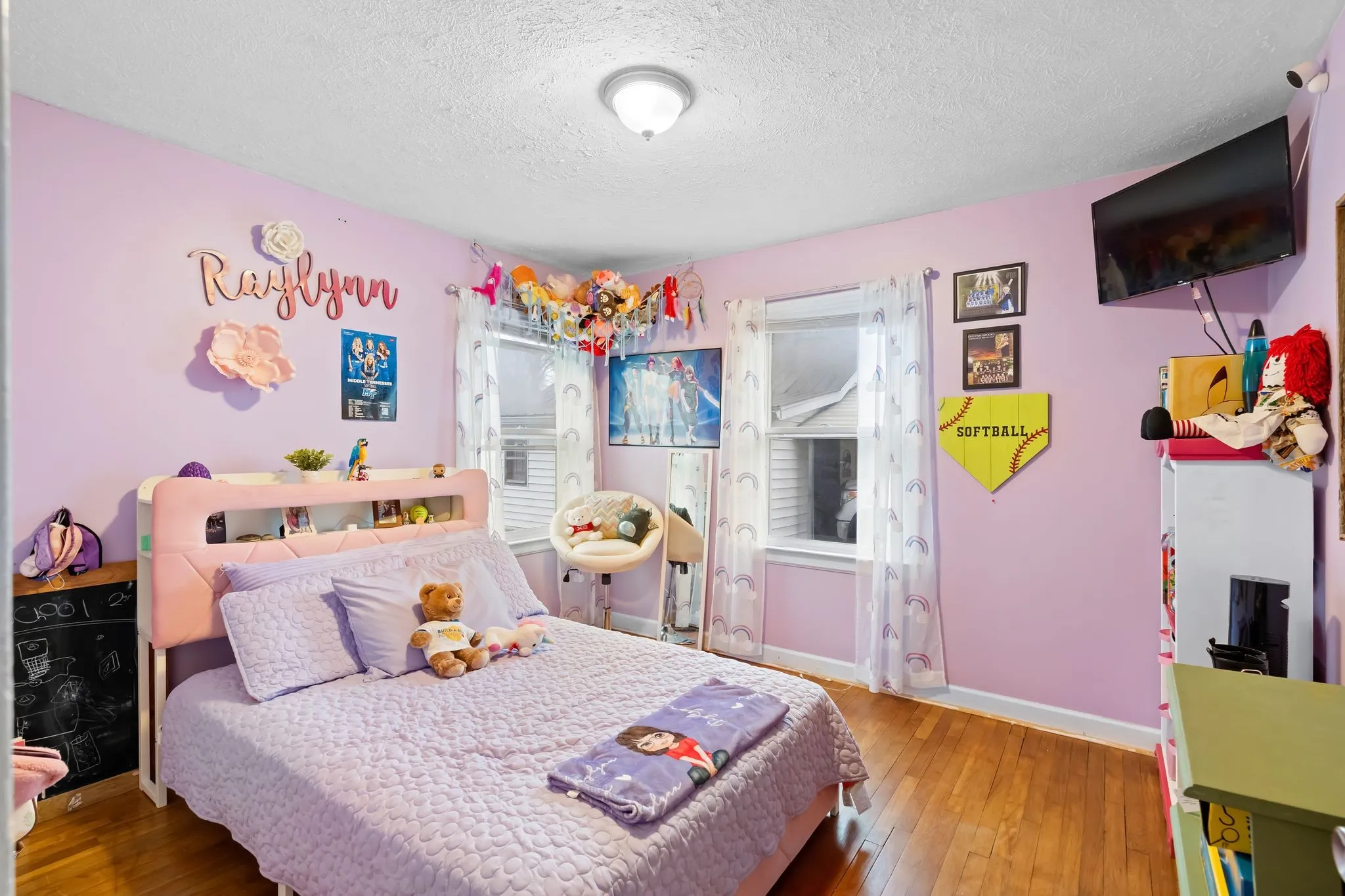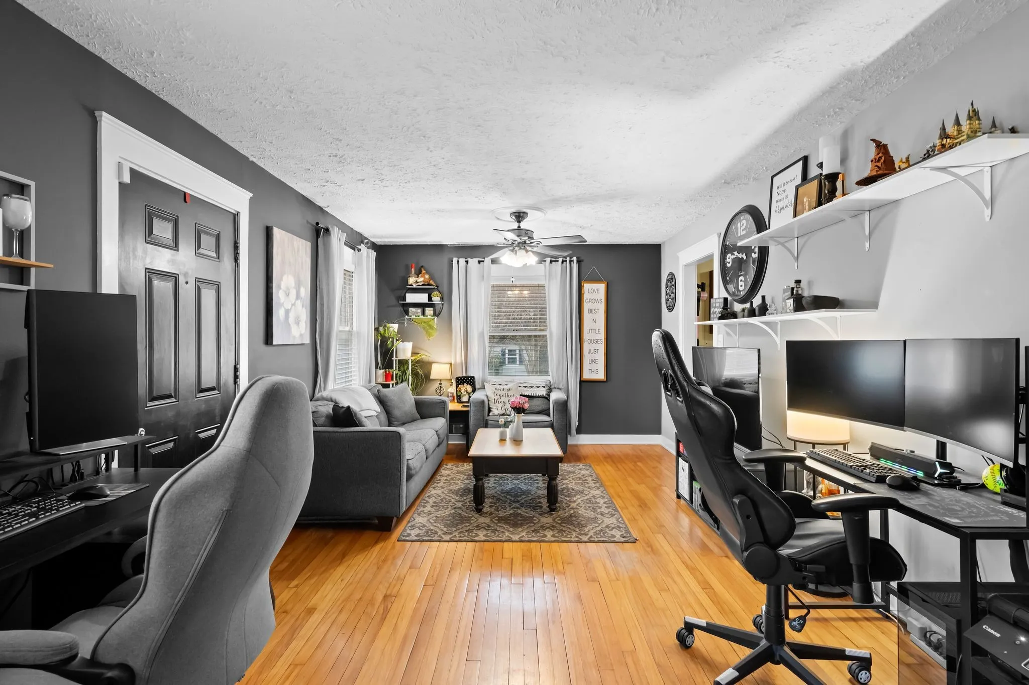 Inside, the bright living room features original hardwood floors and large windows that fill the space with natural light. The flexible layout allows for relaxing, entertaining, or creating a dedicated home workspace.