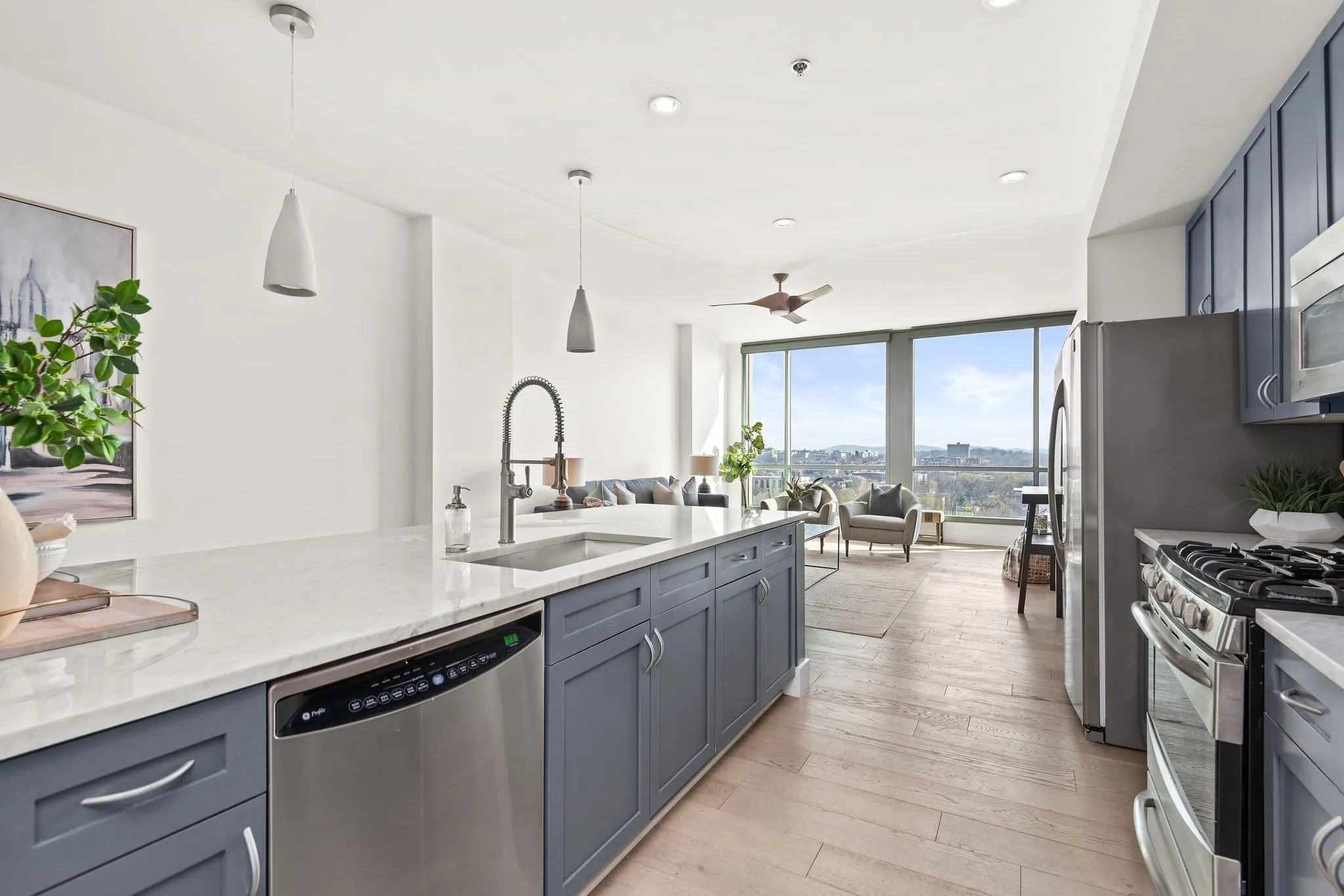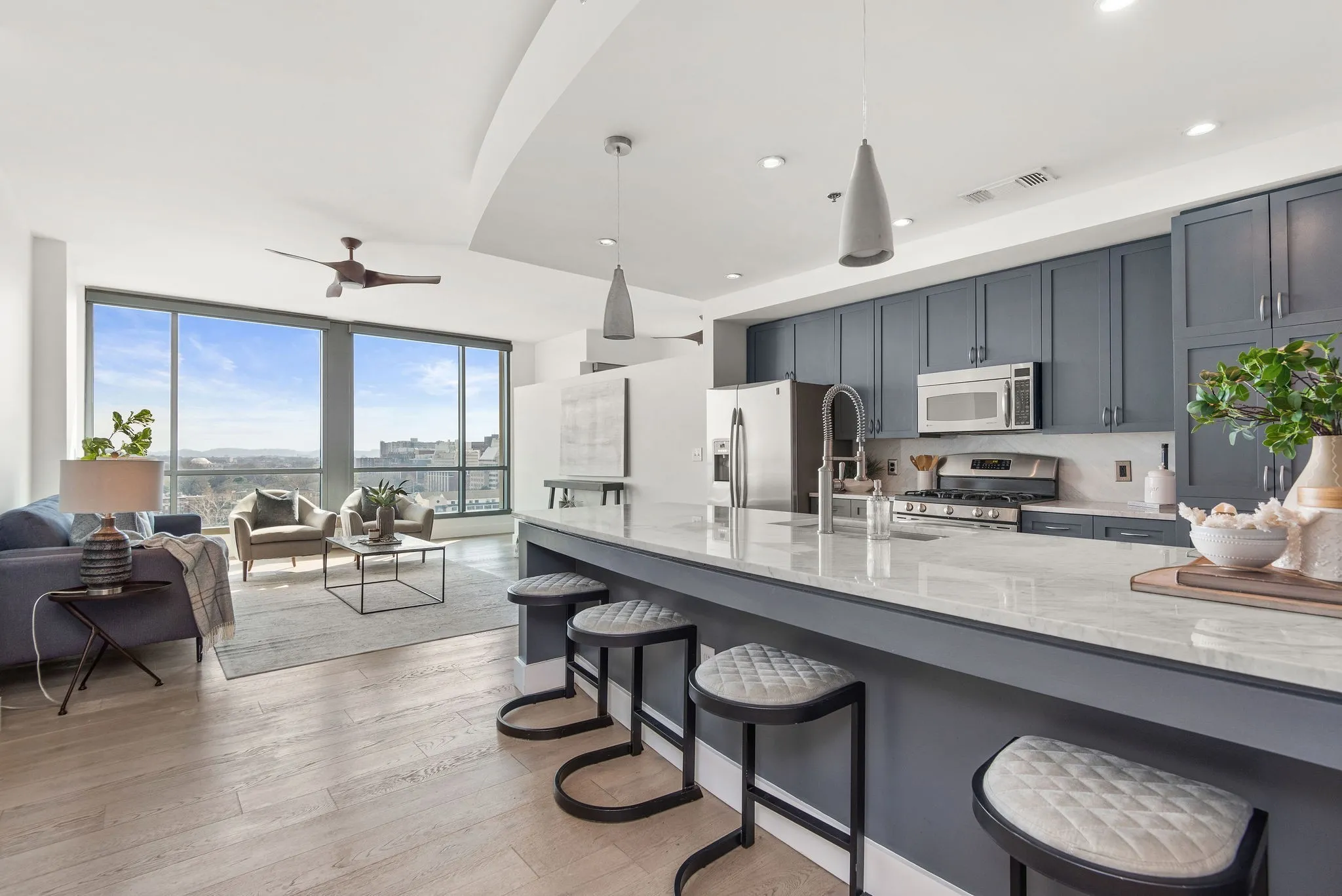This move-in ready home features floor-to-ceiling windows with automated blinds, new flooring, granite countertops, and refined finishes throughout. Step onto your private balcony to enjoy sweeping views of the Tennessee hills and twinkling lights.