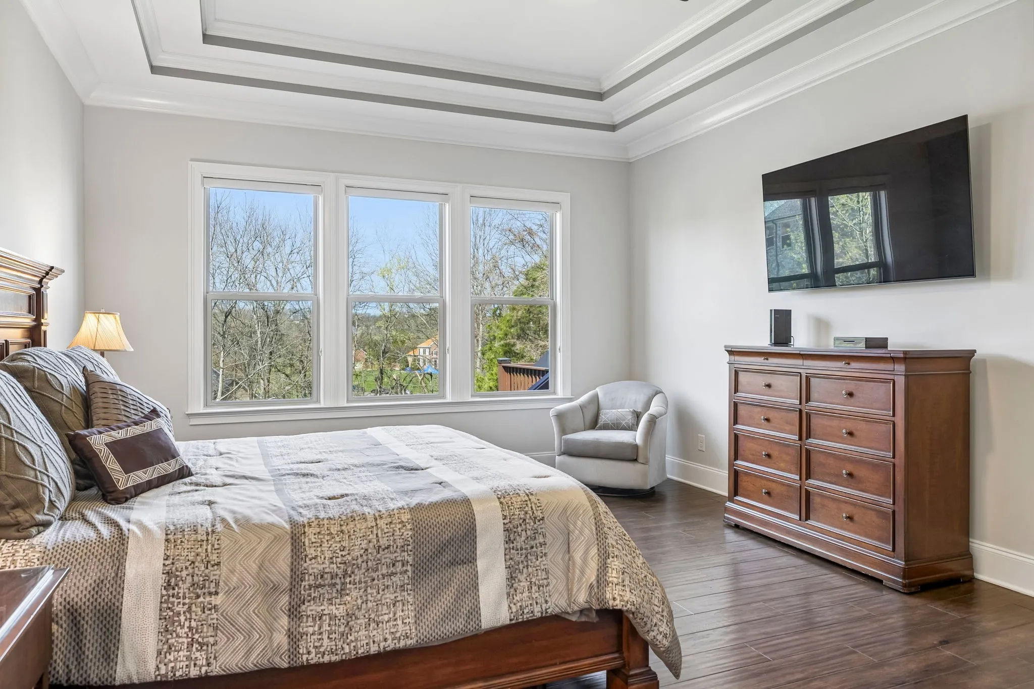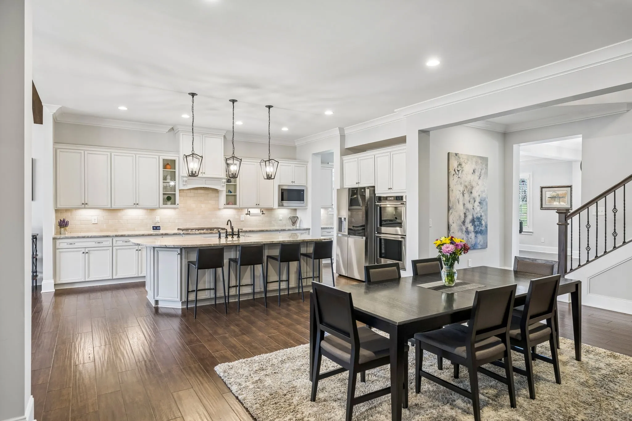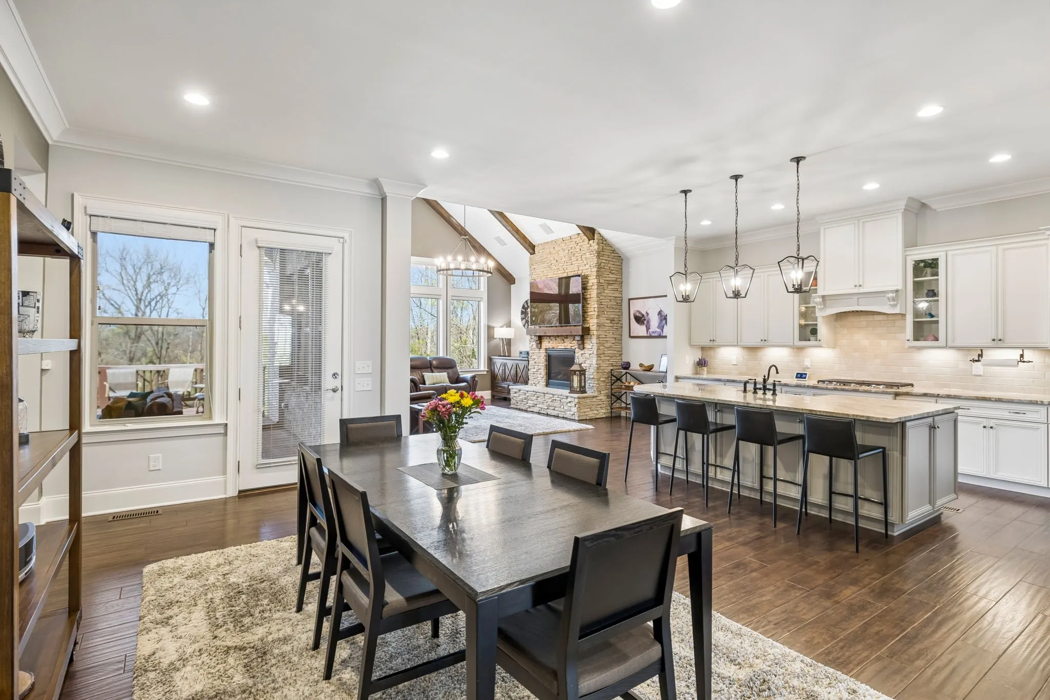 Stately home situated on over 1.5 private acres. Impeccably maintained with incredible upgrades and attention to detail. The home features open living spaces highlighted by a beamed vaulted ceiling in the den, a stone gas fireplace, and a wall of windows overlooking the pristine backyard. Beautiful hardwood flooring throughout the main living areas with custom plantation shutters on the front of the home and Duolite Silhouette blinds on the back. The gorgeous kitchen is well appointed with granite countertops, tile backsplash, double ovens, a farmhouse sink, and is complemented by a wonderful butler’s pantry with wine rack and beverage cooler. The spacious primary suite offers lots of natural light, an organization alcove or coffee bar, and an oversized soaking tub and separate shower in the primary bath. The incredible laundry room offers abundant cabinetry and space for a full-size refrigerator. Need an office? This home office features French doors and a beautiful coffered ceiling, providing an elegant work-from-home space. Upstairs, the large bonus room is complete with a wet bar and beverage cooler. New gas water heater recently installed. The outdoor living is just as impressive as the indoor. The covered back porch features a motorized retractable screen and opens to a large deck overlooking the beautifully maintained backyard. A new roof was installed in July, 2025, and there’s extensive landscaping with a 19-zoned irrigation system to keep landscaping looking lush. A 4-plank black fence was installed along the south side of the backyard. The garages have an epoxy flooring, utility sink, and custom cabinetry. There’s incredible storage space under the deck where all the lawn equipment can be stored. Large side yard with additional privacy provided by adjacent HOA-owned space, This exceptional property offers space, privacy, and high-end upgrades throughout. Please see the photo gallery for specific details noted under each photo.