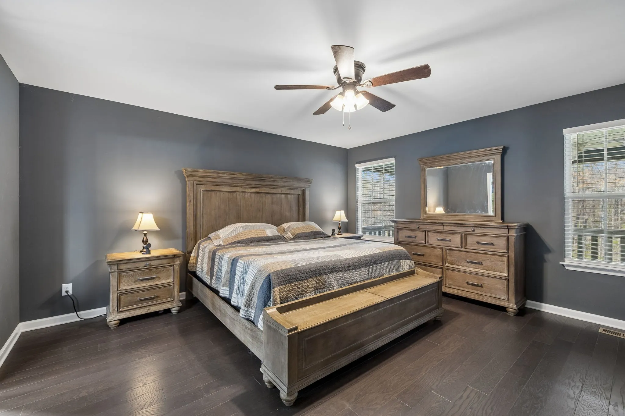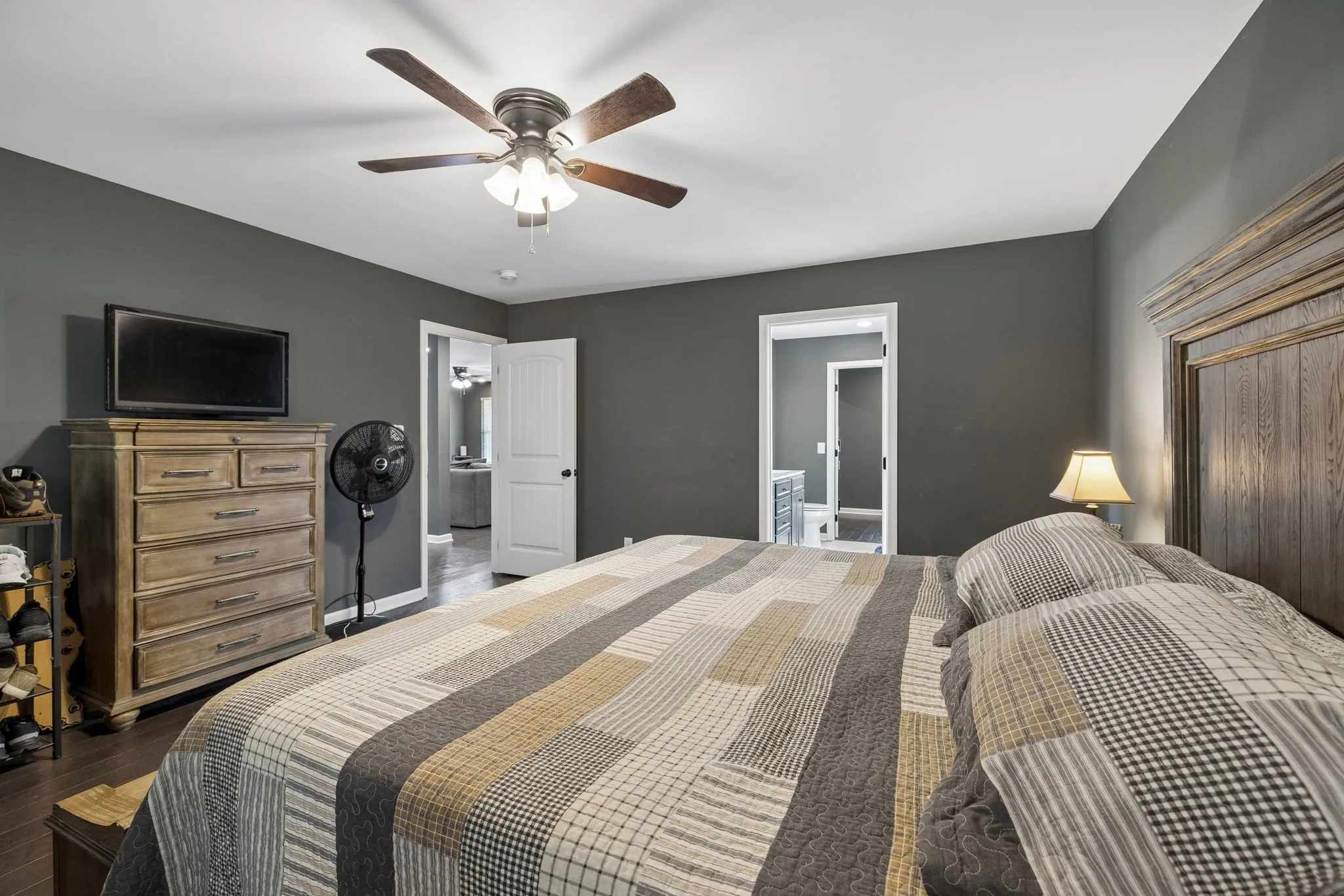 The large primary suite offers a private retreat with a spa-like bathroom complete with a soaking tub, separate shower, and a spacious walk-in closet. Two additional generously sized bedrooms provide flexibility for guests or a home office.