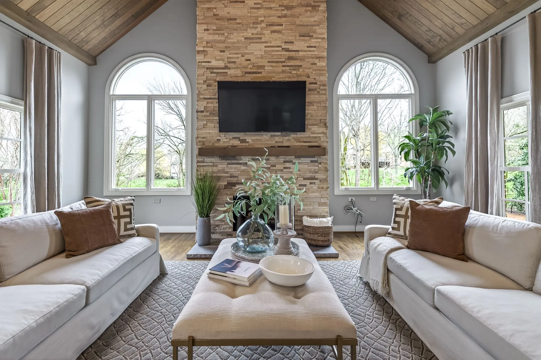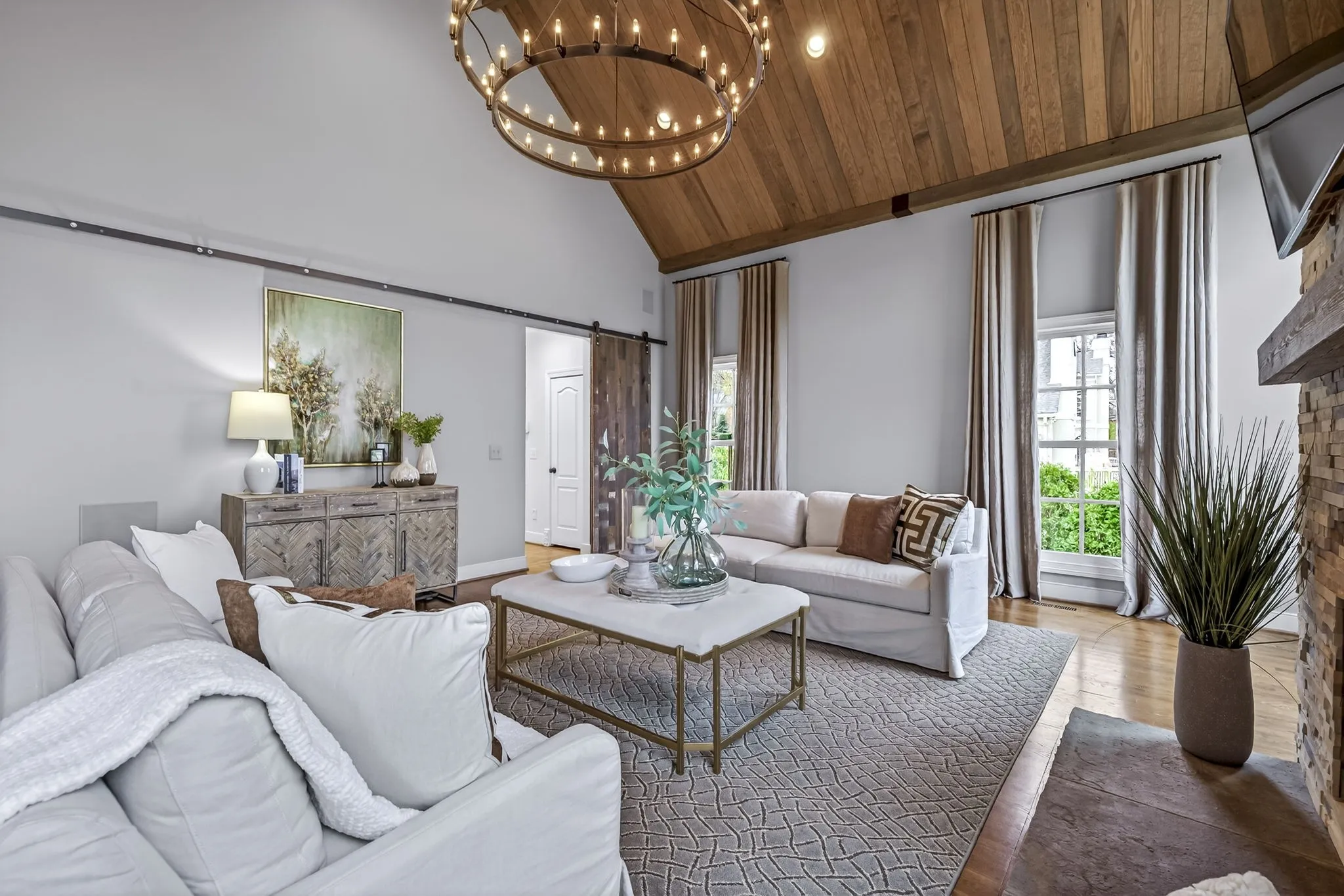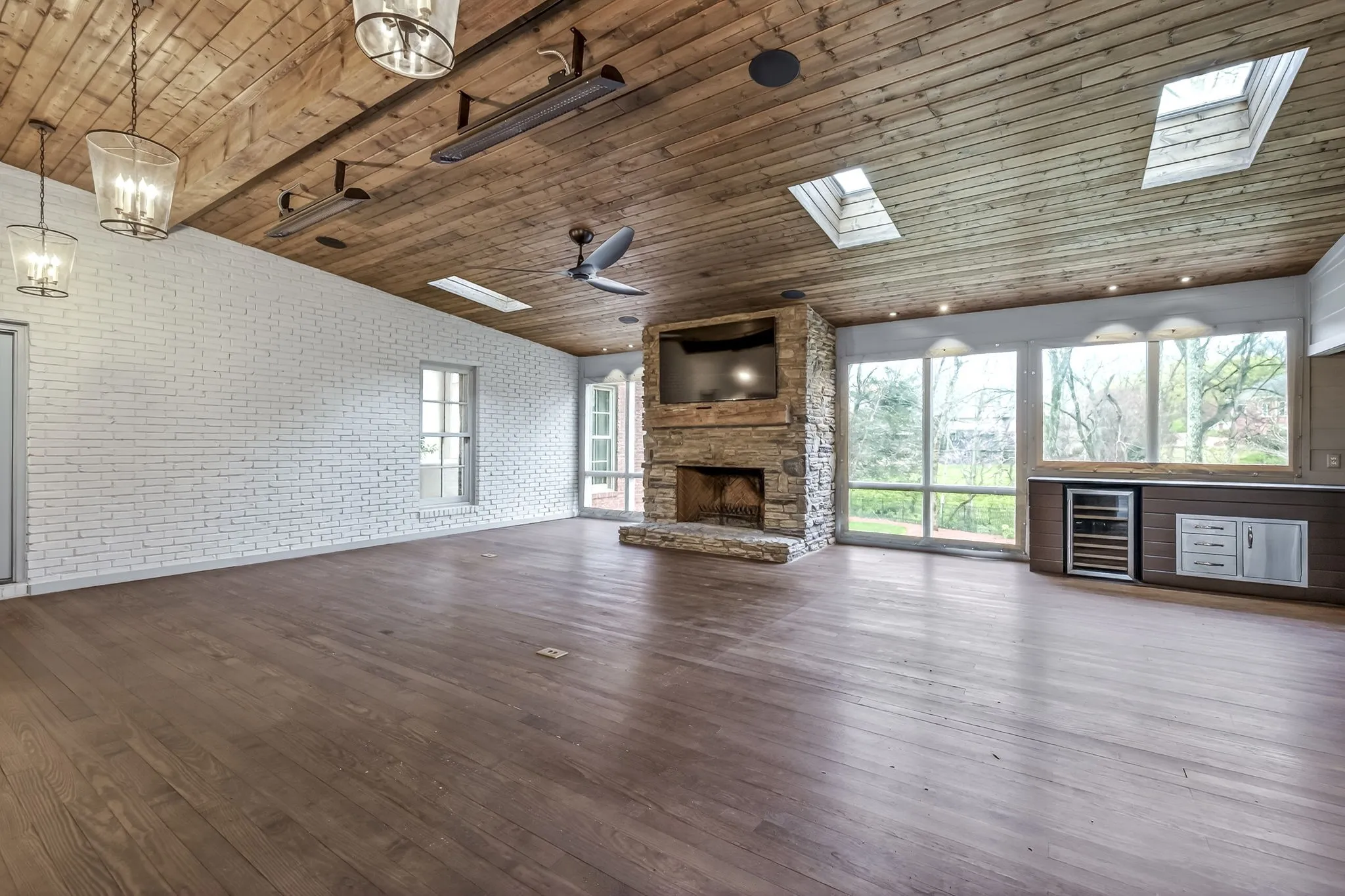 The stunning great room showcases a dramatic floor-to-ceiling stone fireplace and vaulted wood-plank ceiling, while an additional fireplace adds warmth and character to the formal living room. Step outside to the screened-in covered back porch, where you’ll find yet another fireplace, along with a built-in gas grill and beverage cooler—perfect for year-round outdoor living.