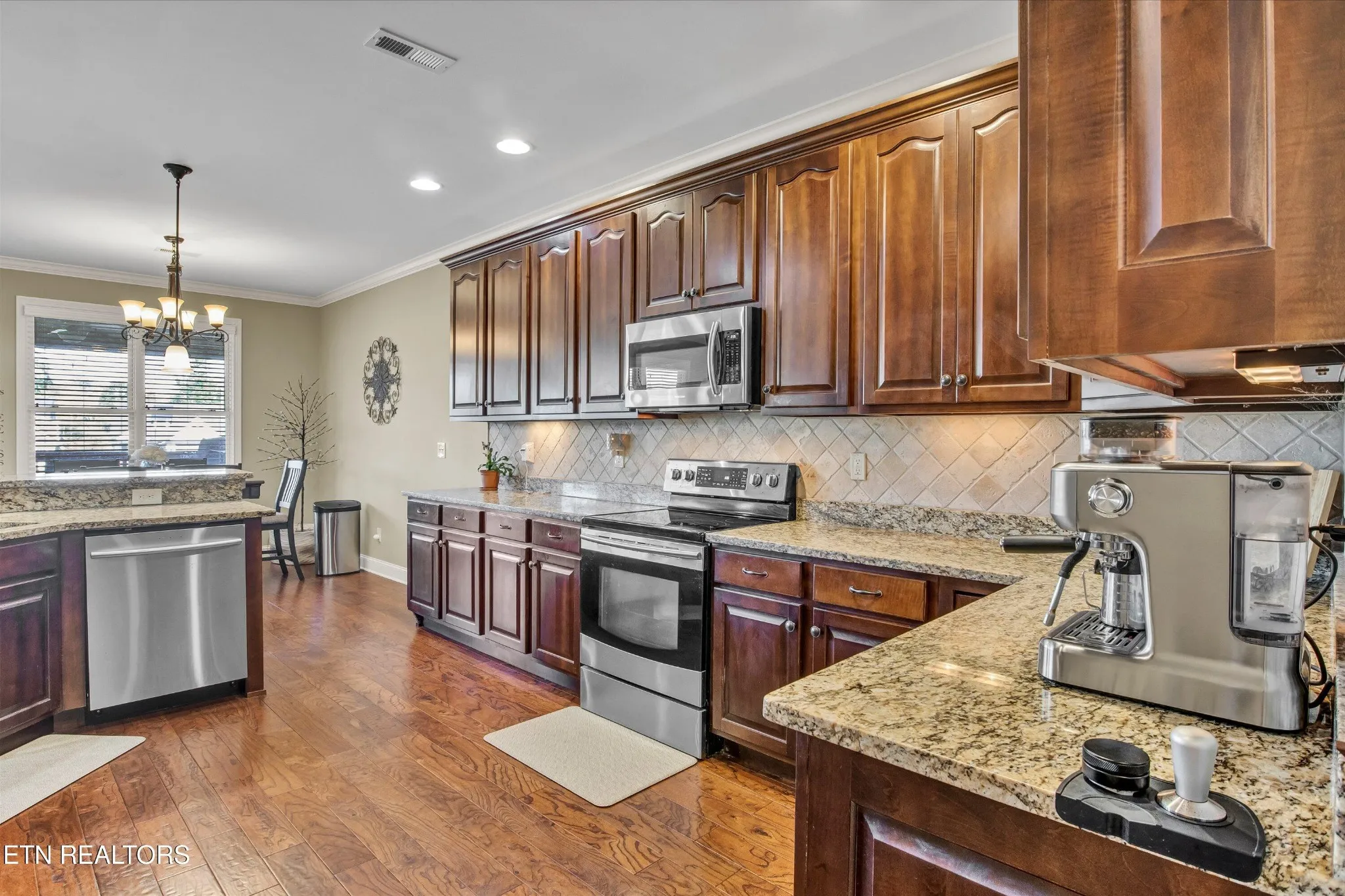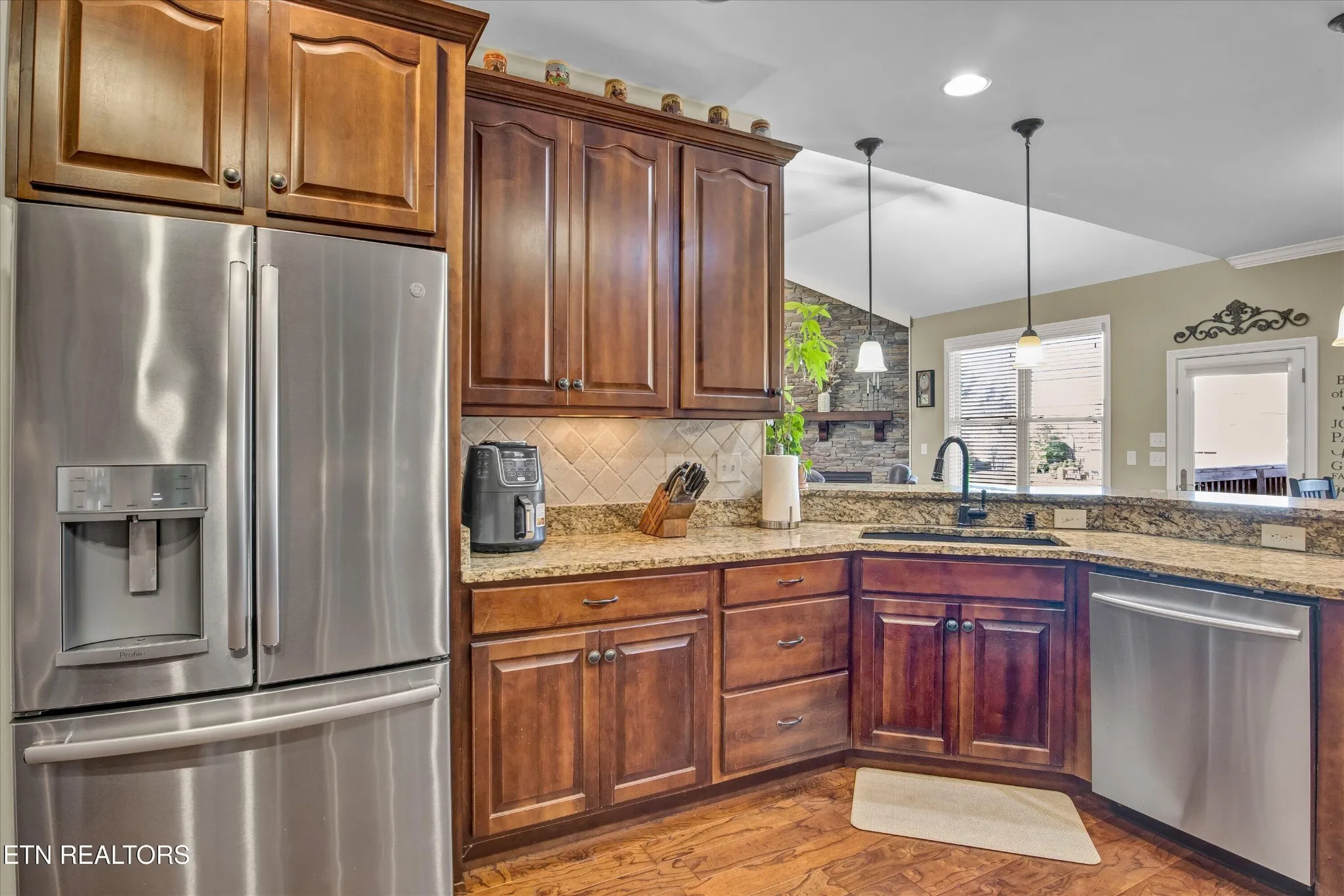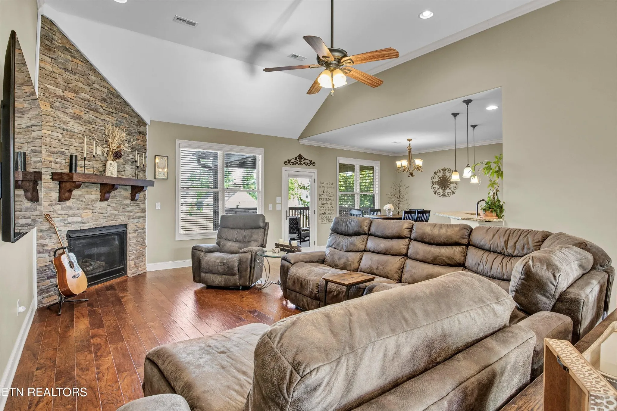 The open-concept layout centers around a spacious living room featuring a striking floor-to-ceiling stone fireplace, creating the perfect gathering space. Just beyond, the kitchen offers abundant wood cabinetry with granite countertops, stainless steel appliances, and a bright breakfast area ideal for casual dining. A formal dining area, filled with natural light from an oversized window, provides a welcoming space for hosting.