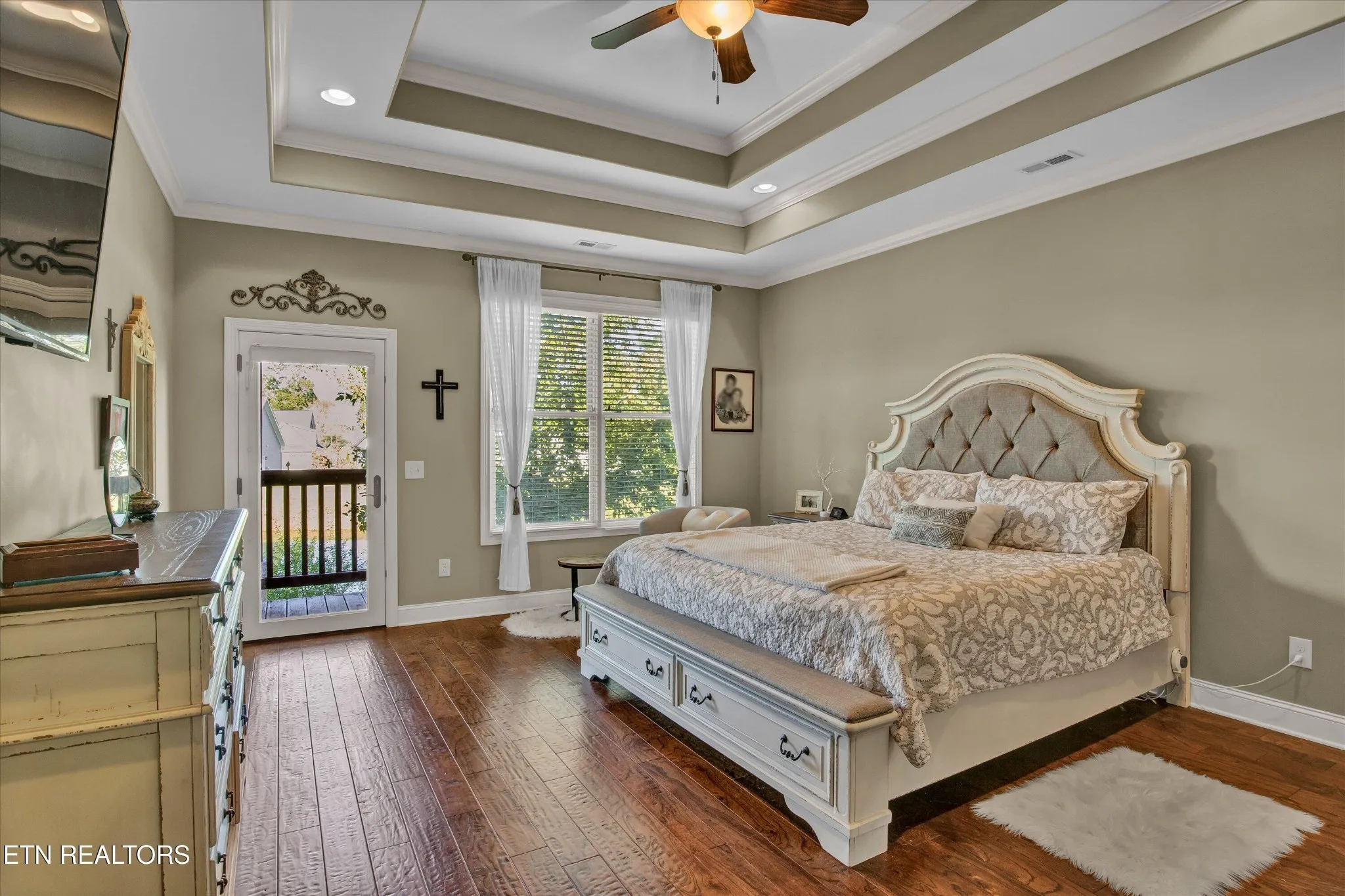 The primary suite is a true retreat, complete with tray ceilings, an expansive walk-in closet, and a well-appointed ensuite featuring a tiled walk-in shower. Two additional bedrooms are thoughtfully positioned down the hall, sharing a full bath and offering comfortable accommodations for guests or family.