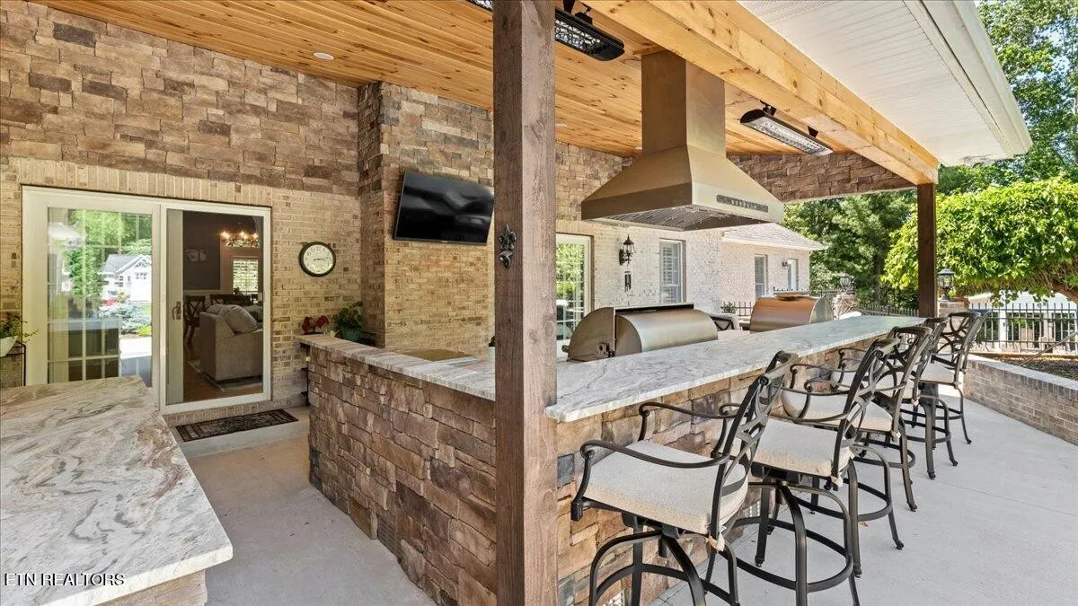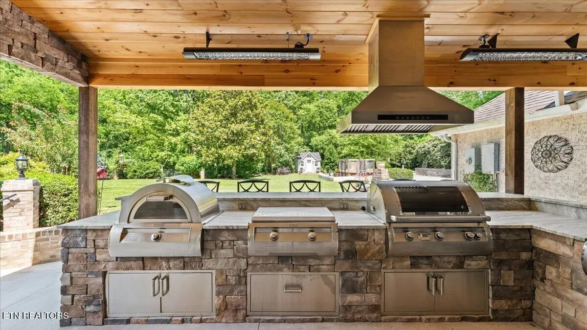 Step outside to your own private retreat, where a large sparkling pool takes center stage, creating a resort-like atmosphere for both quiet mornings and fun-filled afternoons. The covered patio offers a comfortable shaded space for dining and gathering, while the fully equipped outdoor kitchen is a dream for entertainers. It features premium Fire Magic appliances, including a professional-grade grill, built-in pizza oven, griddle, and power wok burner. With outdoor heaters and bar seating, this space is designed to be enjoyed year-round.